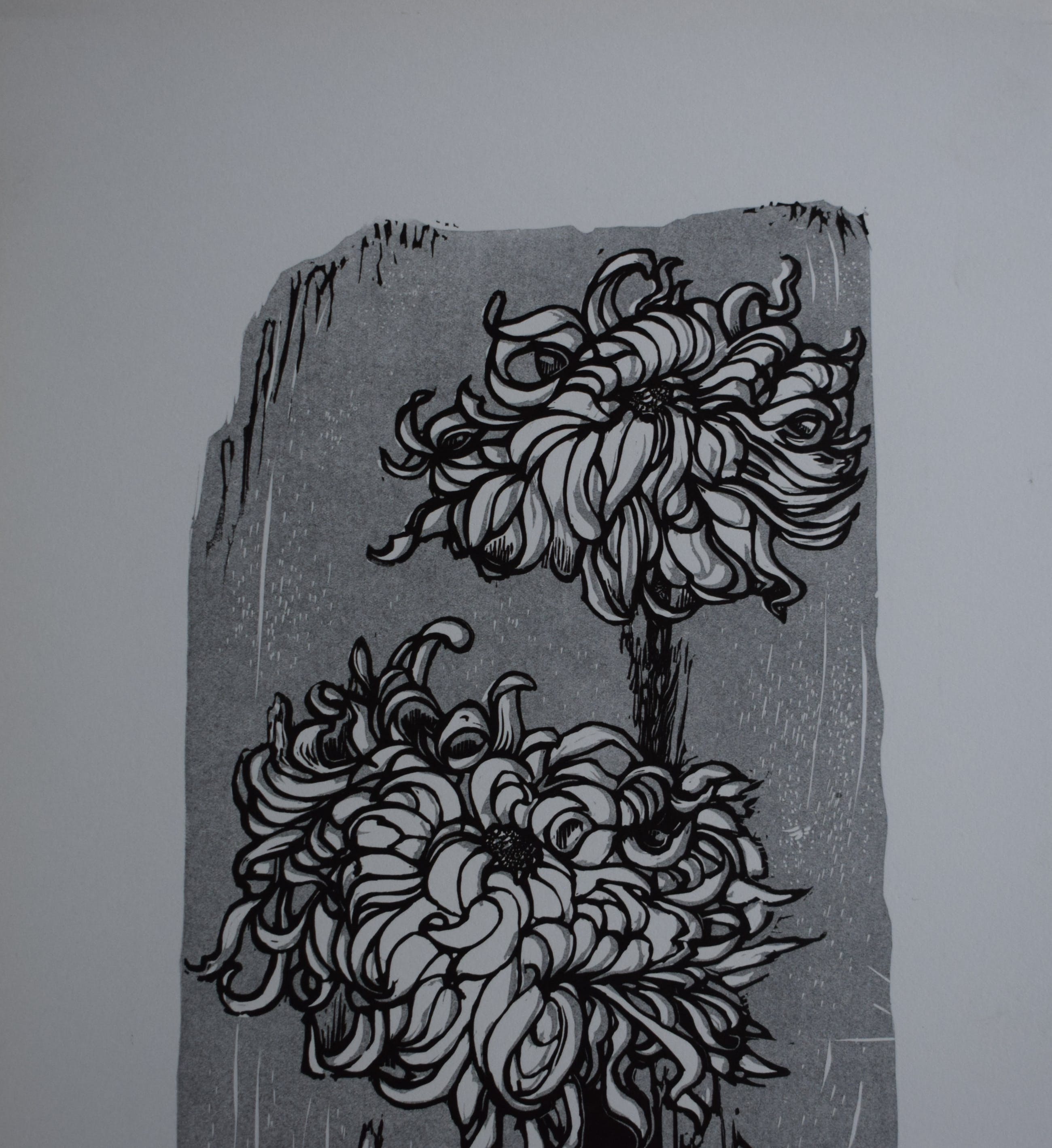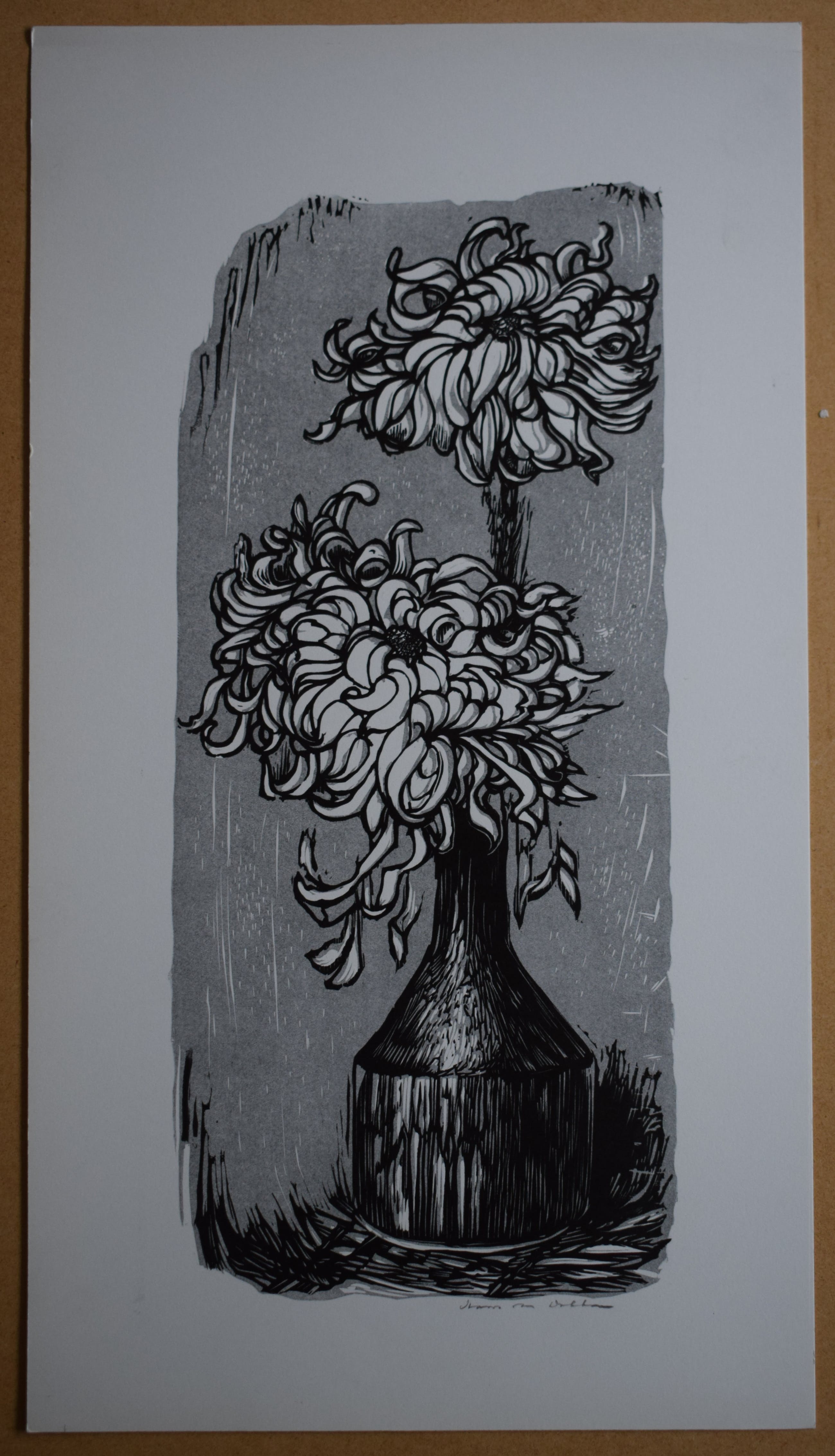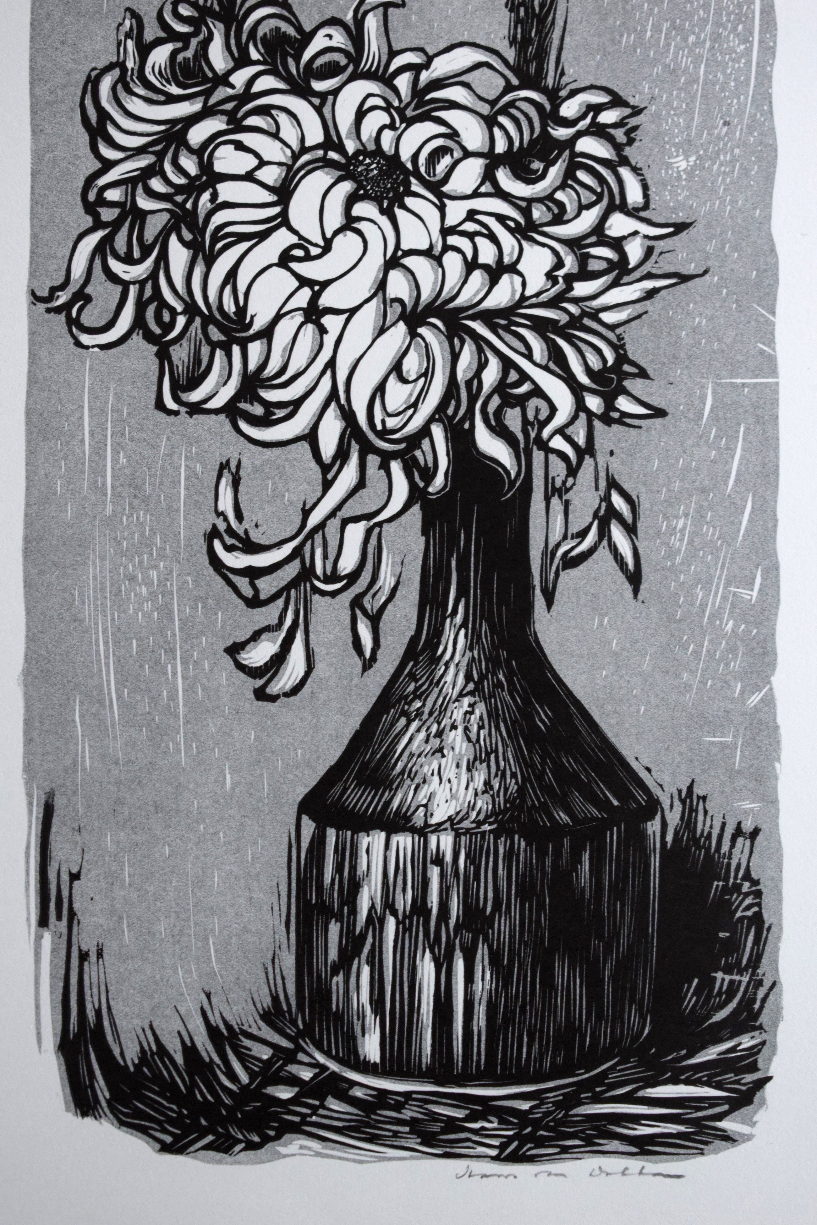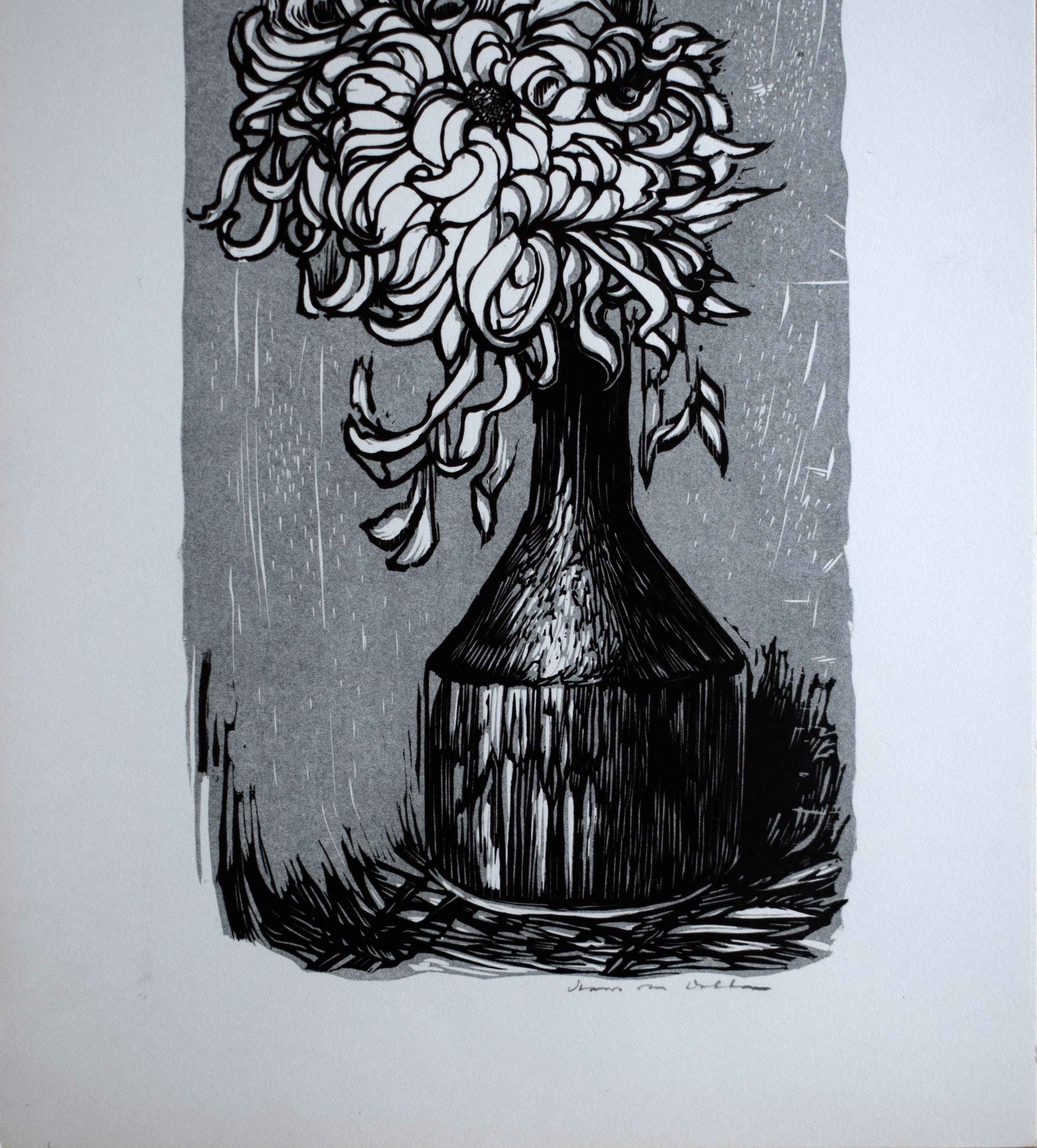 Litho van Hans van Dokkum, Een vaas met 2 Chrysanten, achtergrond grijs. Deze afbeelding bestaat ook nog in een blauwe kleur. De afbeelding is gedrukt op dik papier.