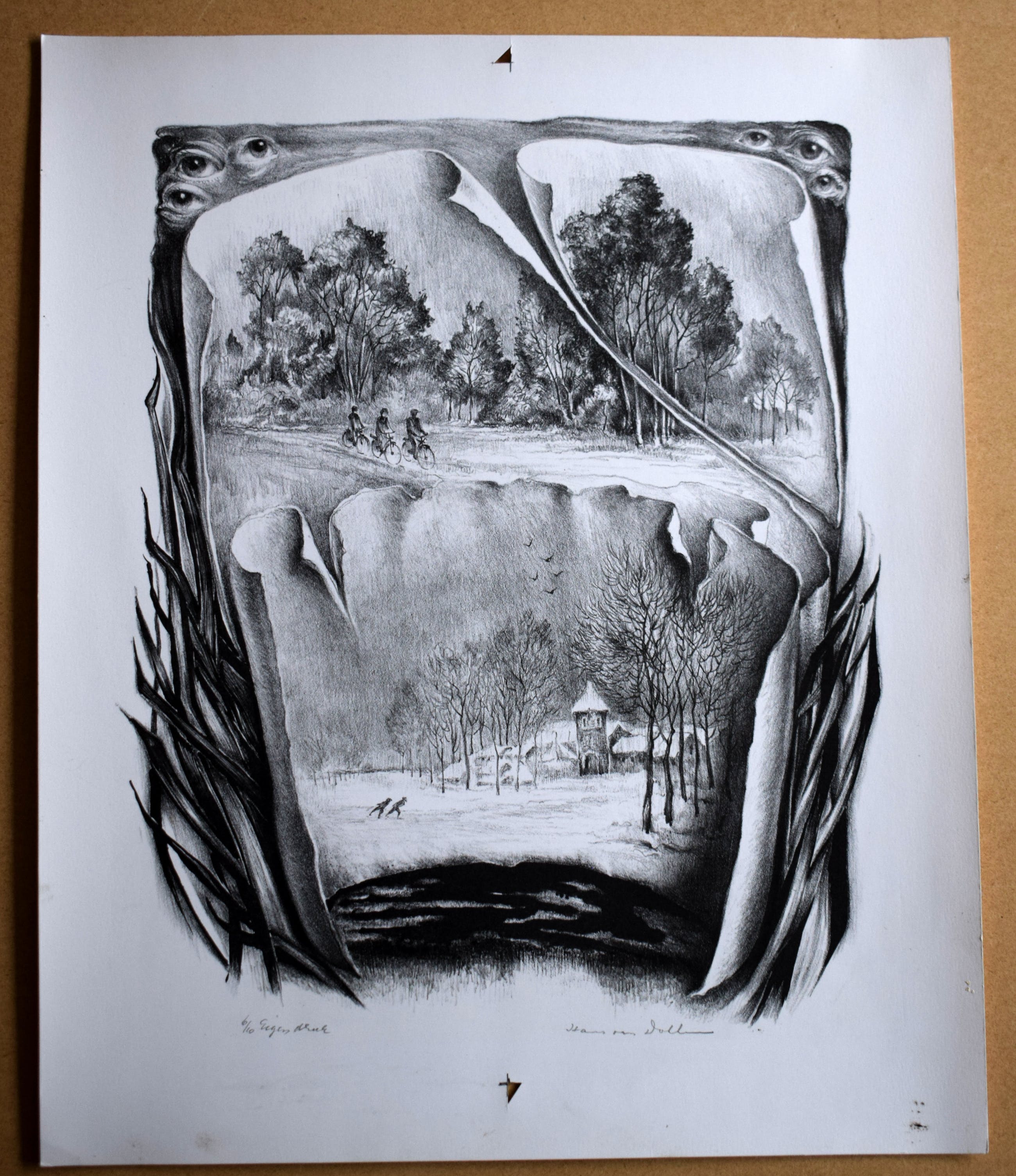 2 landschappen op perkament papier. de onderste is duidelijk een winters landschap met sneeuw en 2 schaatsers, de bovenste daarop zijn 3 fietsers te zien in een landschap dat voorjaar/ zomer of herfst kan zijn. Misschien zijn het verwijzingen uit zijn jeugd, omdat er ook een scheur in het papier zit. afgewerkt met 6 ogen aan de bovenkant en het gras aan de onderkant.