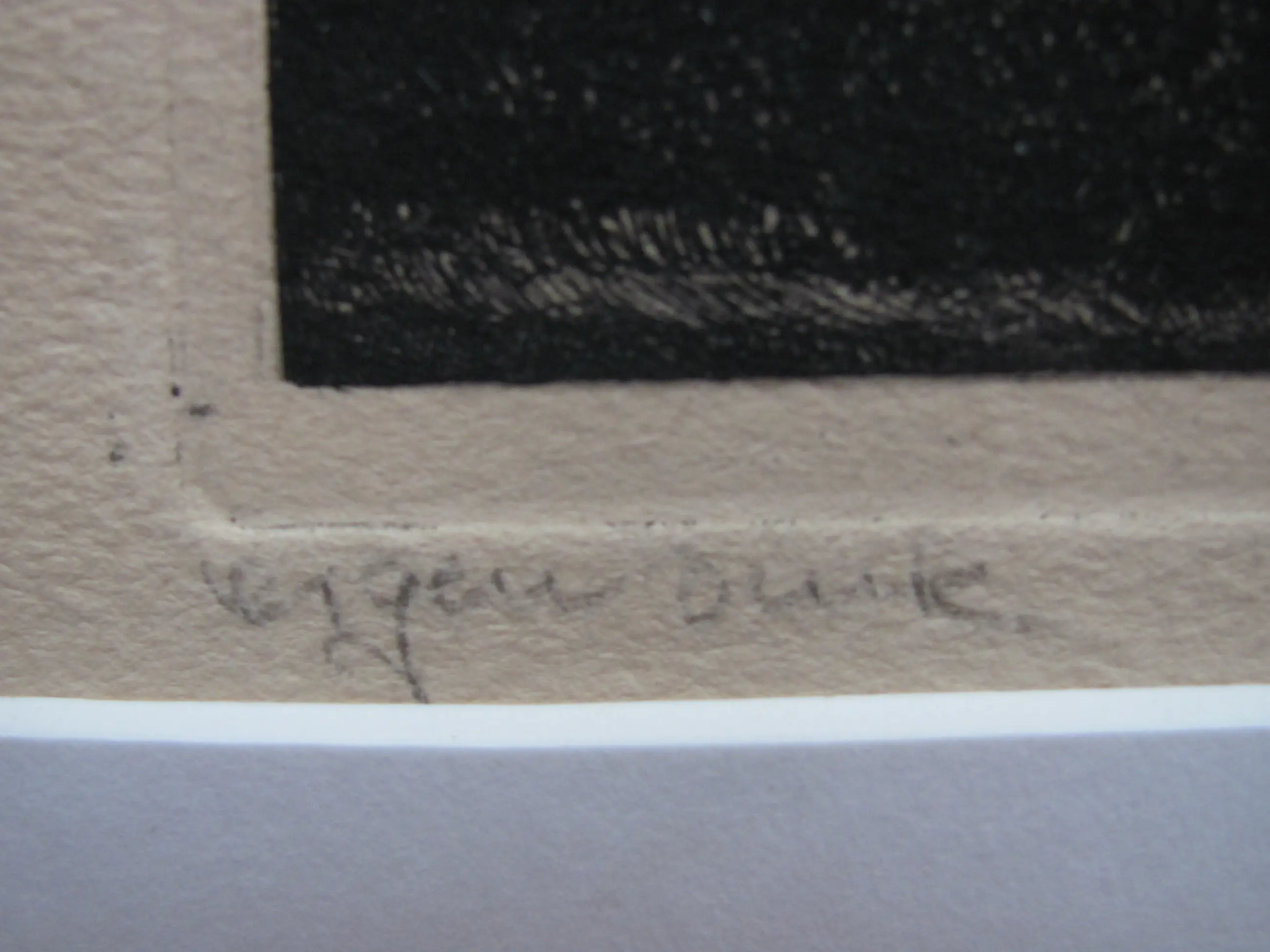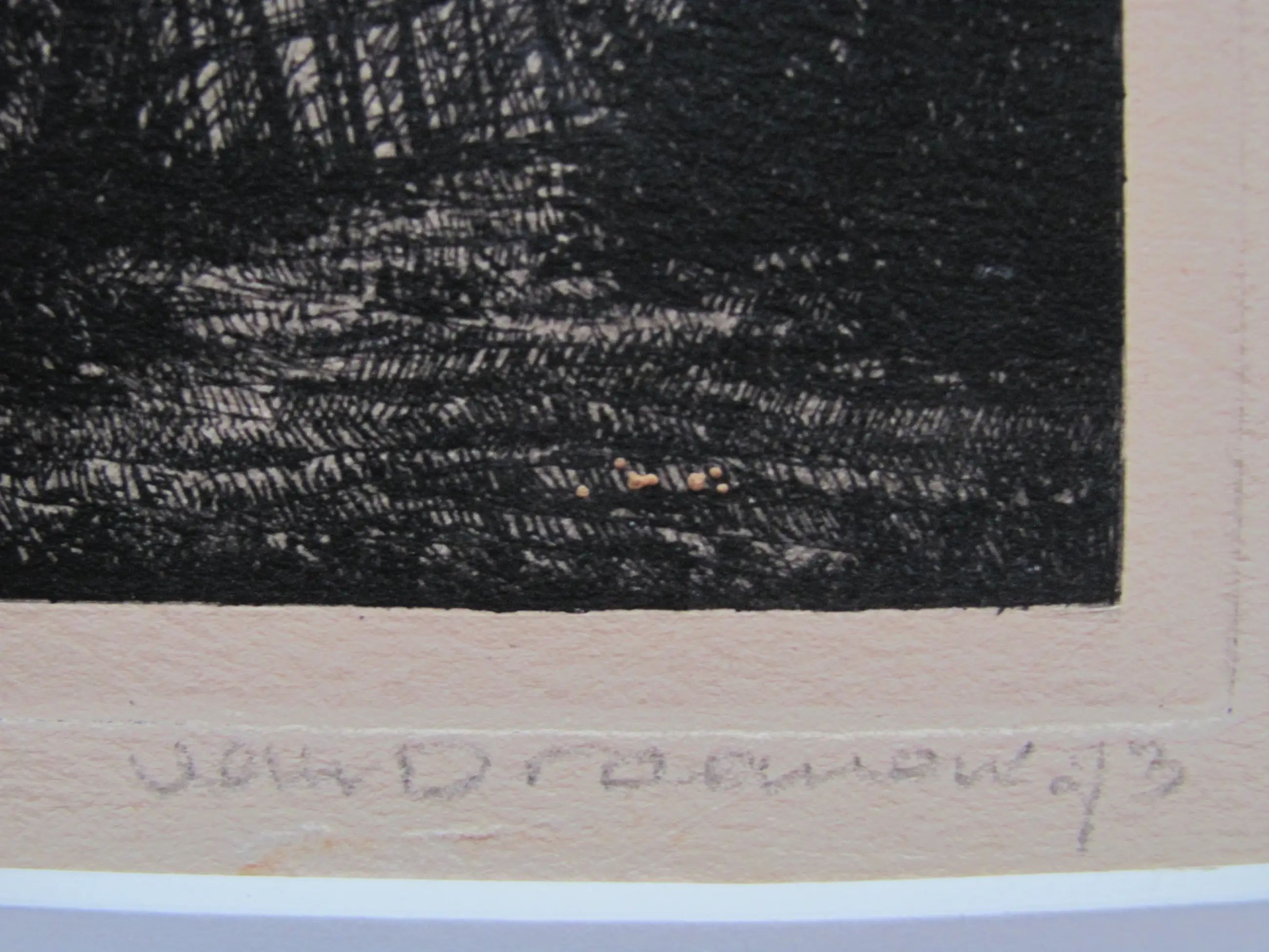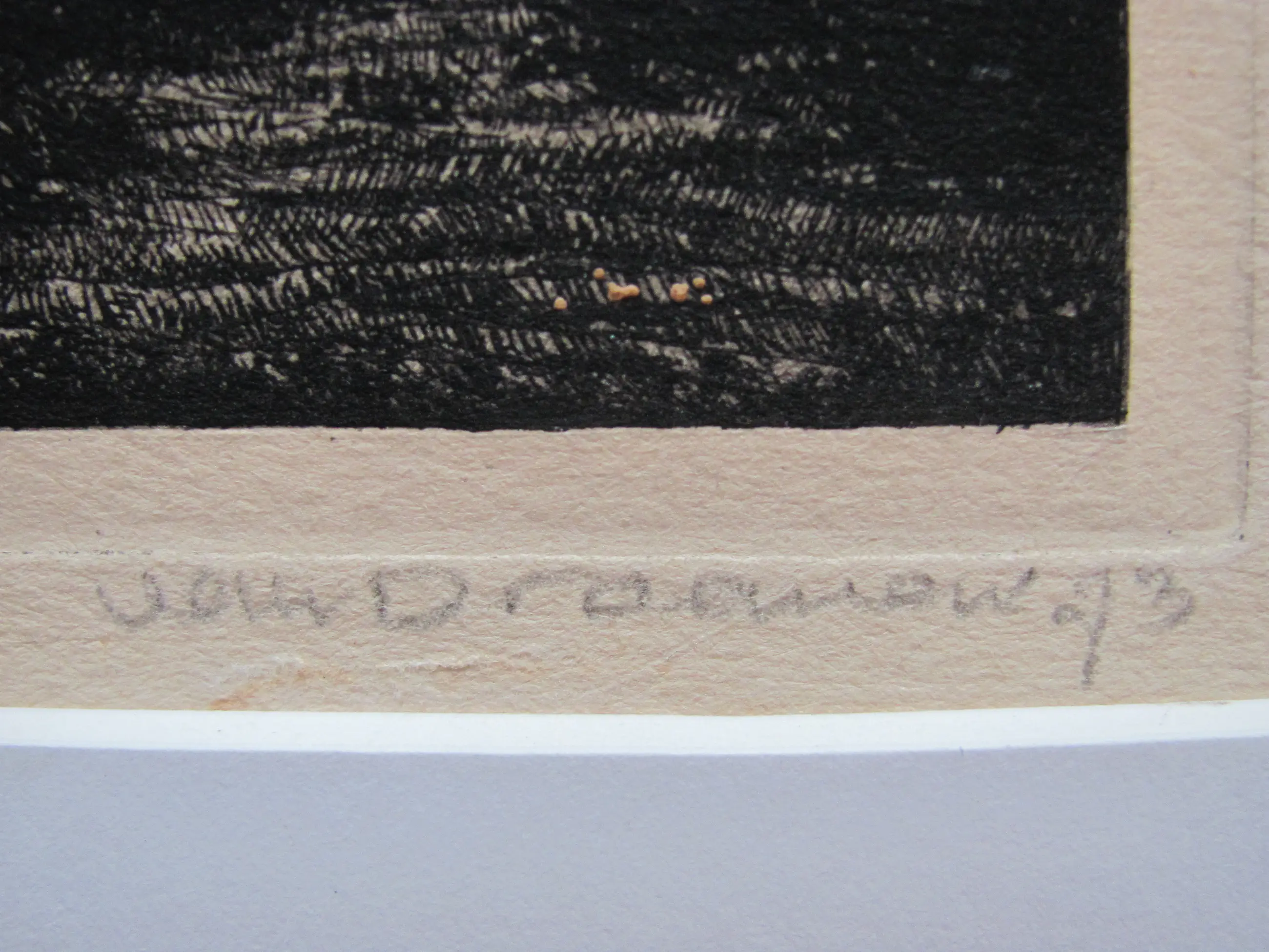 Ets van Hans van Draanen uit 1973. Linksonder in potlood: "eigen druk" Rechtsonder gesigneerd ("van Draanen) en gedateerd ('73).
