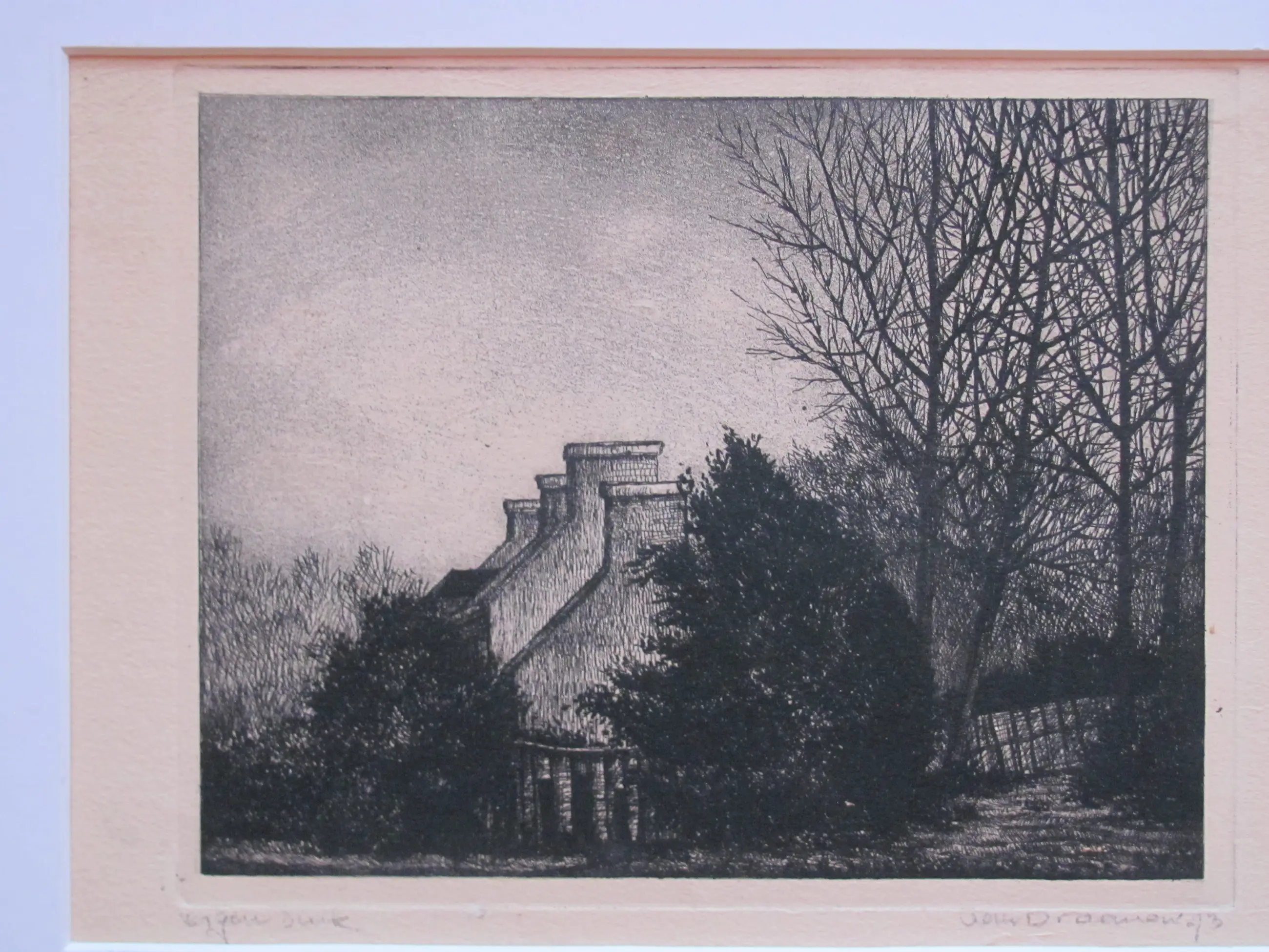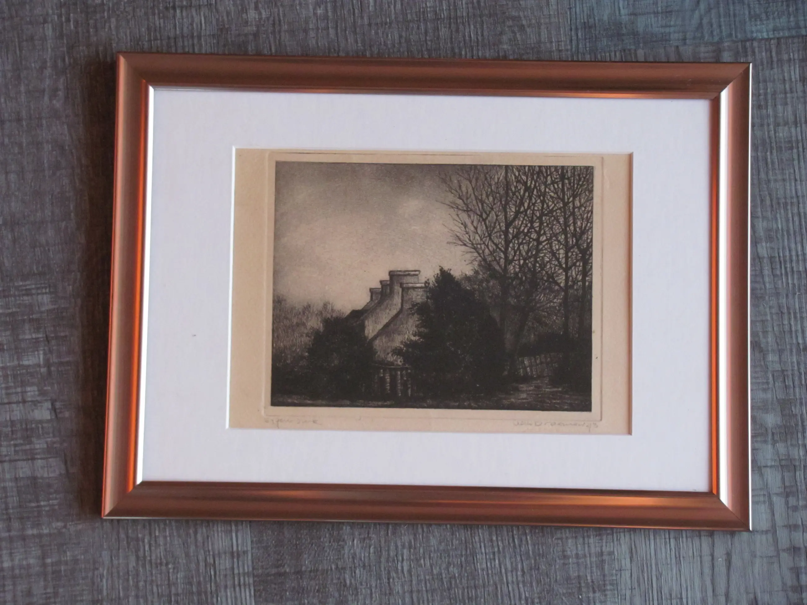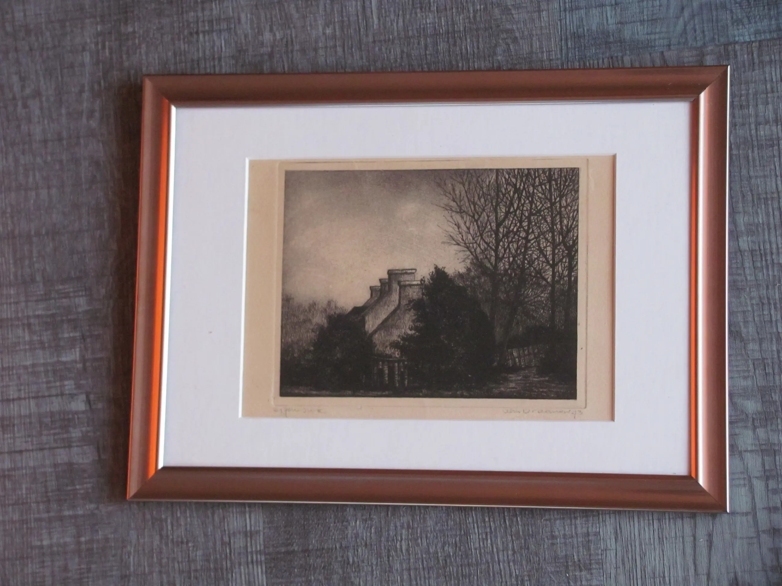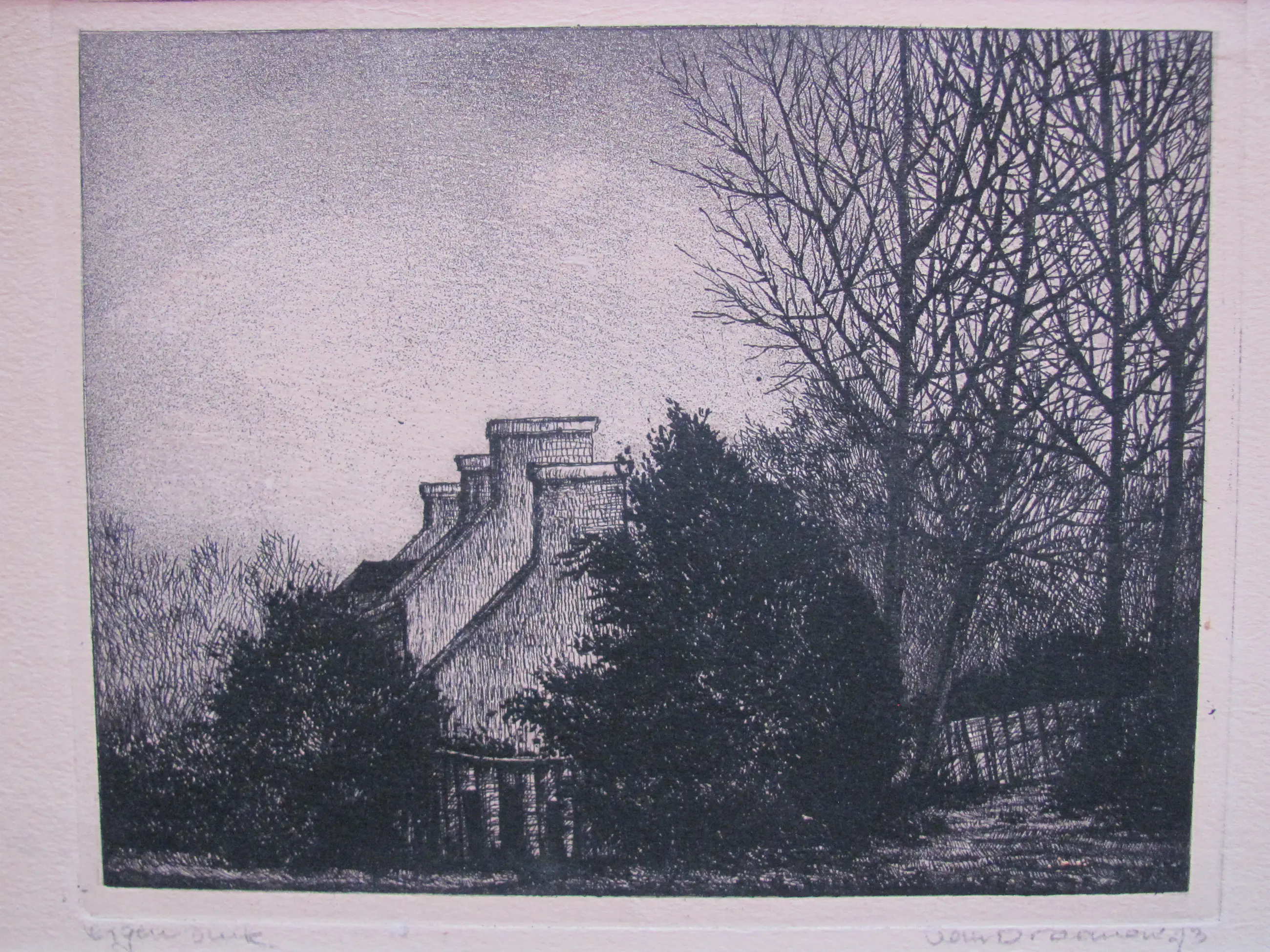 Ets van Hans van Draanen uit 1973. Linksonder in potlood: "eigen druk" Rechtsonder gesigneerd ("van Draanen) en gedateerd ('73).