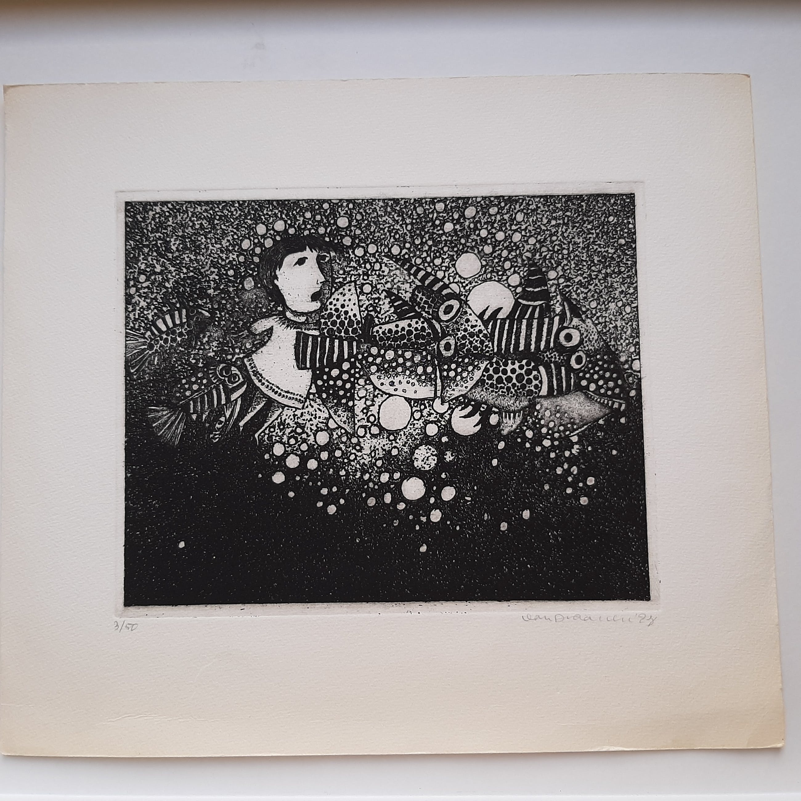De ets en erom heen is prachtig het papier is naar buiten toe ietwat verkleurd, ook al heeft het altijd in een doos gelegen.