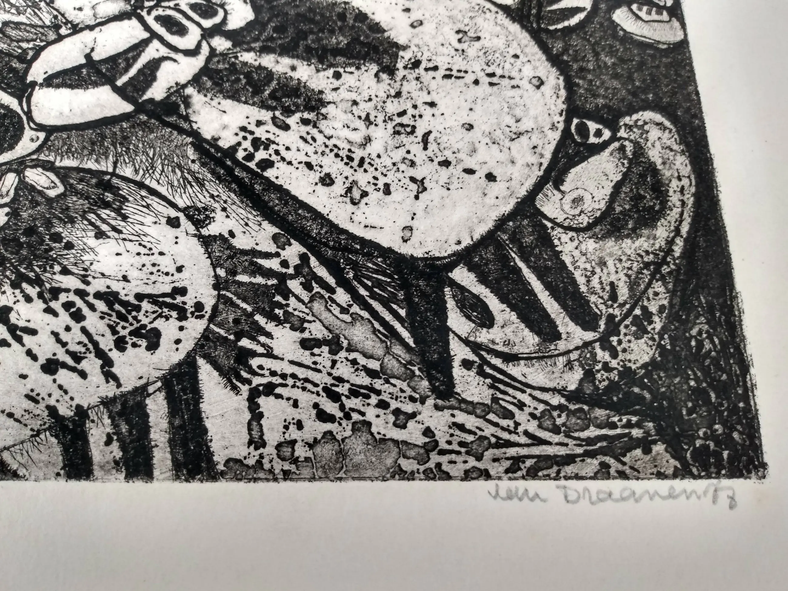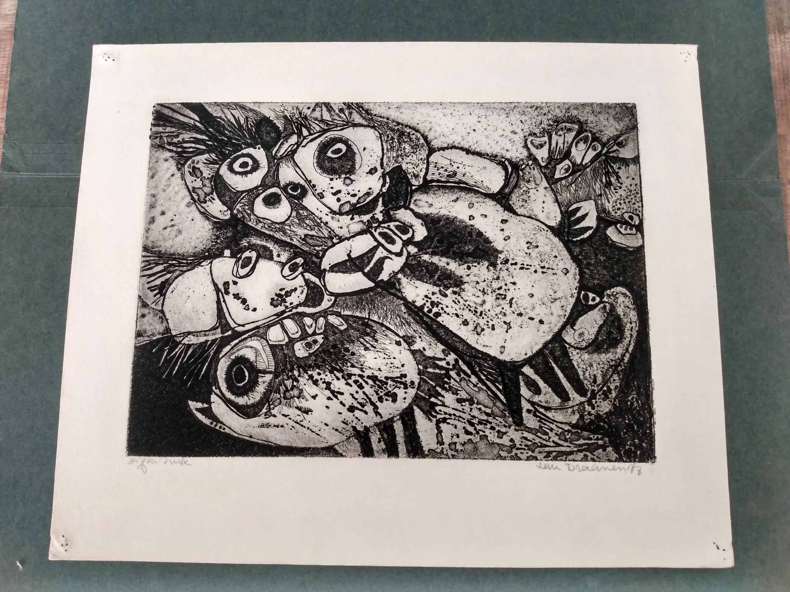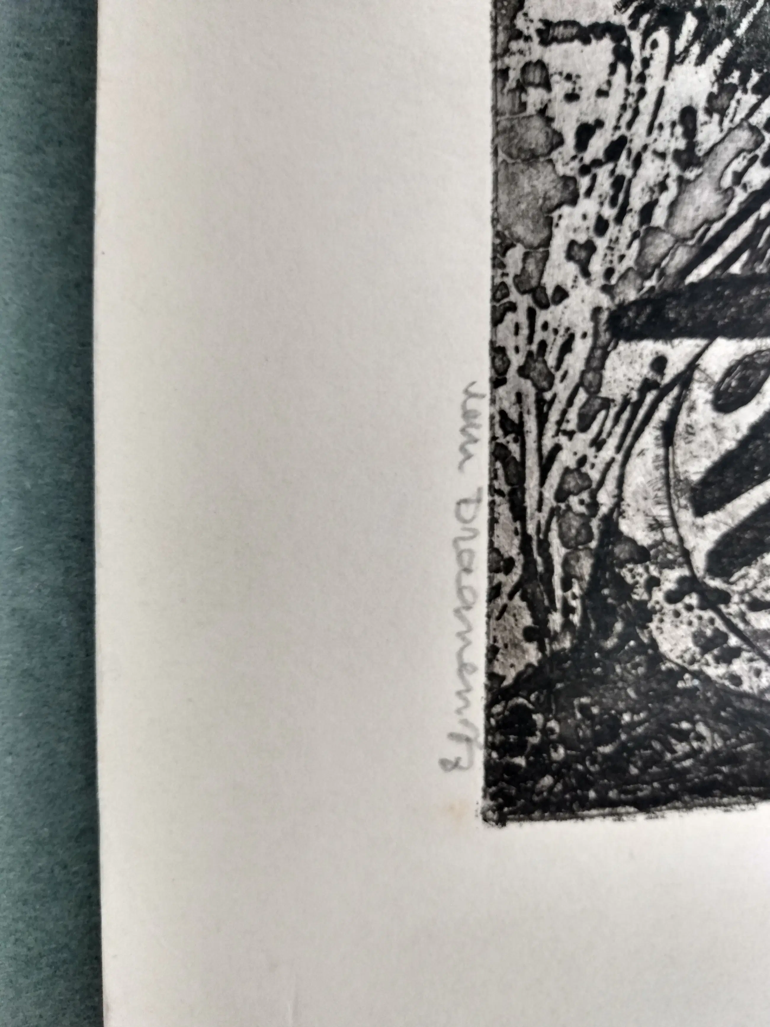 Zwart wit ets; eigen druk; Bladmaat 23 X 28. Maat ets 16 X 22. Geschept papier; jaartal niet goed leesbaar, vermoedelijk 1967. Punaise gaatjes op de hoeken