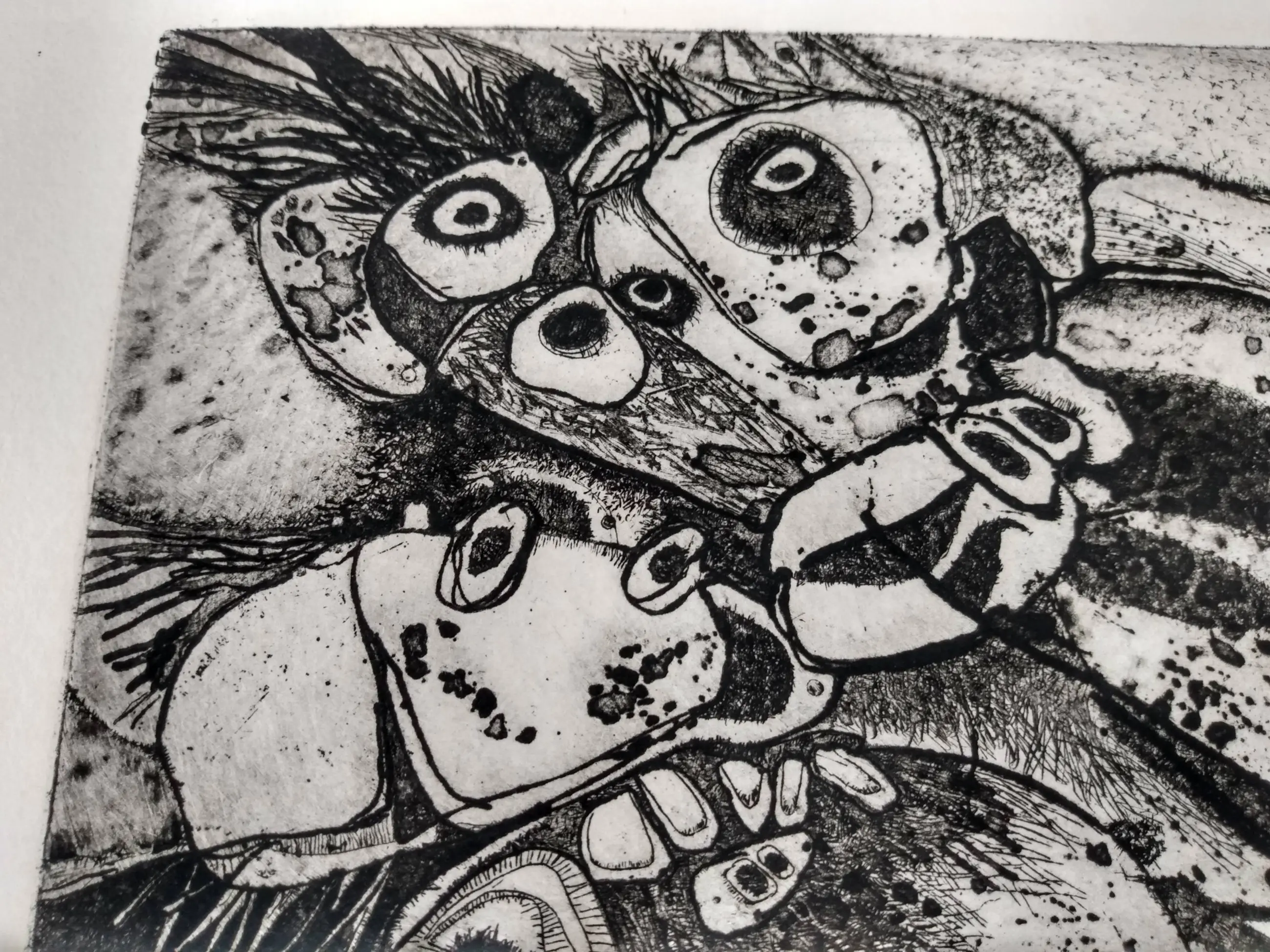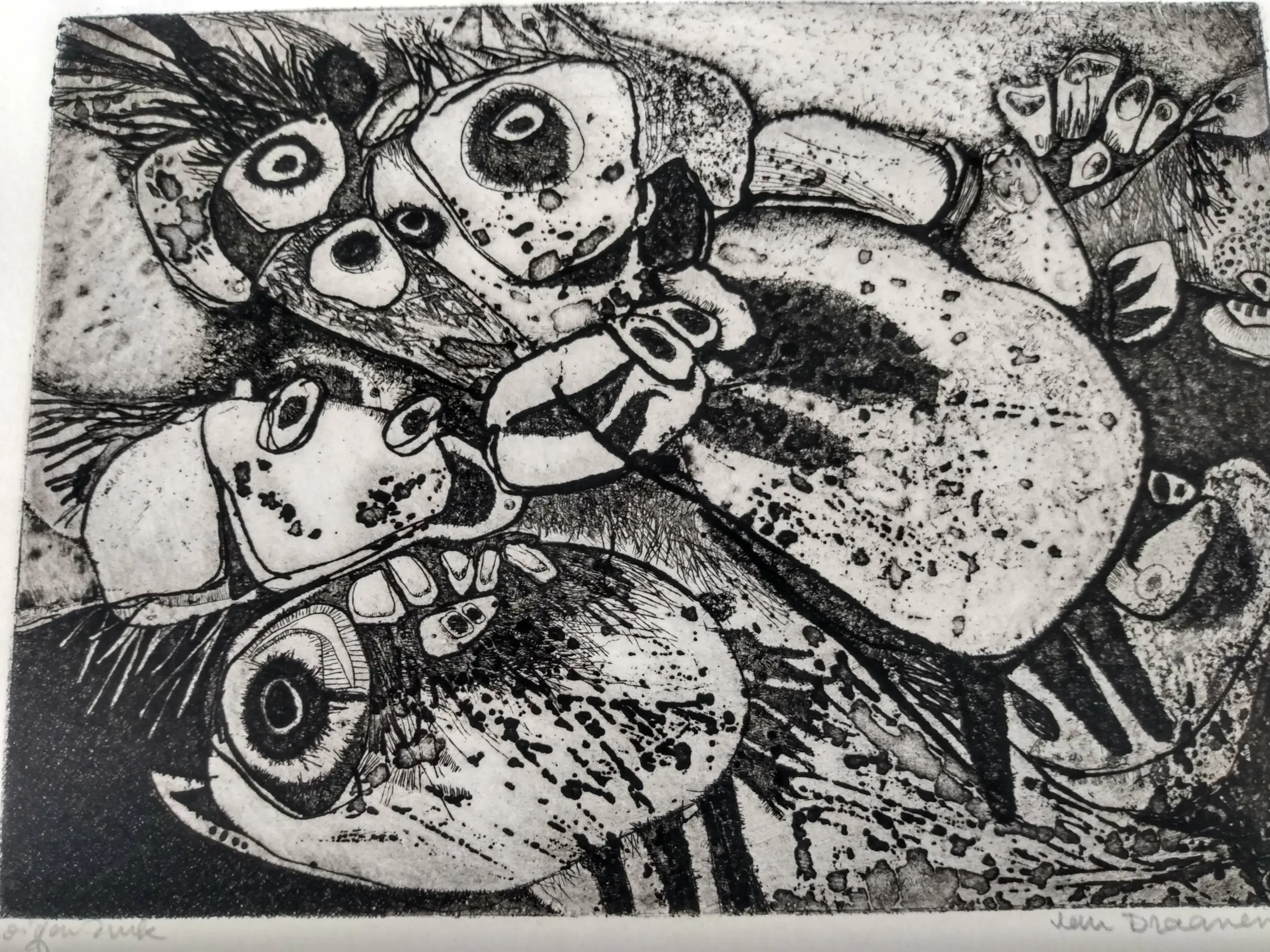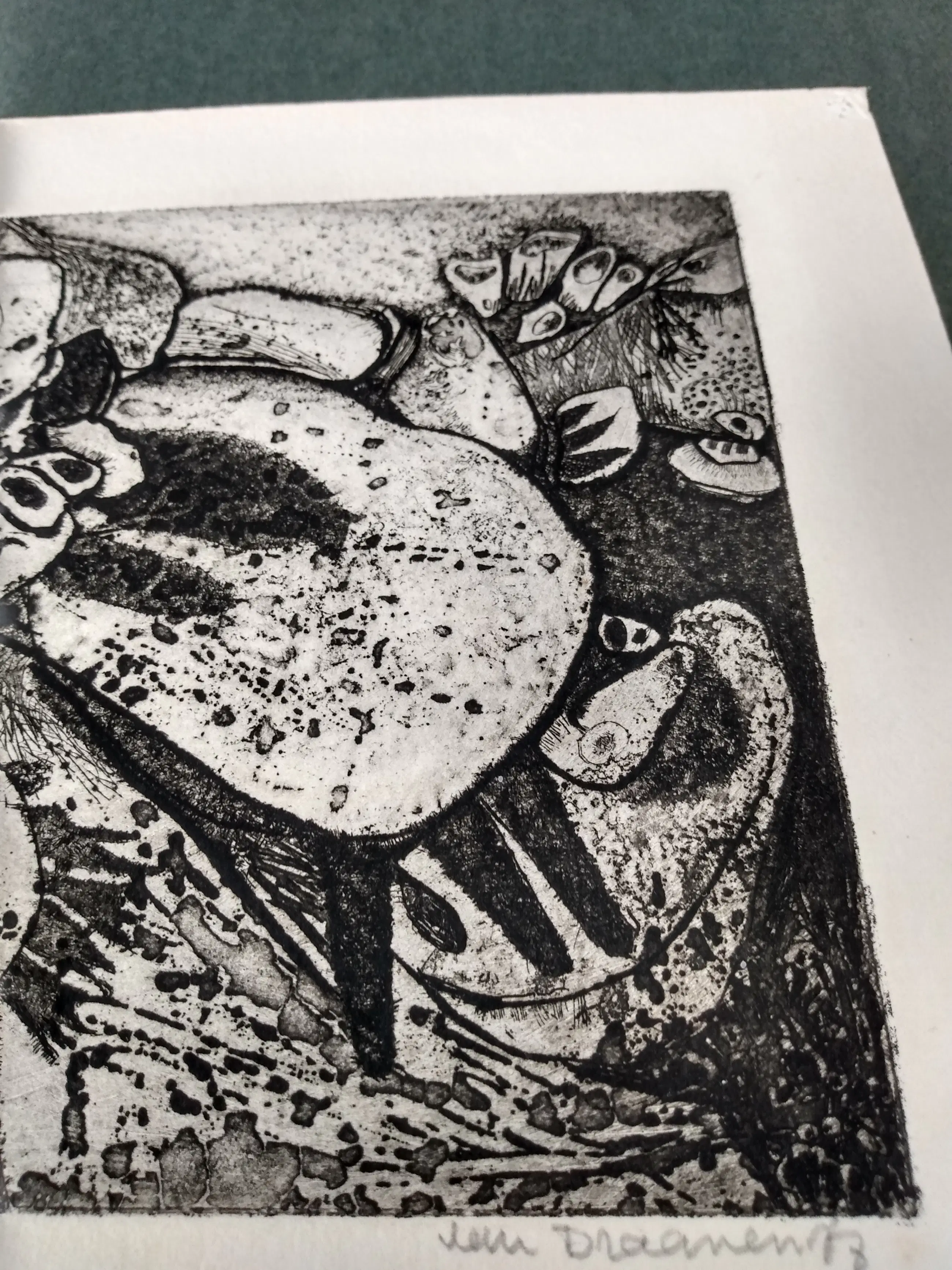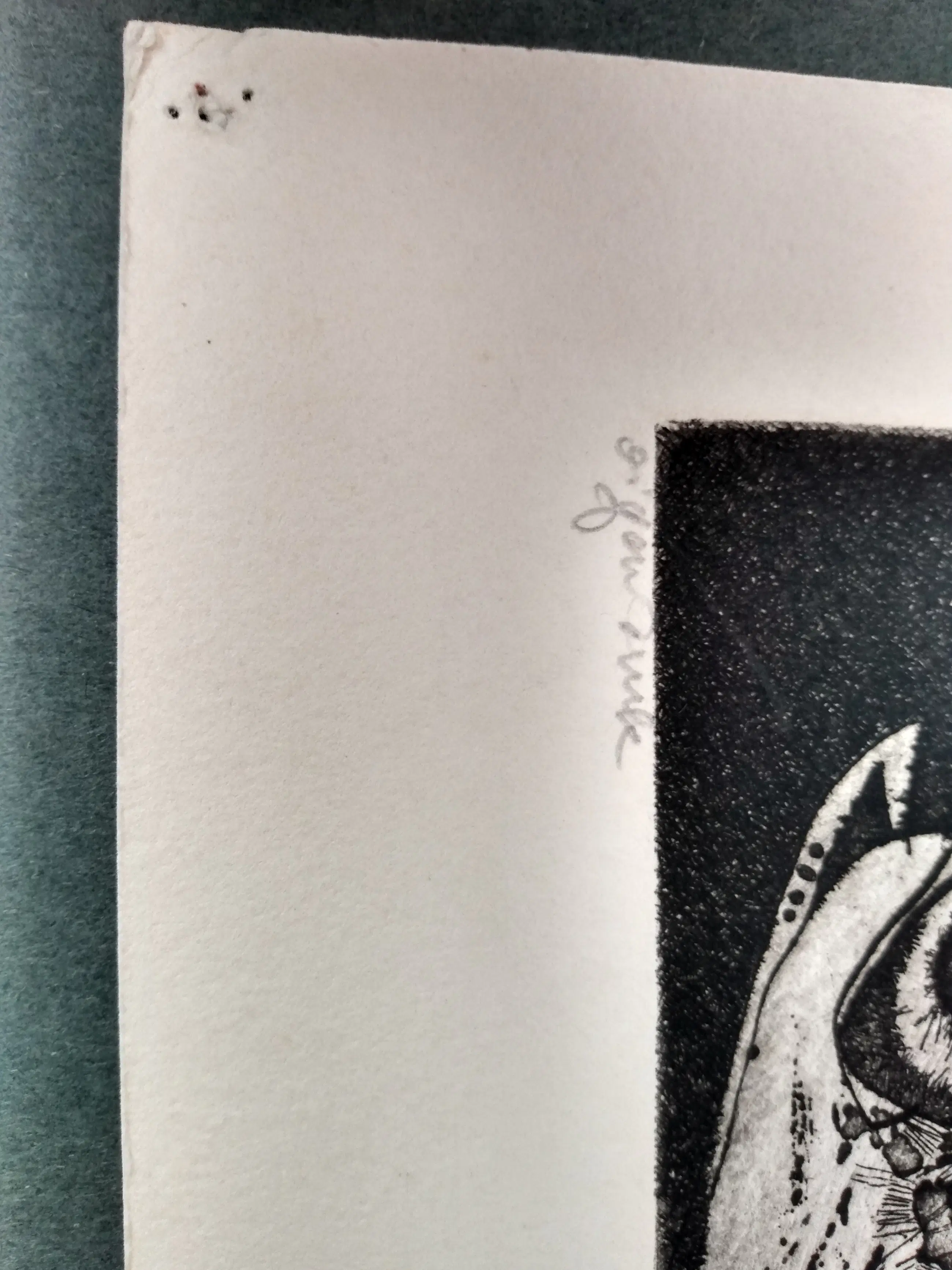 Zwart wit ets; eigen druk; Bladmaat 23 X 28. Maat ets 16 X 22. Geschept papier; jaartal niet goed leesbaar, vermoedelijk 1967. Punaise gaatjes op de hoeken