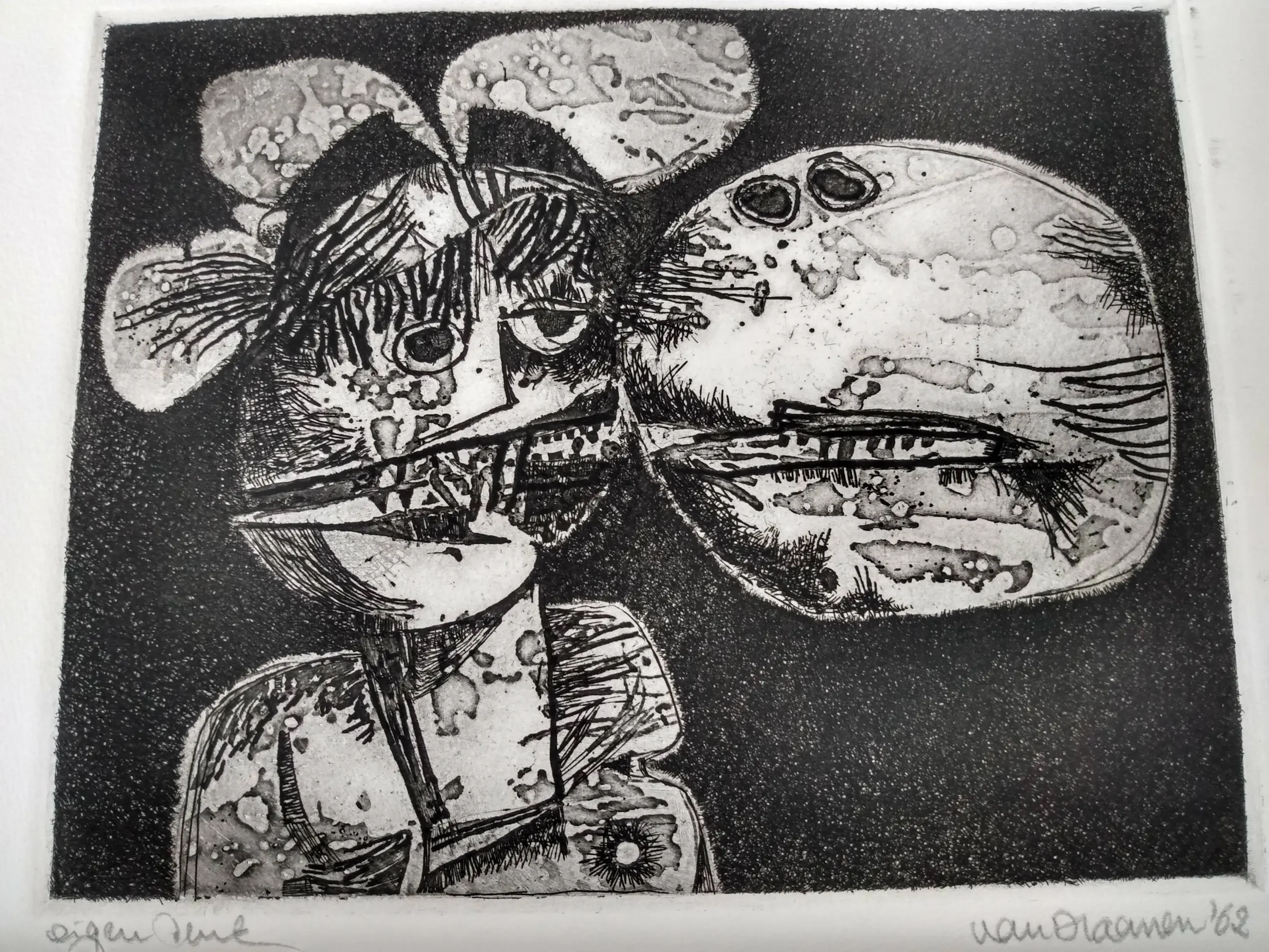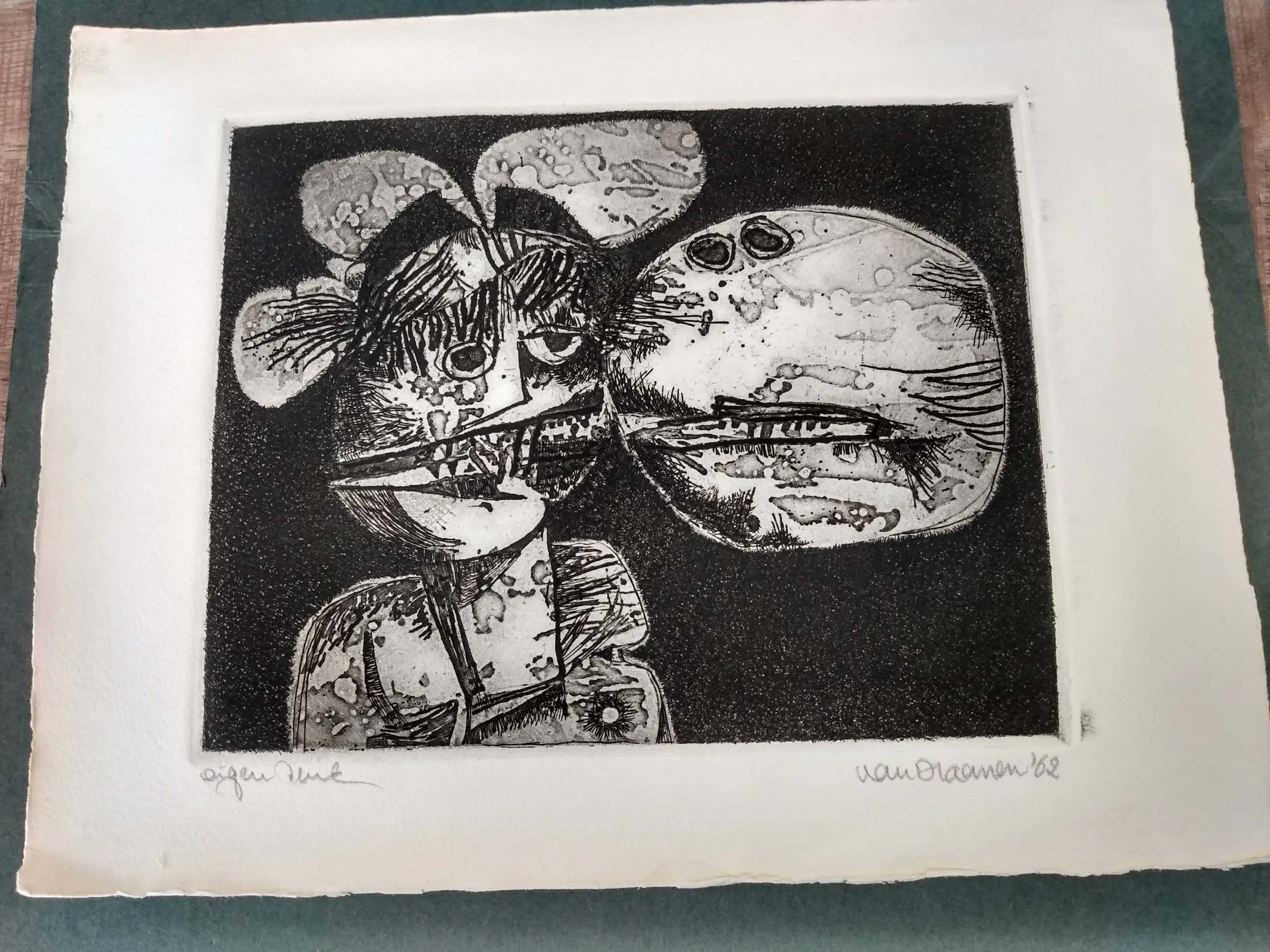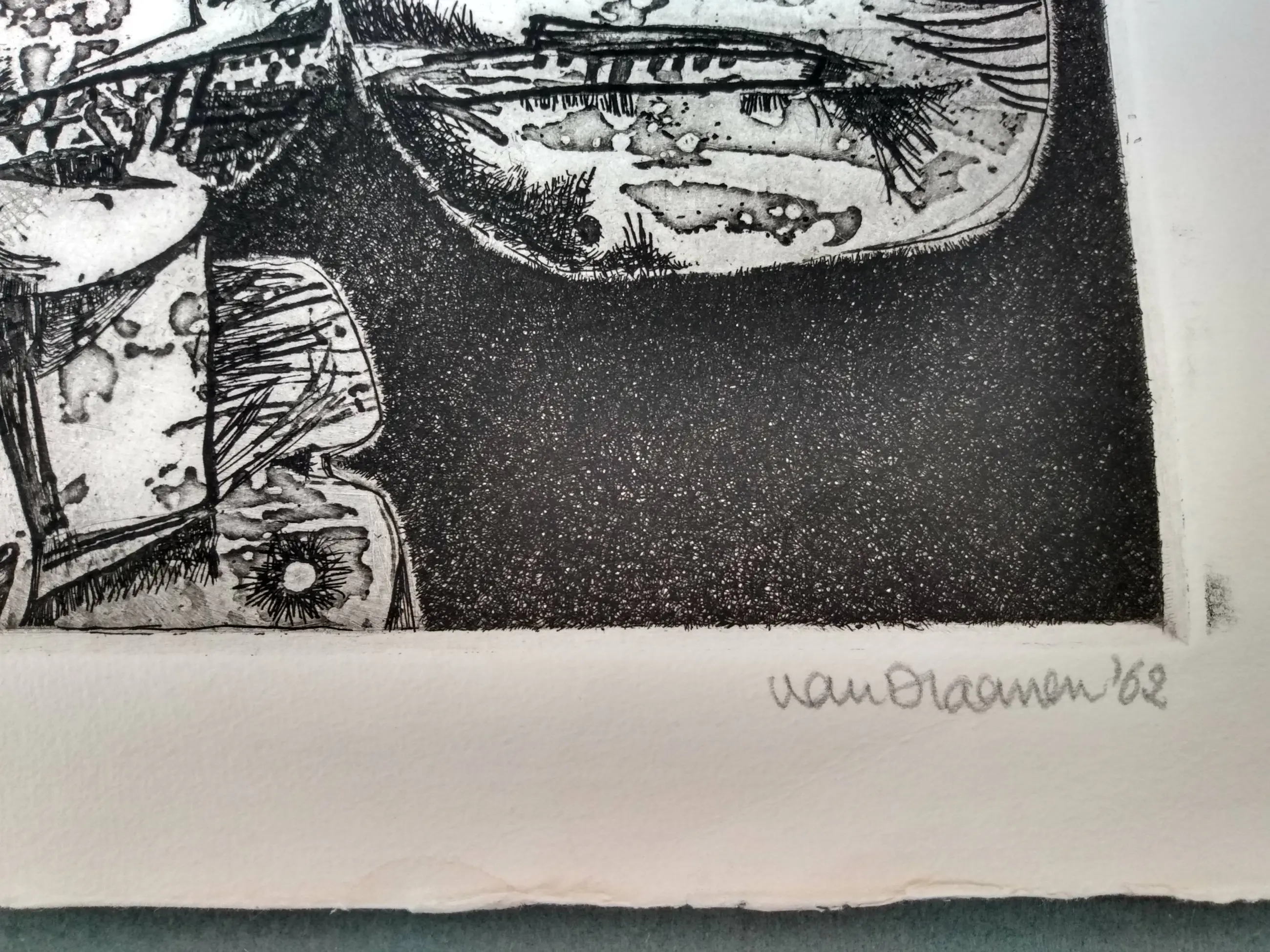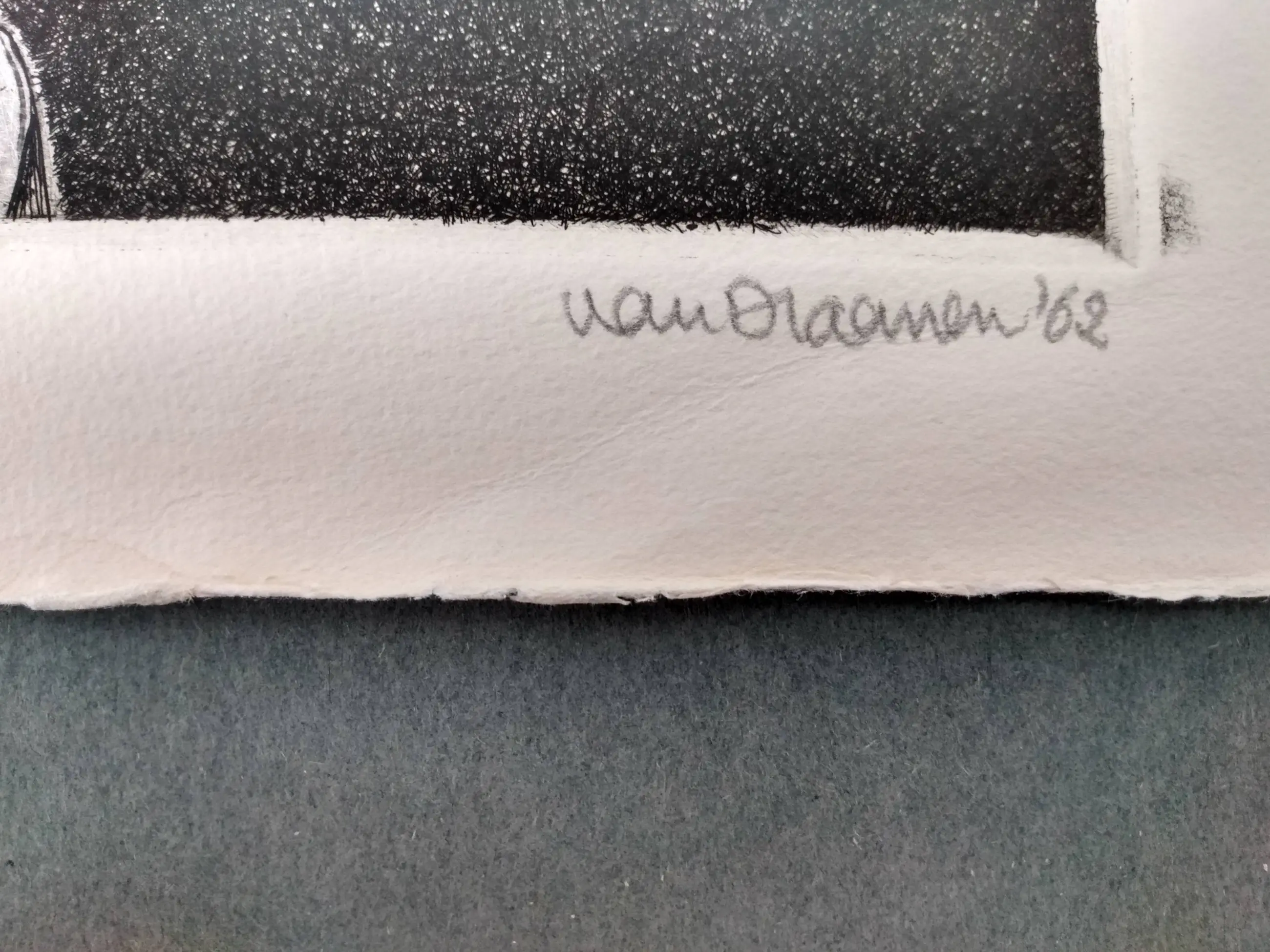 Zwart wit ets; eigen druk; Bladmaat 24,5 X 33. Maat ets 23 X 19. Geschept papier; jaartal goed leesbaar 1962. Puntgaaf!!