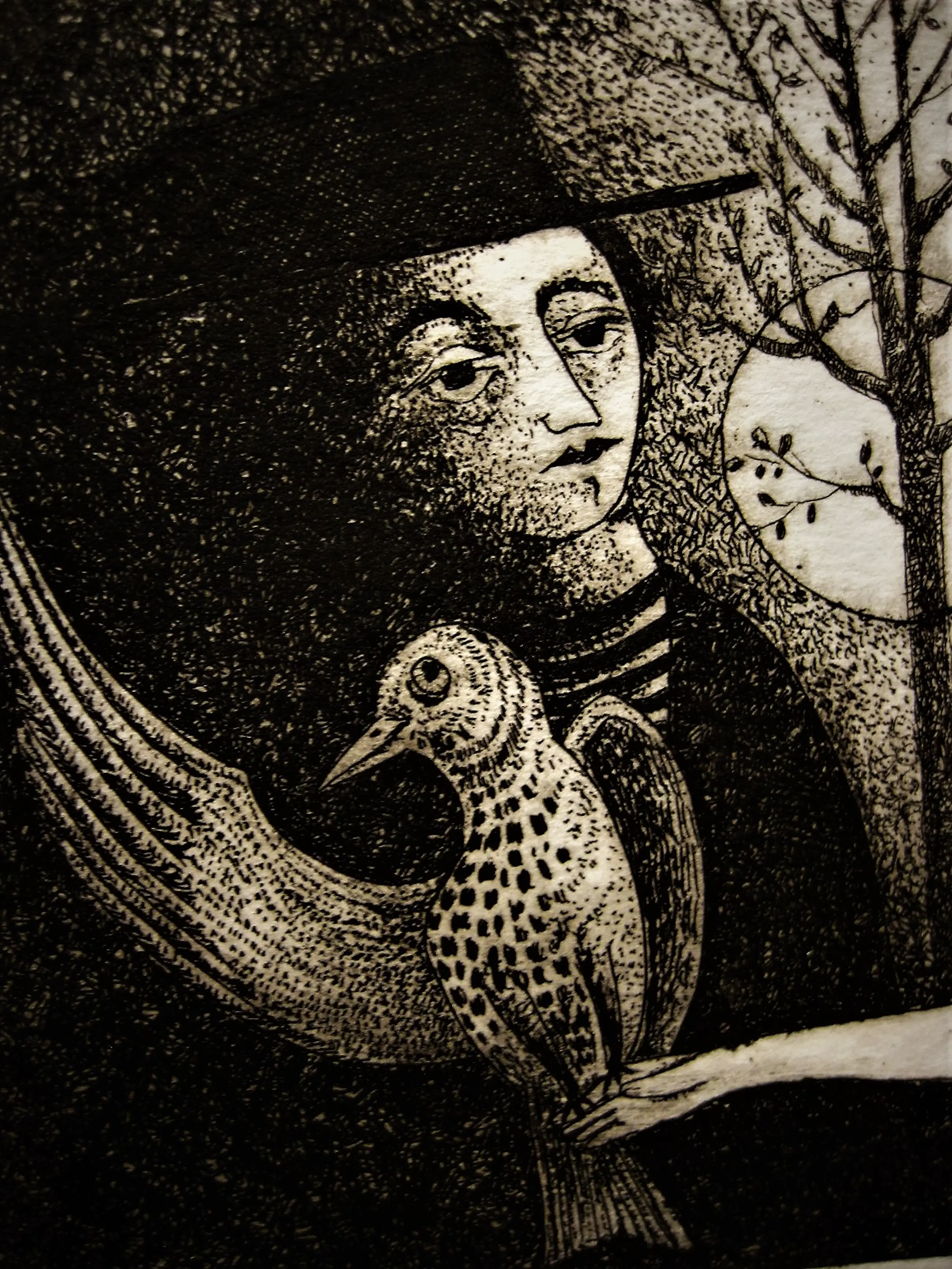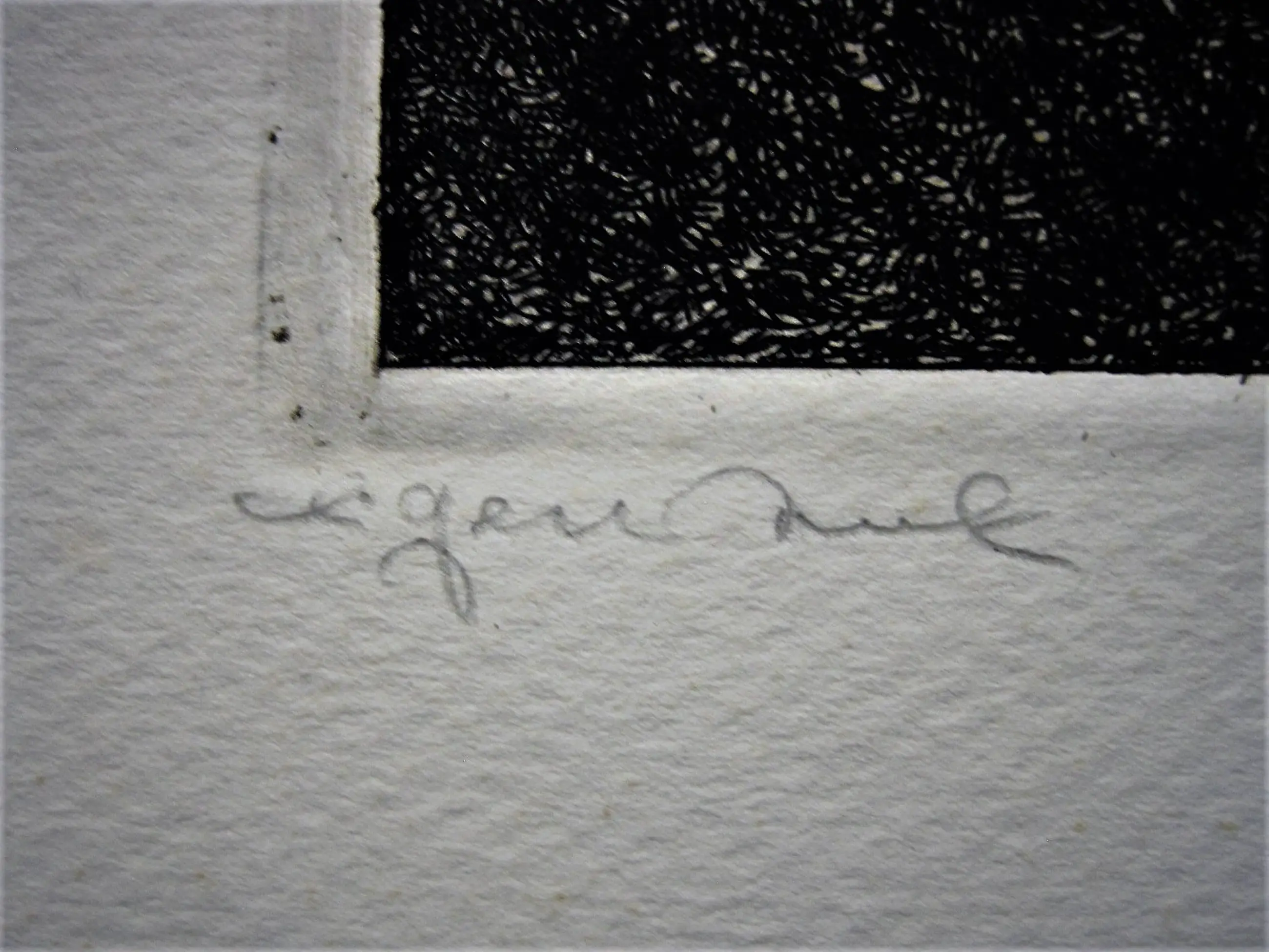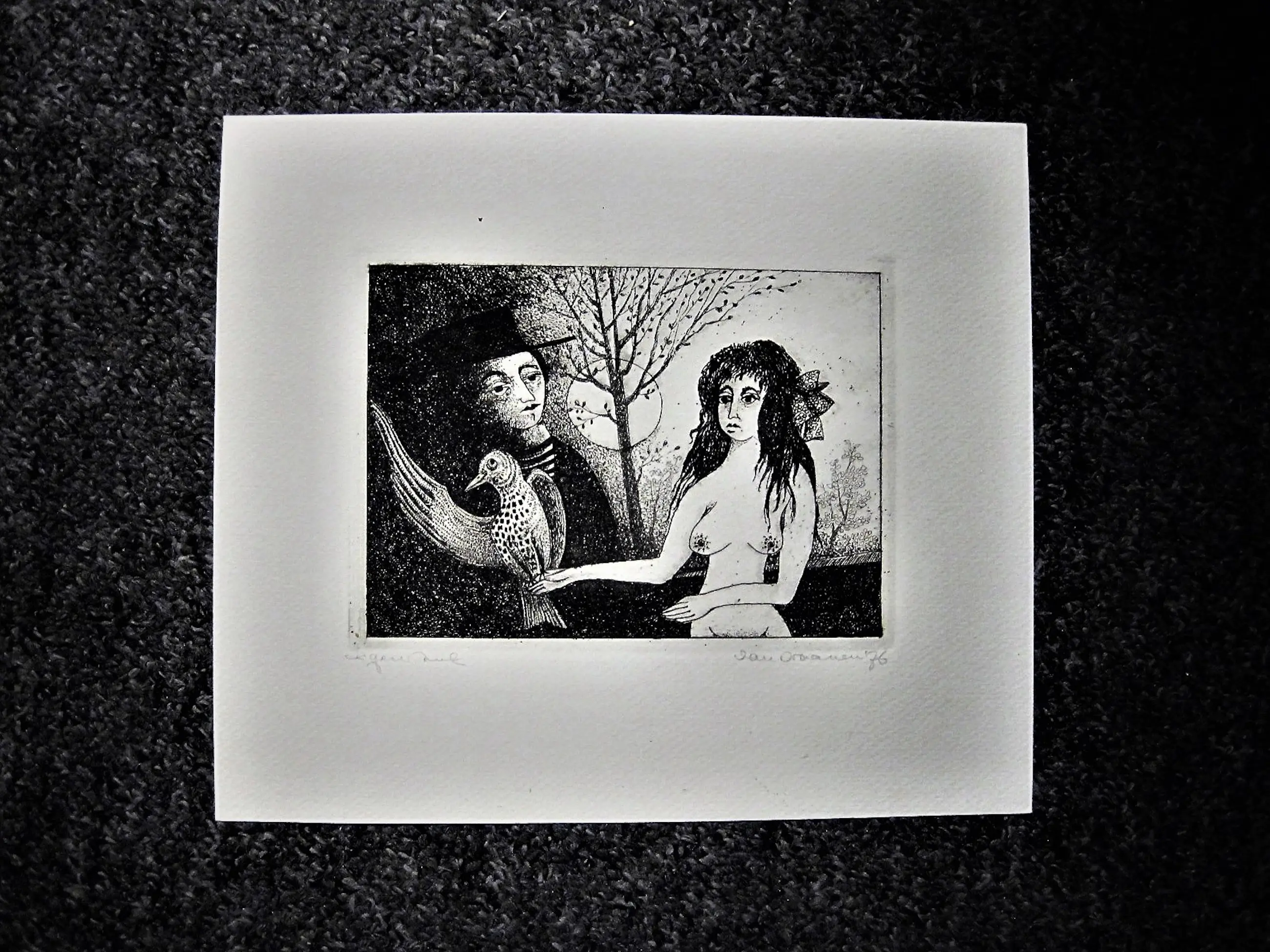 Titel: Figuren met vogel Jaartal: 1984 Afmetingen beeld: 10 cm x 16 cm (20 cm x 23 cm) Oplage: eigen druk Gesigneerd: Ja Materiaal: Ets/aquatint op papier Ingelijst: Nee