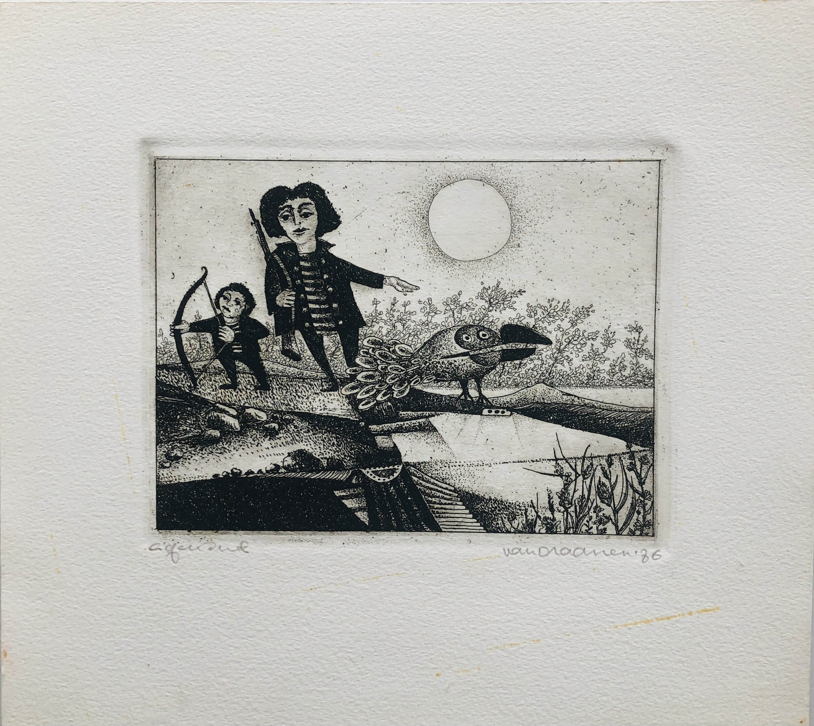 de ets-plaat afmeting is 11 x 14 cm. Gesigneerd rechts onder: van Draanen '76 Staat afgebeeld in boek op pagina 283. Biografie Hans van Draanen , schilder, graficus, beeldhouwer en dichter. Maria Smook-Krikke. (boek is eventueel ook te leveren)