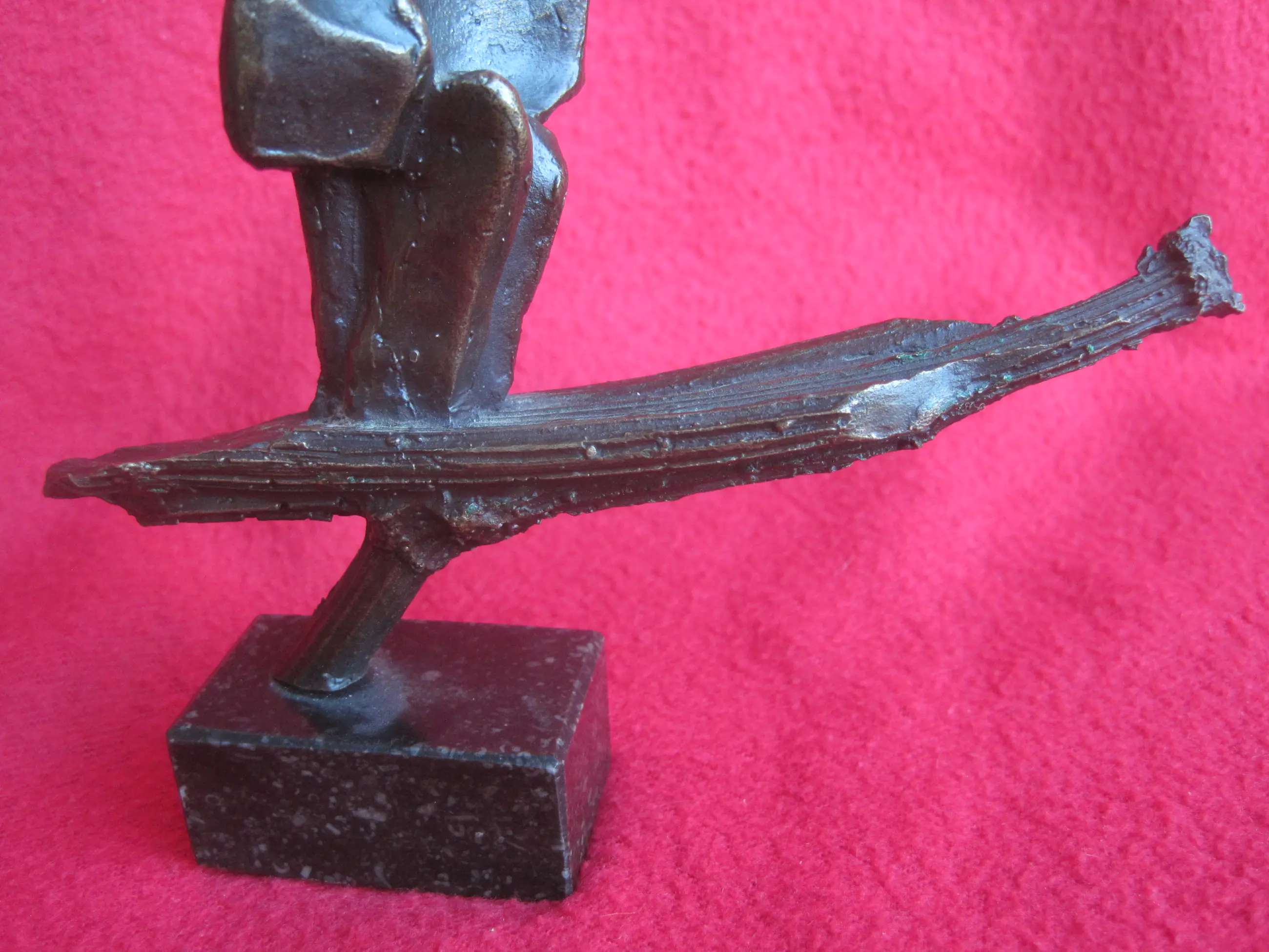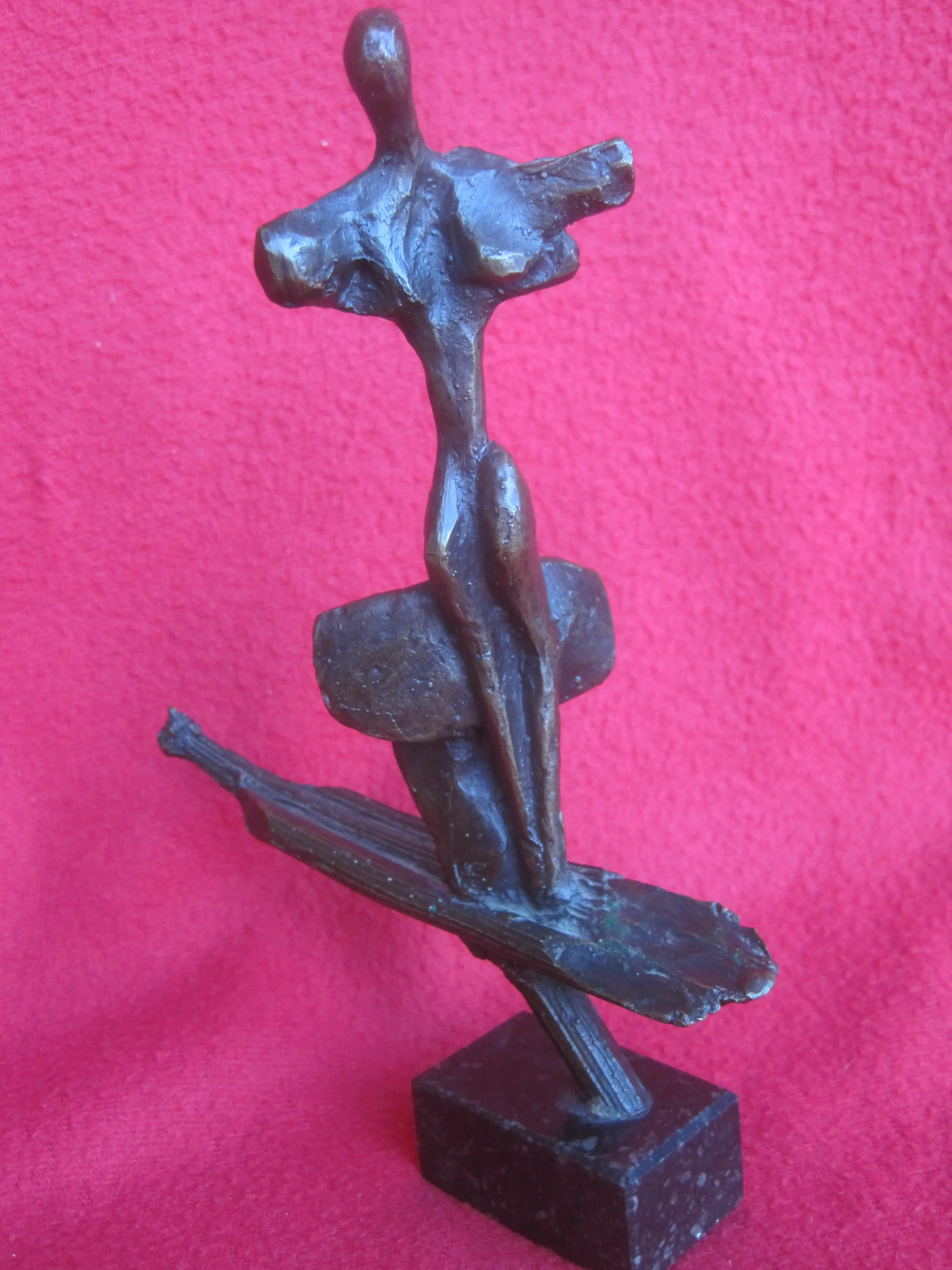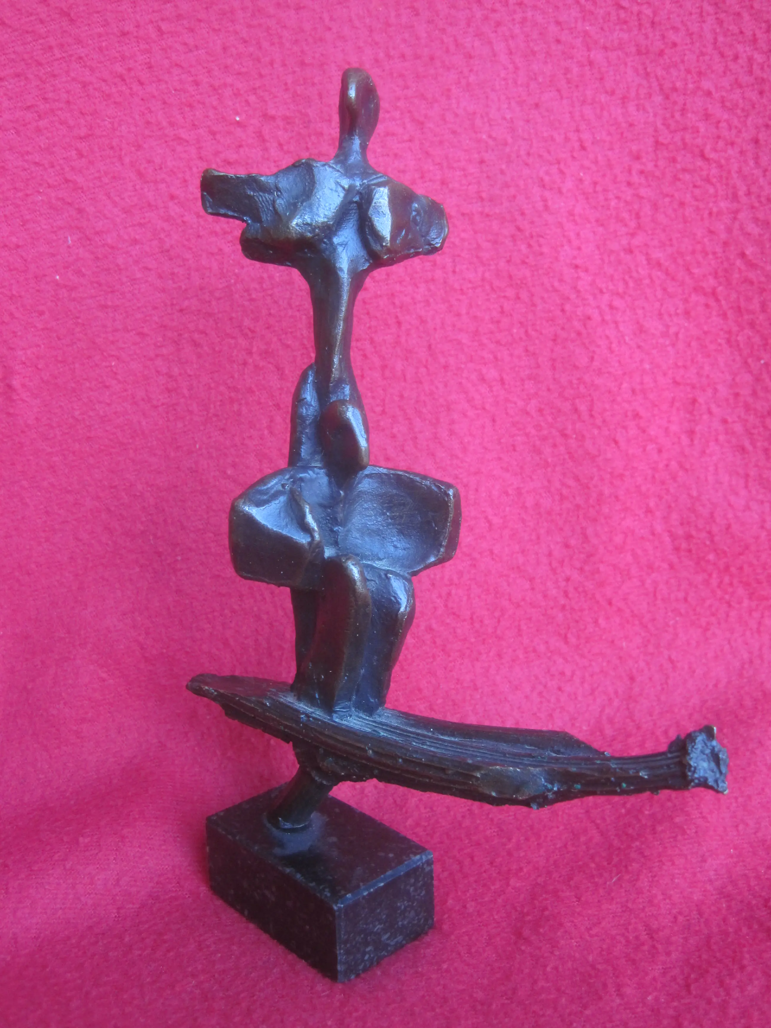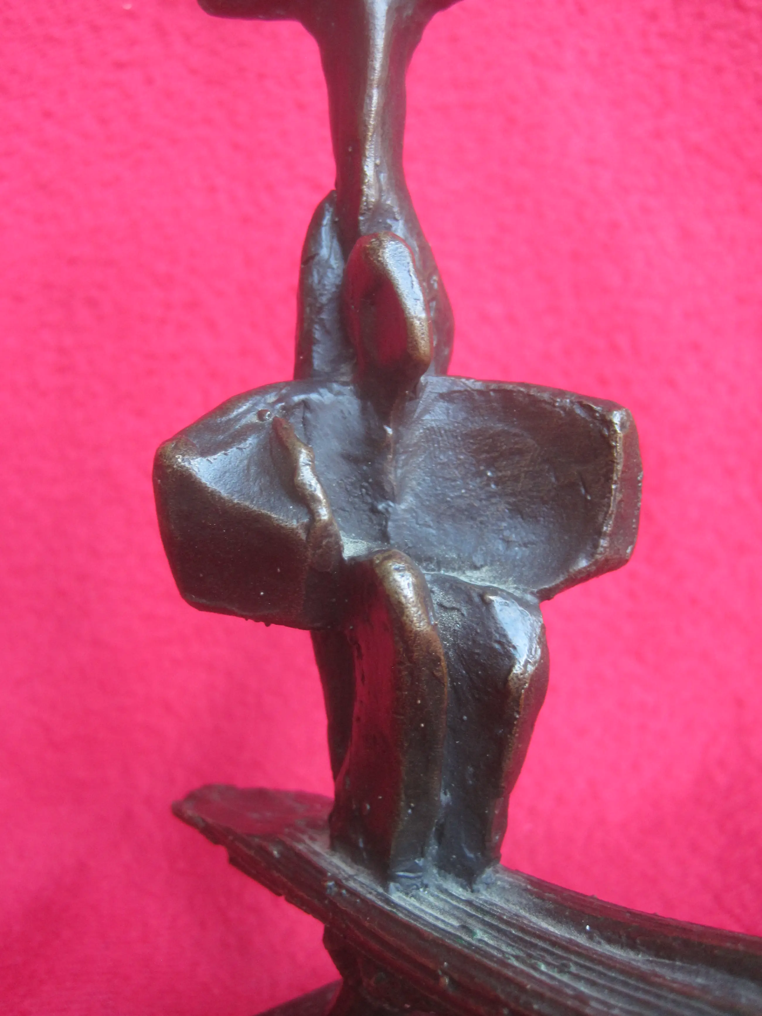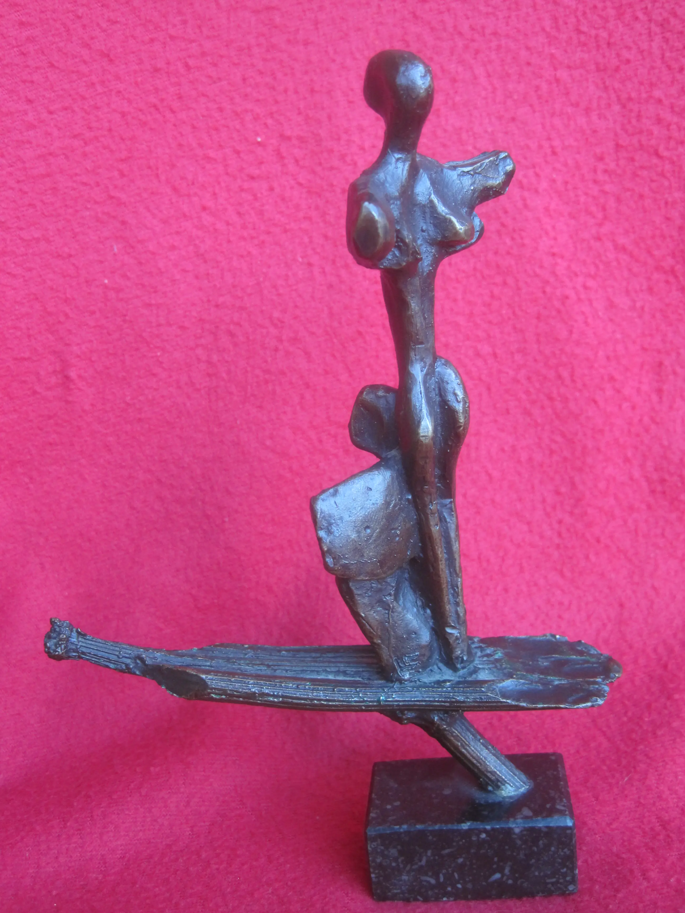 Prachtig bronzen beeldje door Hans van Eerd. Beschrijving door de kunstenaar zelf: "Bij het ontwerpen van dit beeldje ben ik uitgegaan van het "Samen - Gaan". De twee figuren die zwevend naar de toekomst dezelfde richting inkijken. Zwevend op een boot als het samenvaren. Varen gaat langzaam. Een langzame opbouw van de toekomst. Maar ook:
