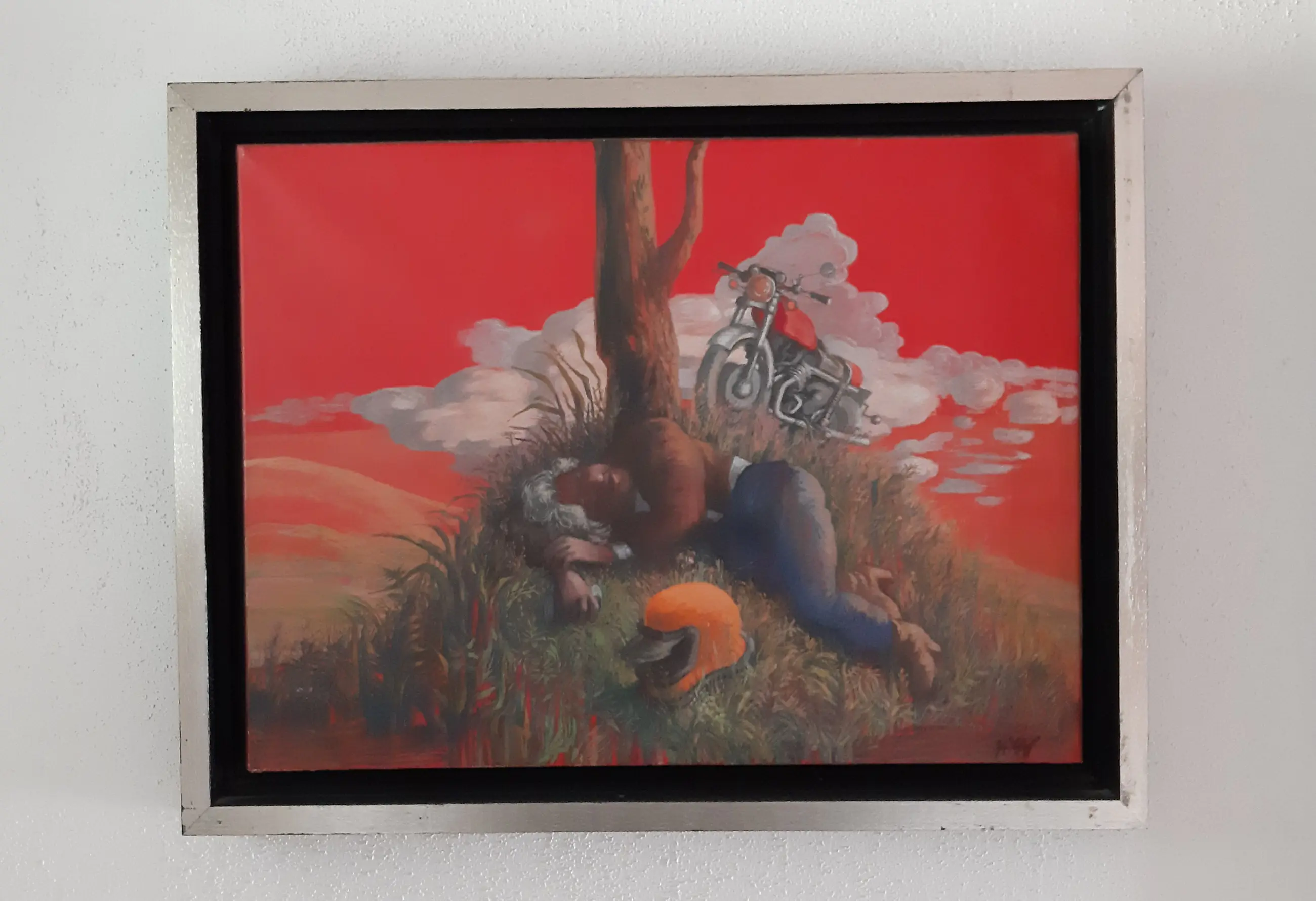 Hans van Norden was in 1948 grondlegger van De Realisten samen met Nico Wijnberg en Theo Kurpershoek. Ze hielden vast aan het realisme omdat kunst begrijpelijk moest zijn en blijven voor een groot publiek. Ze ageerden tegen de abstracte kunst van o.a. Karel Appel waarvan musea gecharmeerd raakten, maar waarin veel gewone mensen niets zagen. In 1951 kregen De Realisten uiteindelijk een grote tentoonstelling in het Stedelijk Museum in Amsterdam. Desondanks keerde de kunstwereld zich af van het realisme. De afgelopen decennia begint pas het besef door te dringen dat ook het na-oorlogse realisme schitterend werk heeft voortgebracht. Dit kleine schilderij getuigt daarvan. Het realisme van de slapende motorrijder (is het Van Norden zelf?) onder een boom op een heuveltje onder een bloedrode hemel biedt volop ruimte voor interpretaties door het contrast van de onschuldige slaap versus de dreigende lucht, met de motor als waker. De titel is door de schilder zelf achterop geschreven. Het schilderij zit in een passende baklijst.