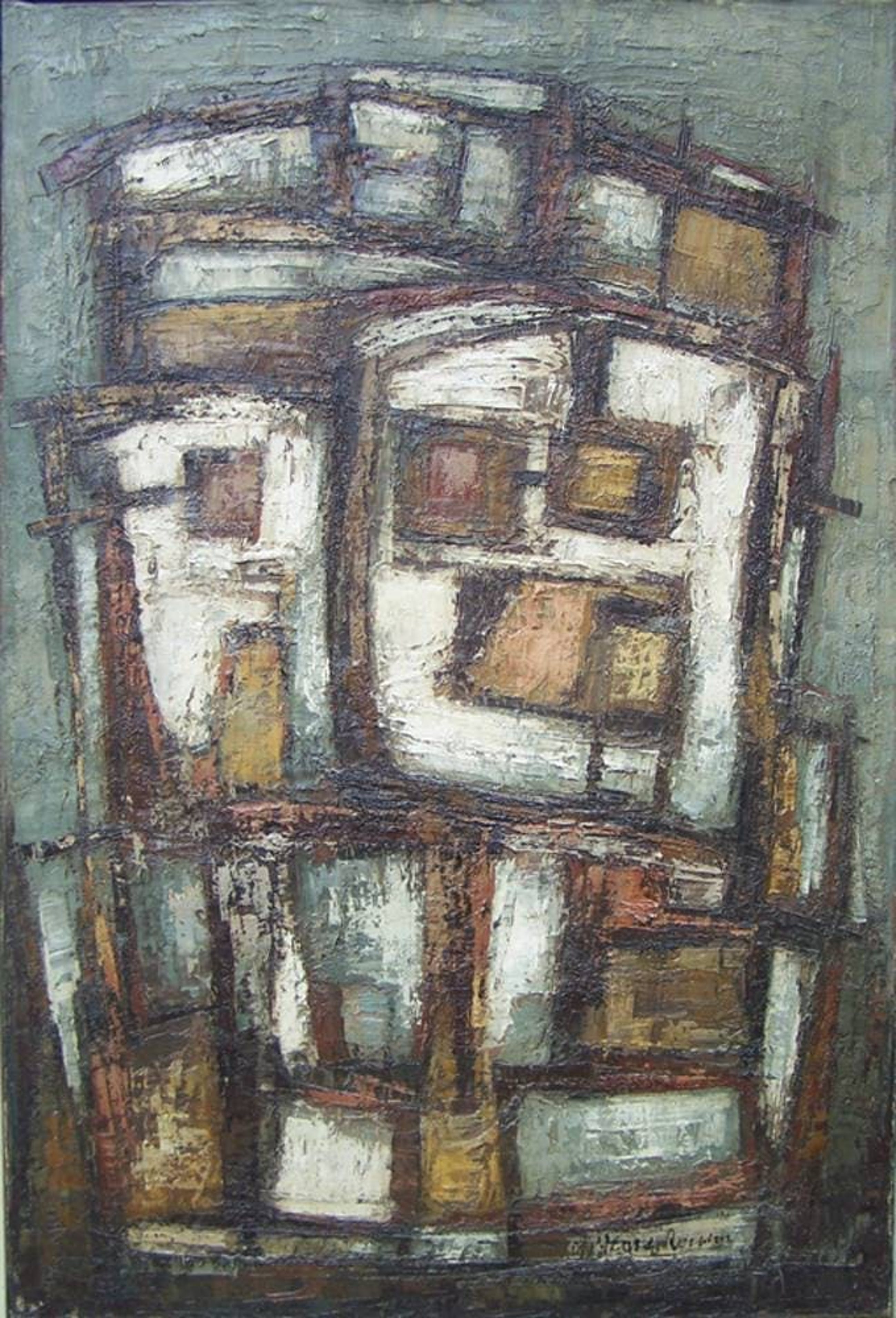 Hans van Rossem (*1933) woont en werkt in Eemnes. Schilder van o.a. stadsgezichten. Op dit schilderij abstraheert de schilder woonwagens.