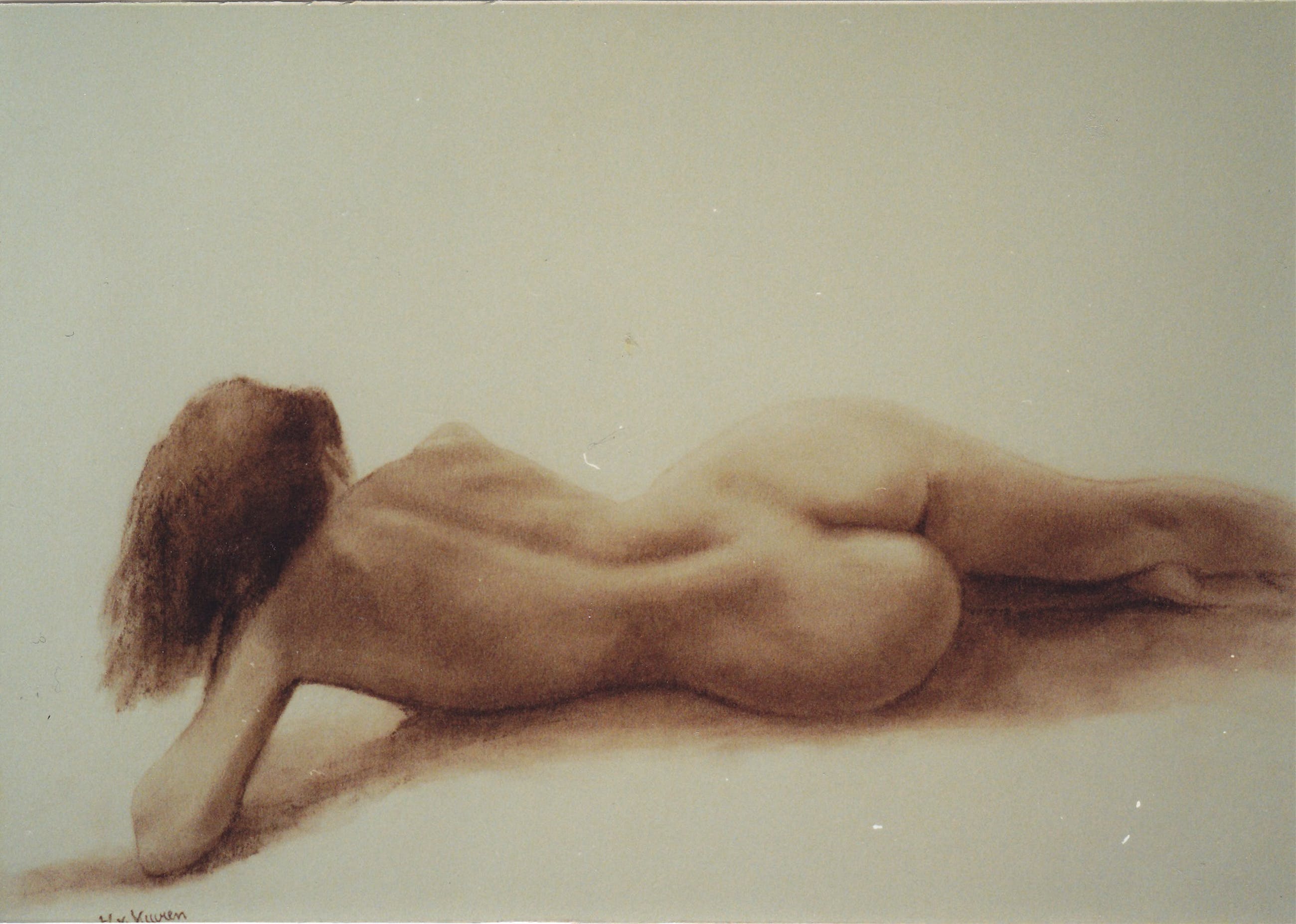 Liggend naakt, van conté krijt op dun karton. Nog in bezit van de kunstenaar zelf.