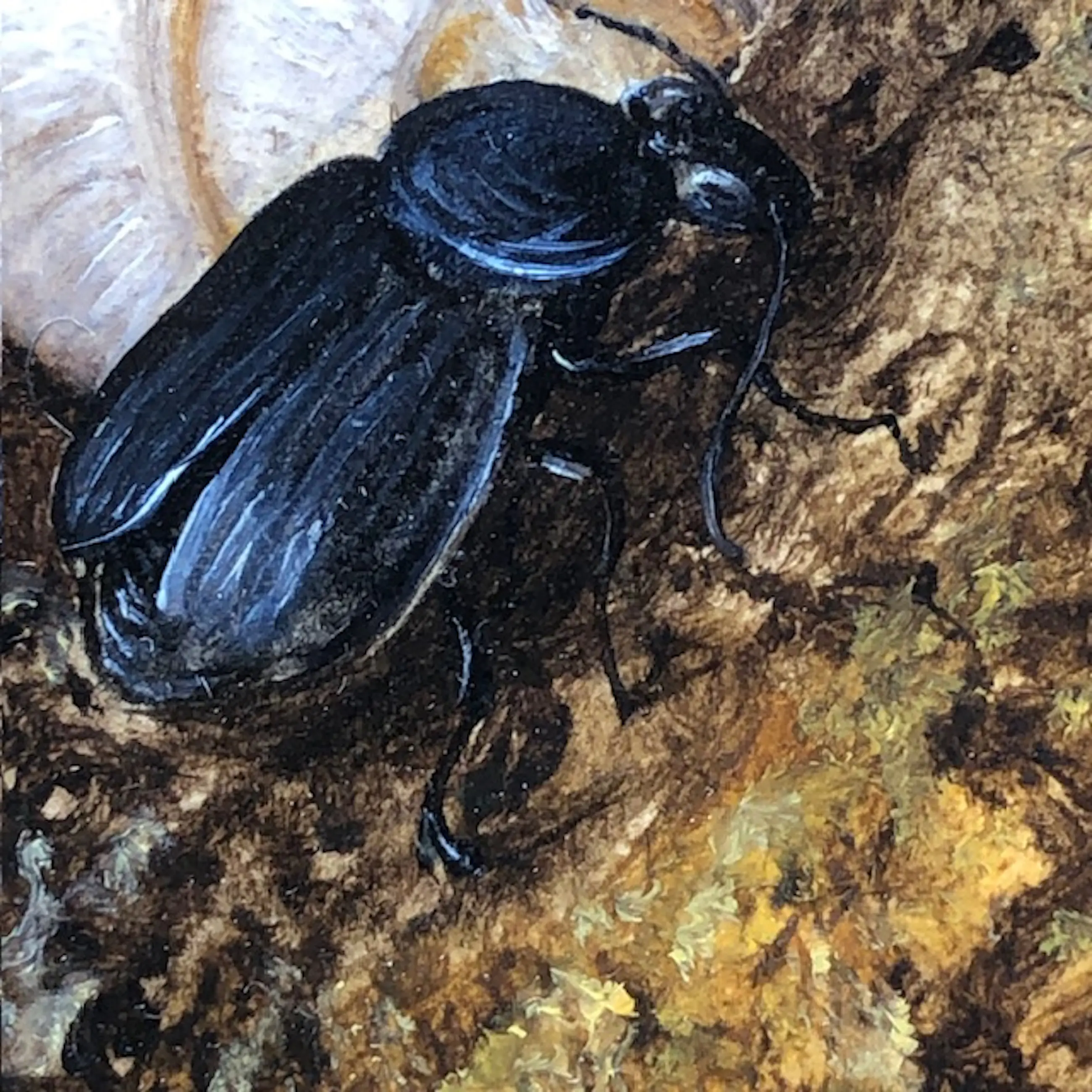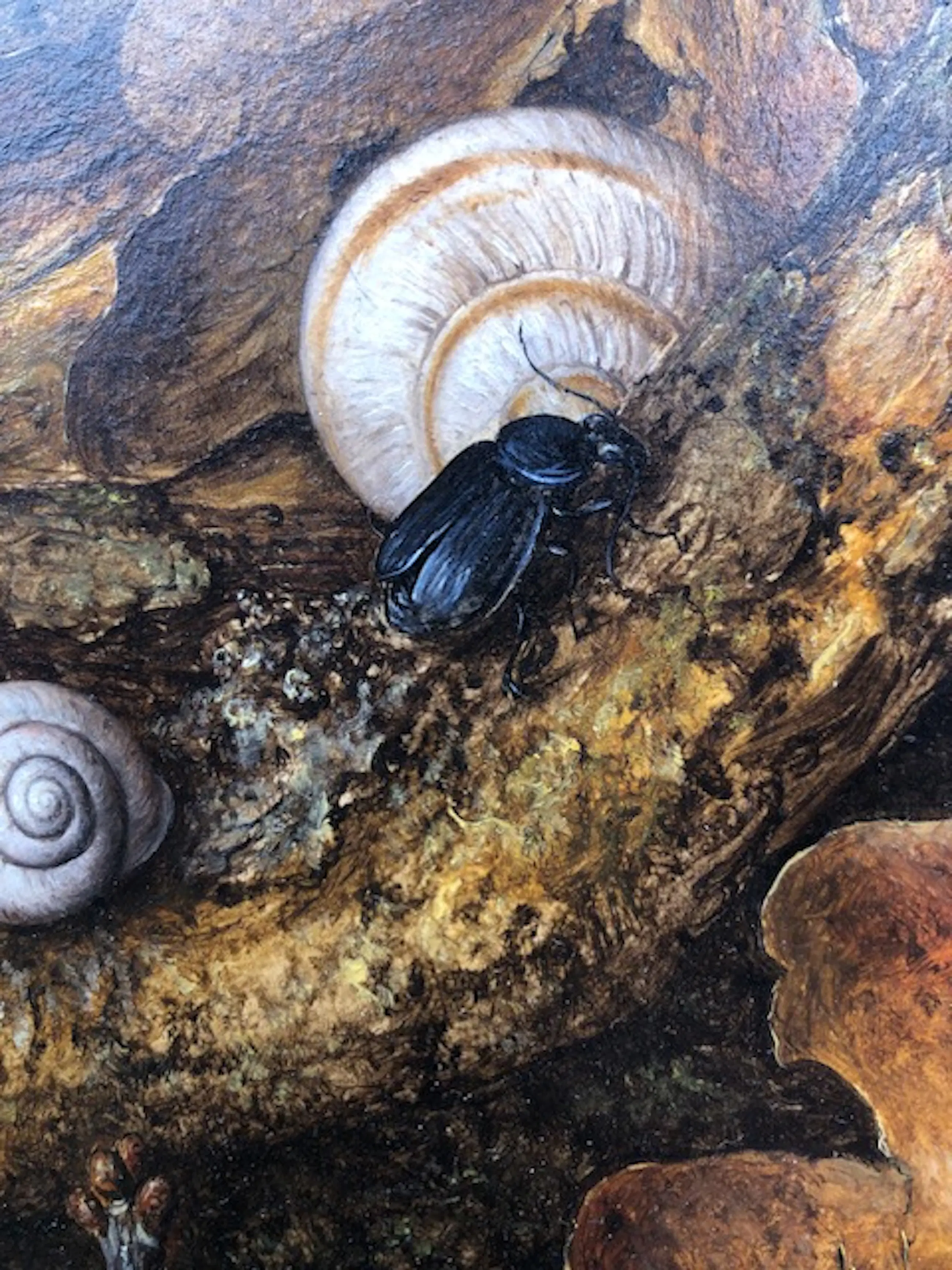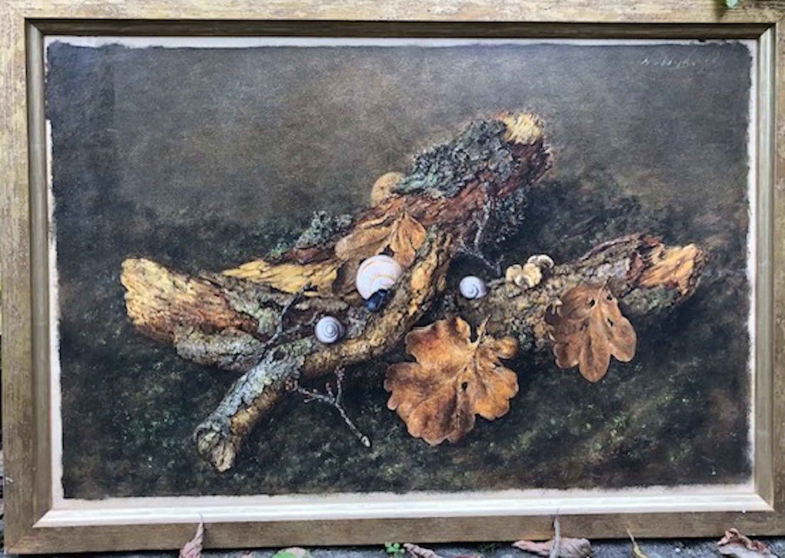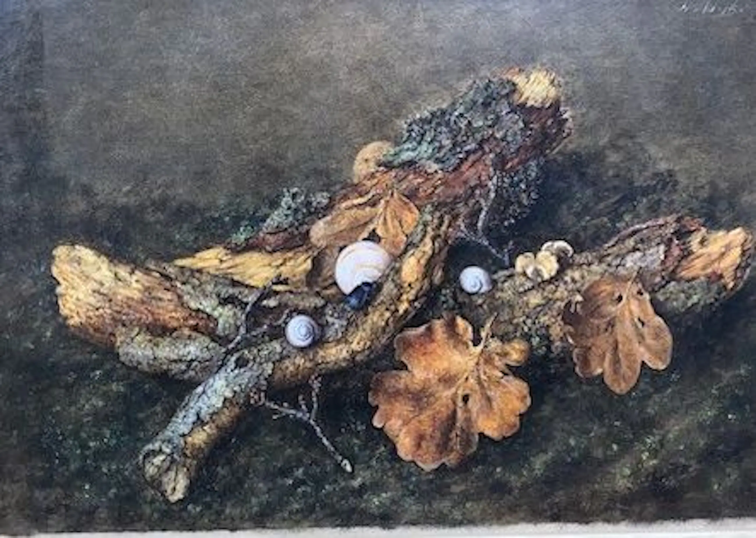 Hendrik Jan Van Wijk ( 1911-1990) Stilleven op boomstronk met slakkenhuizen en insect. Zeer gedetailleerd uitgewerkt. Olie op paneel uit 1960. In mooie bijpassende omlijsting. Gesigneerd . Afmeting 40 x 60 cm.
