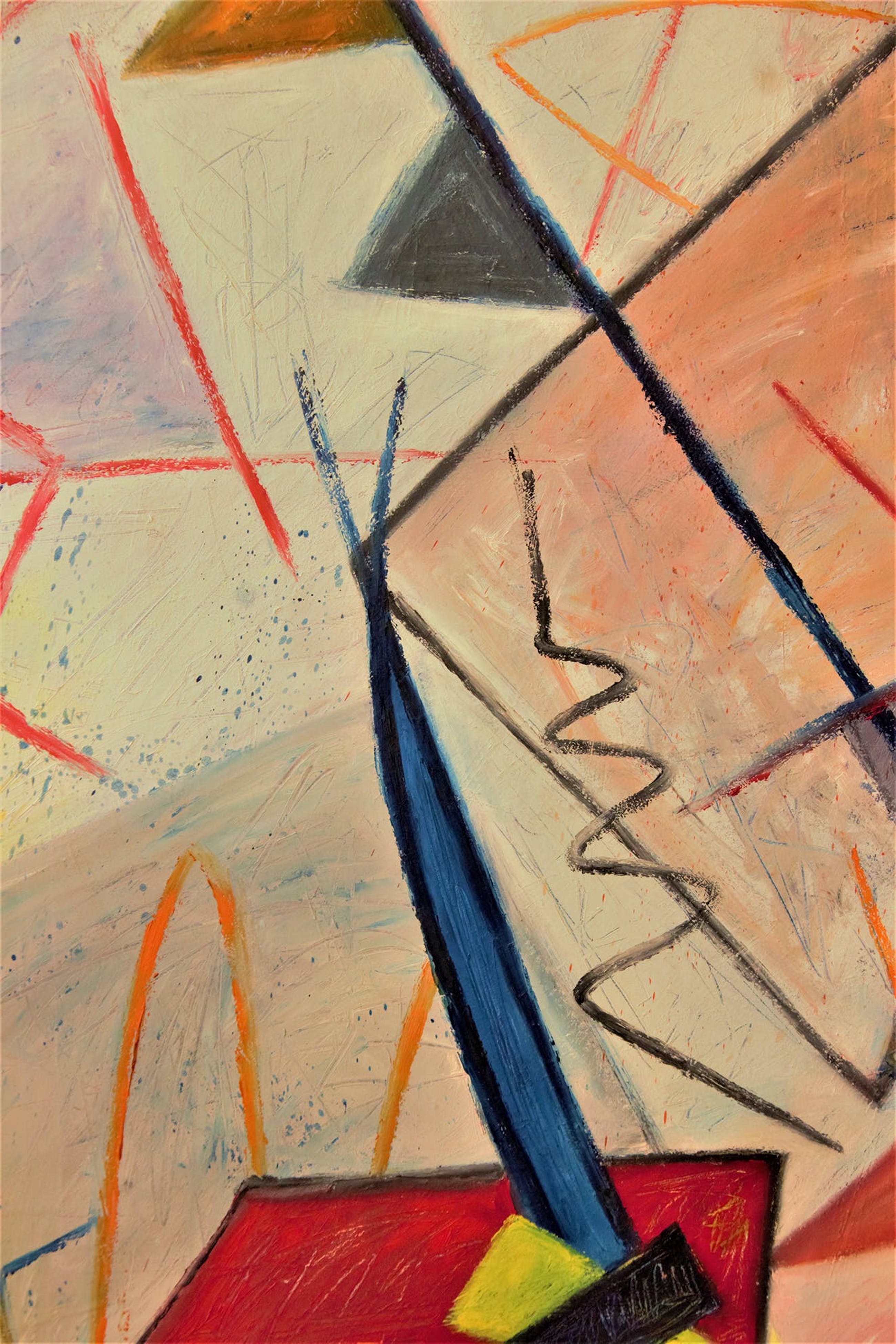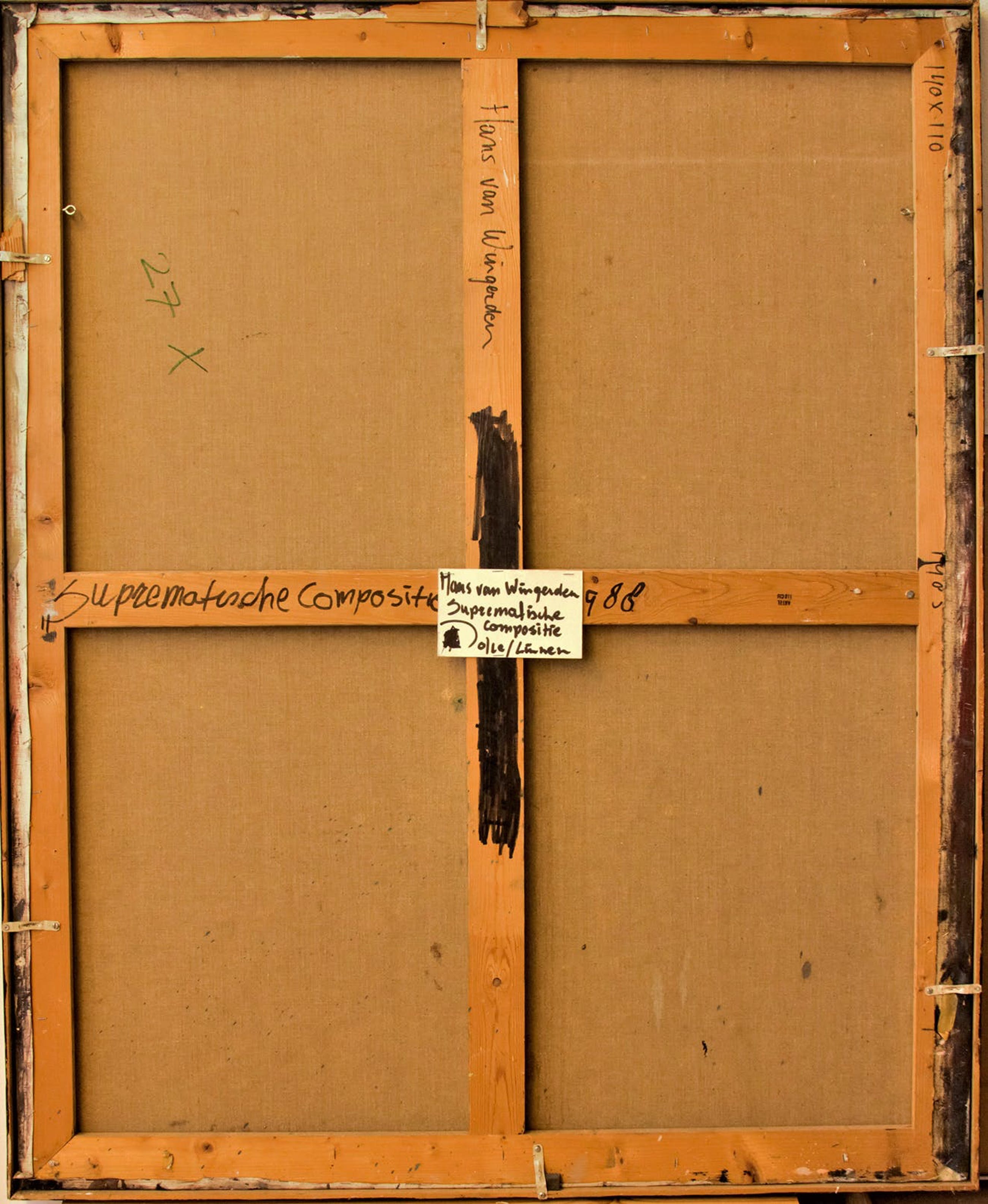 Abstract werk van beeldend kunstenaar Hans van Wingerden, olie/linnen, ingelijst in eenvoudige zwart houten lijst, uit 1988.