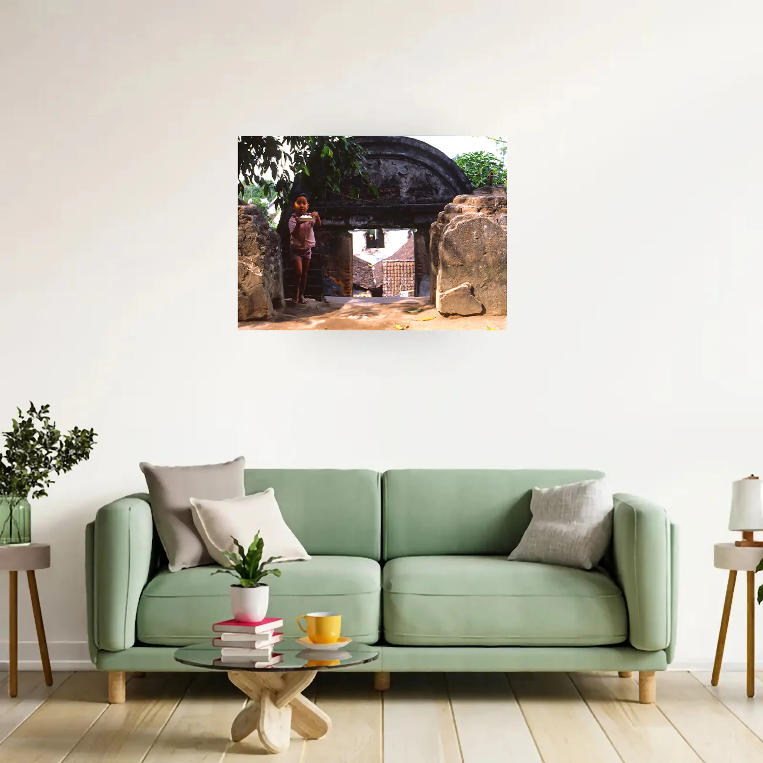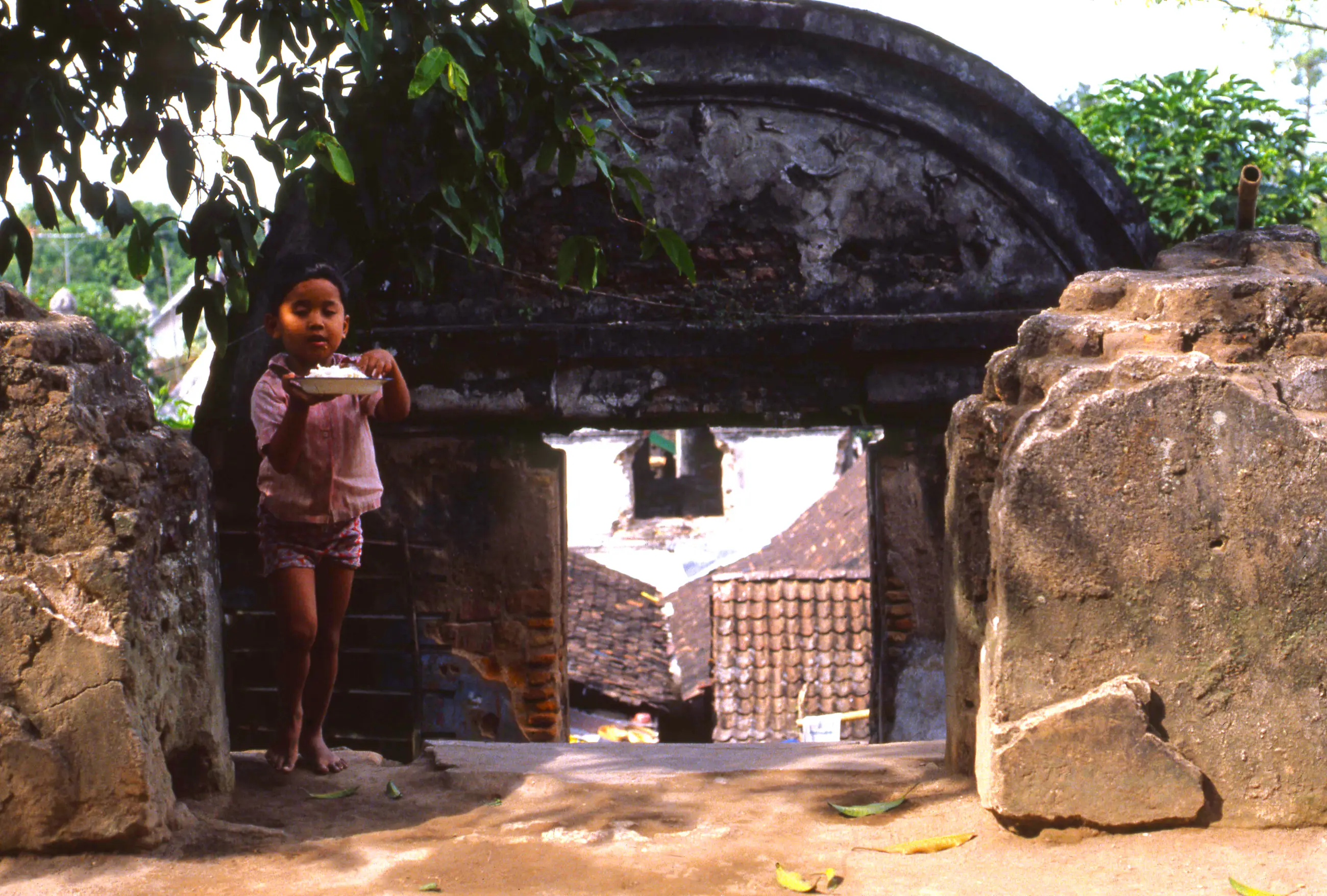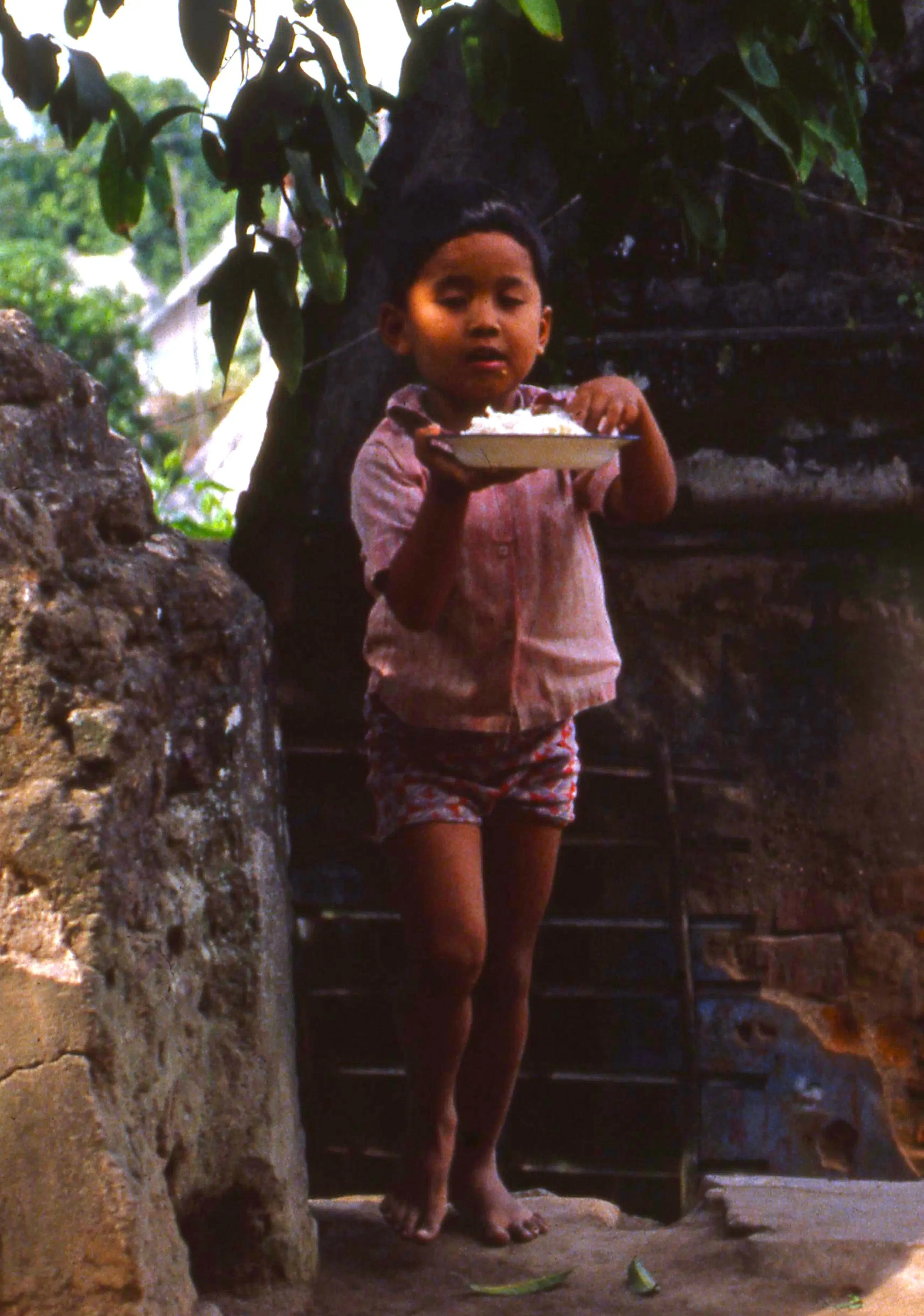 Voorstelling van een kind etend van een bordje rijst in handen buiten de toegangspoort naar het Paleisvan de Sultan in Yogjakarta (Indonesie)