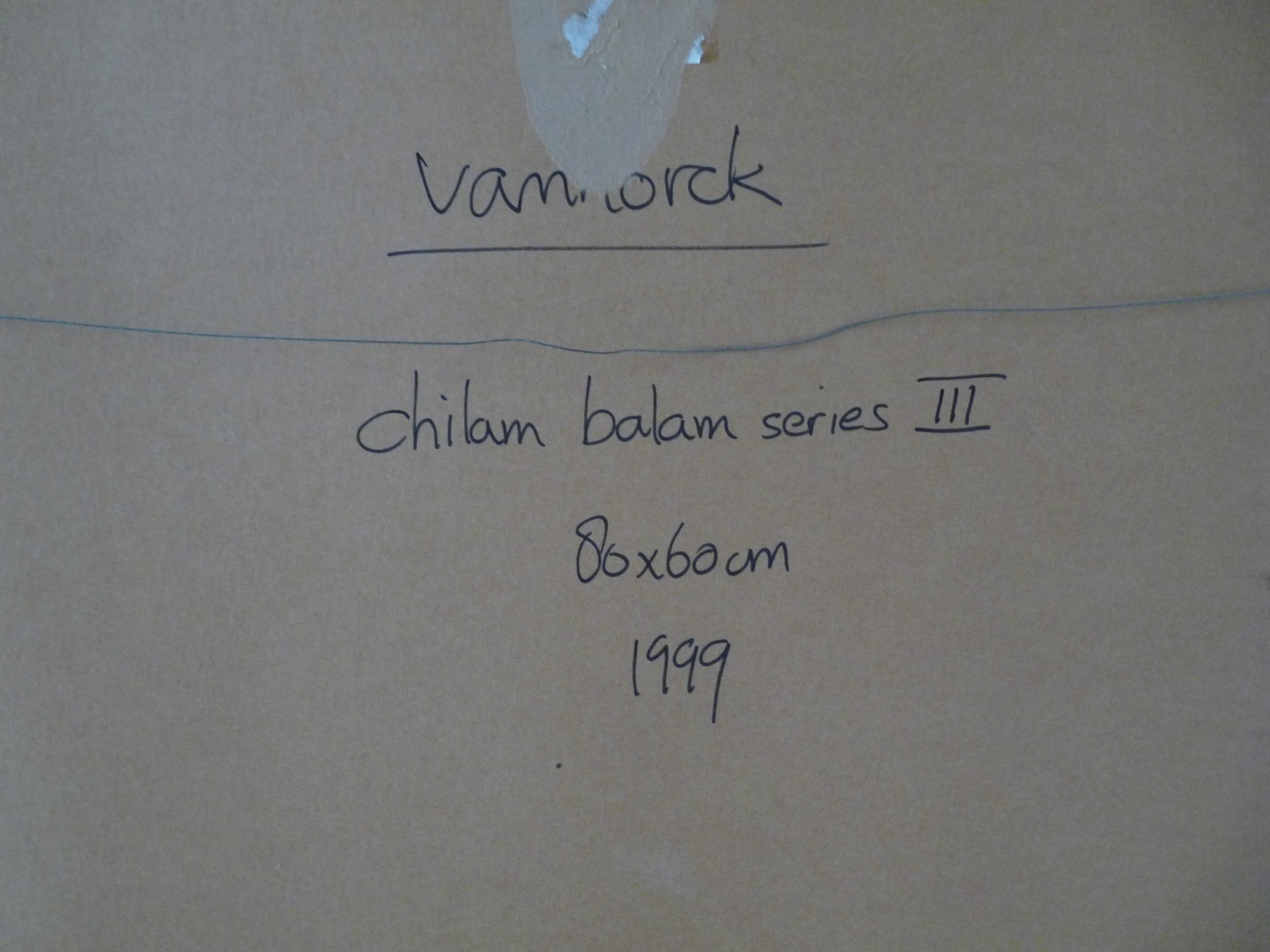 Fraaie gouache uit de serie CHILAM BALAM uit 1999. Mooie bijpassende zilverkleurige lijst met lichte gebruikssporen. Schilderij kan zo aan de muur. Voormalige galerieprijs € 2275,--