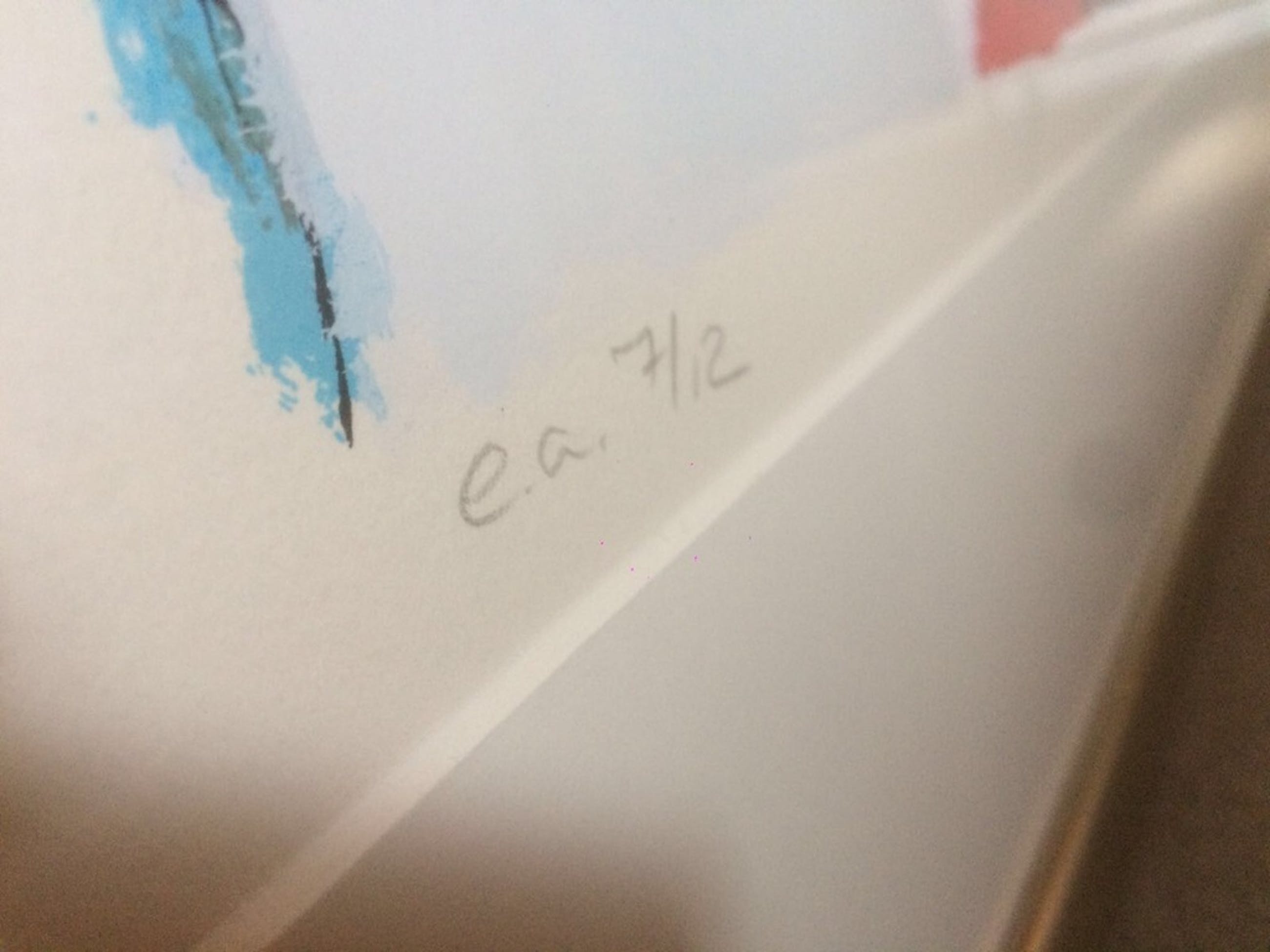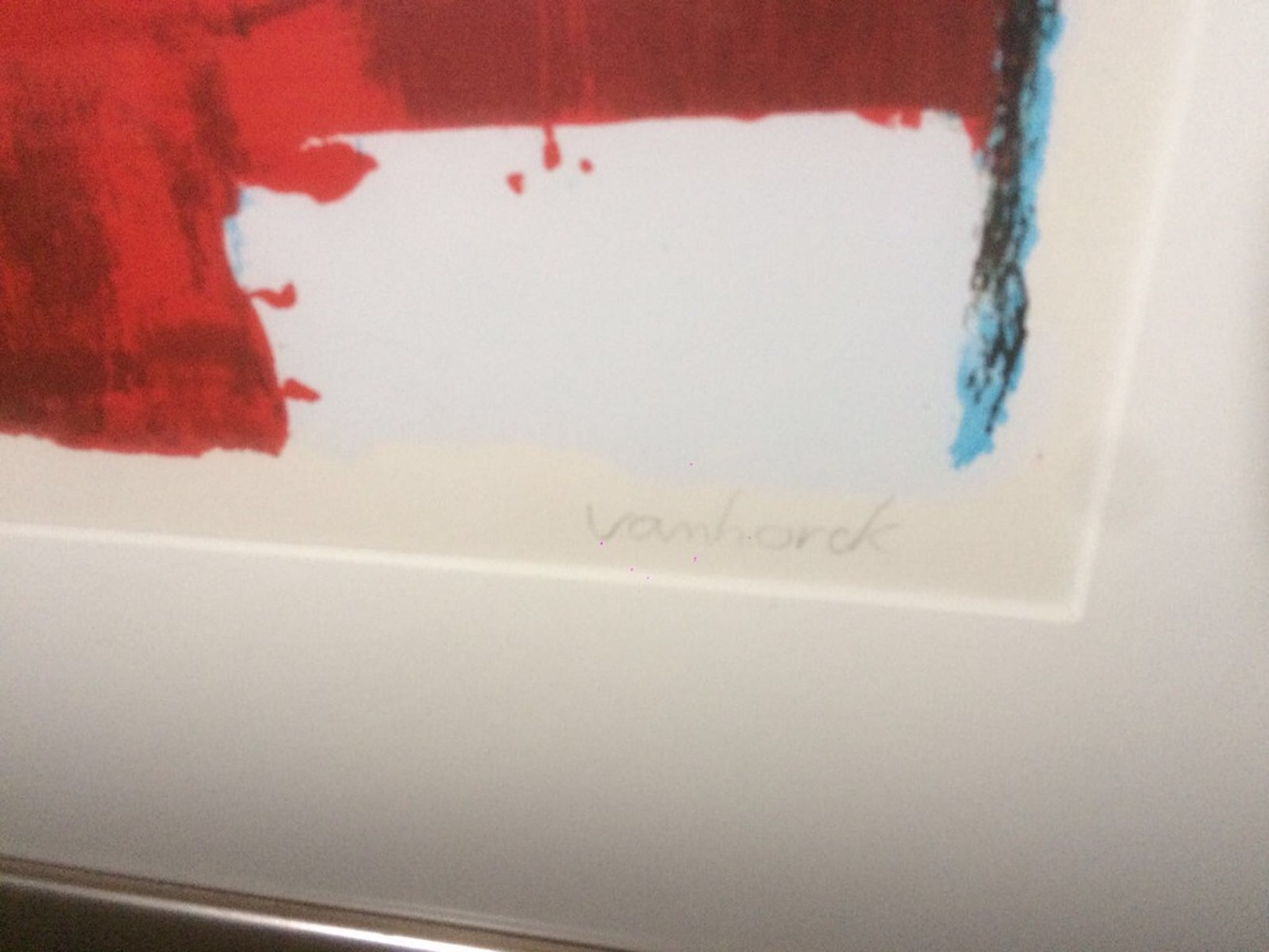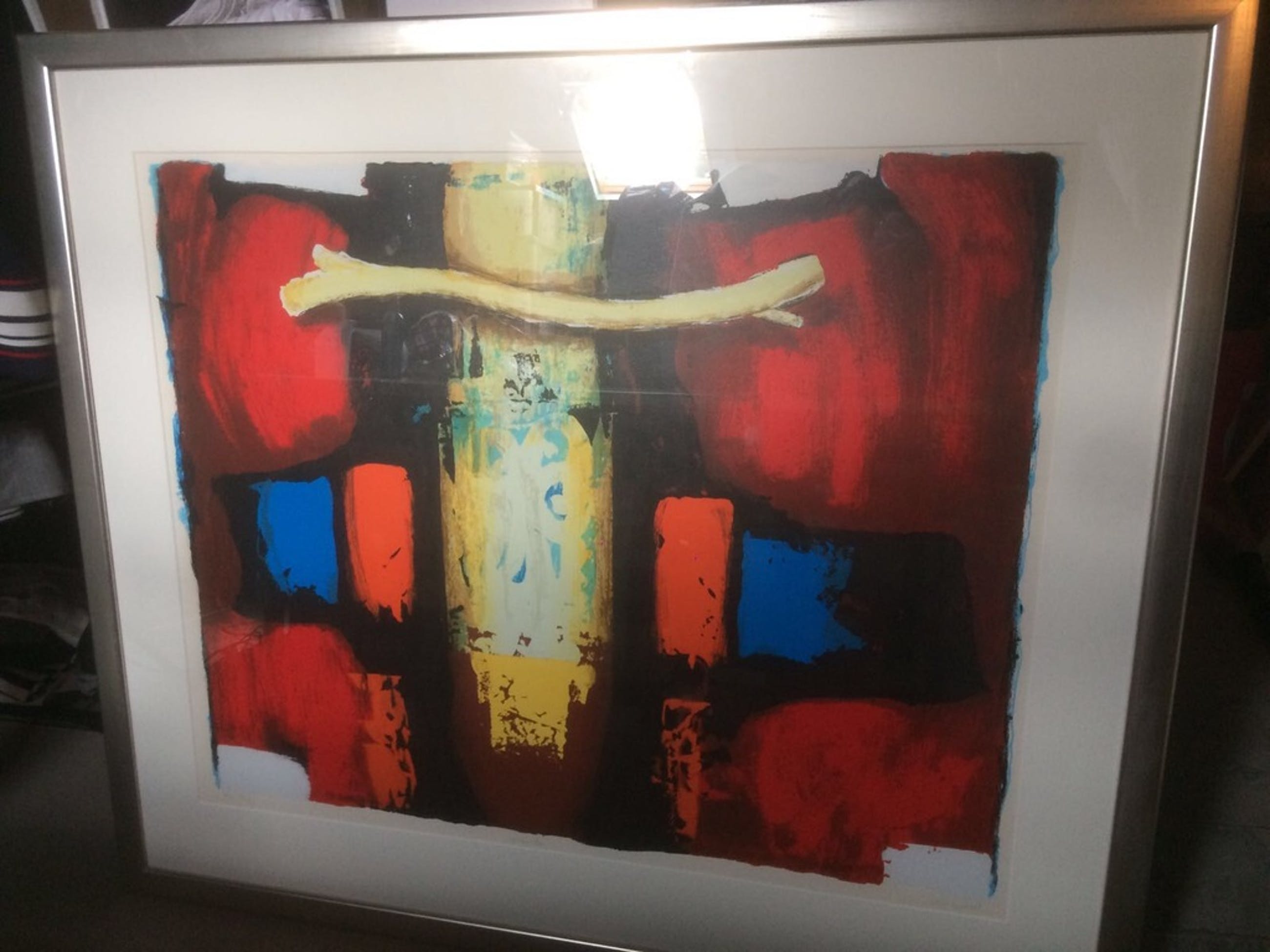 Zeefdruk van Hans Vanhorck, titel Orenda. Afmeting 1.32 m x 1.14 m. Is ingelijst, echter lijst is met verhuizing beschadigd. Reden van verkoop: past niet meer in inrichting.