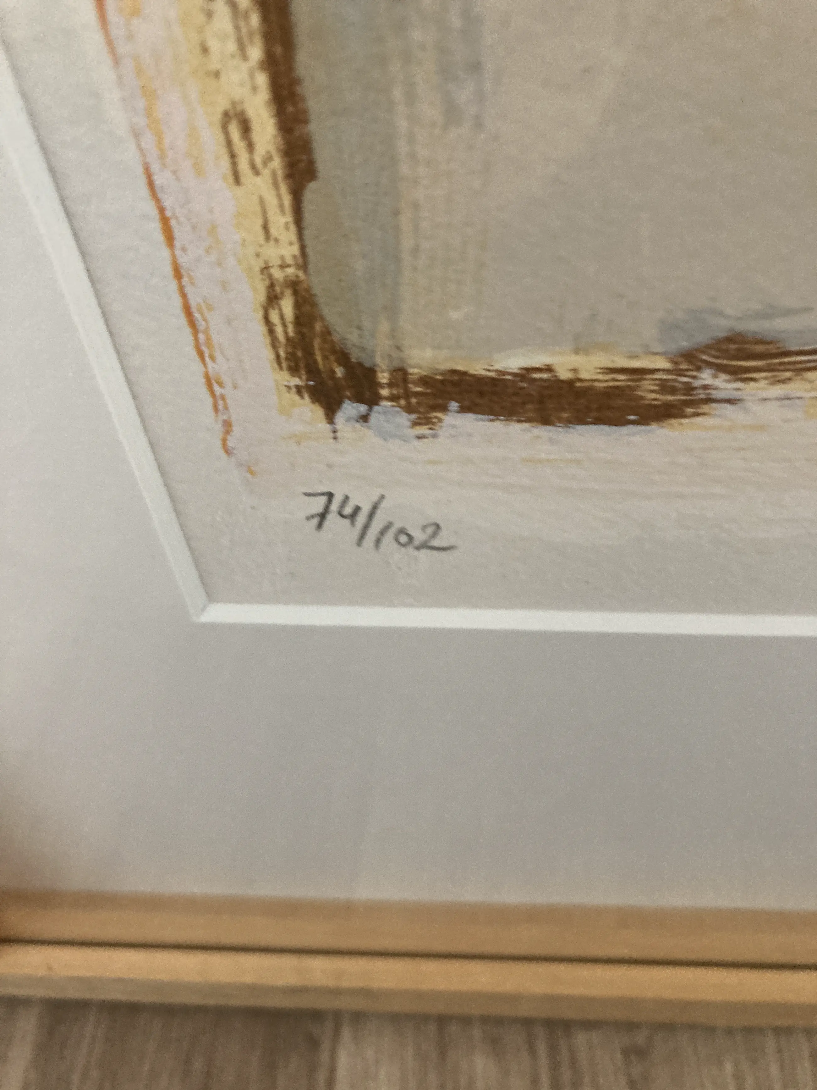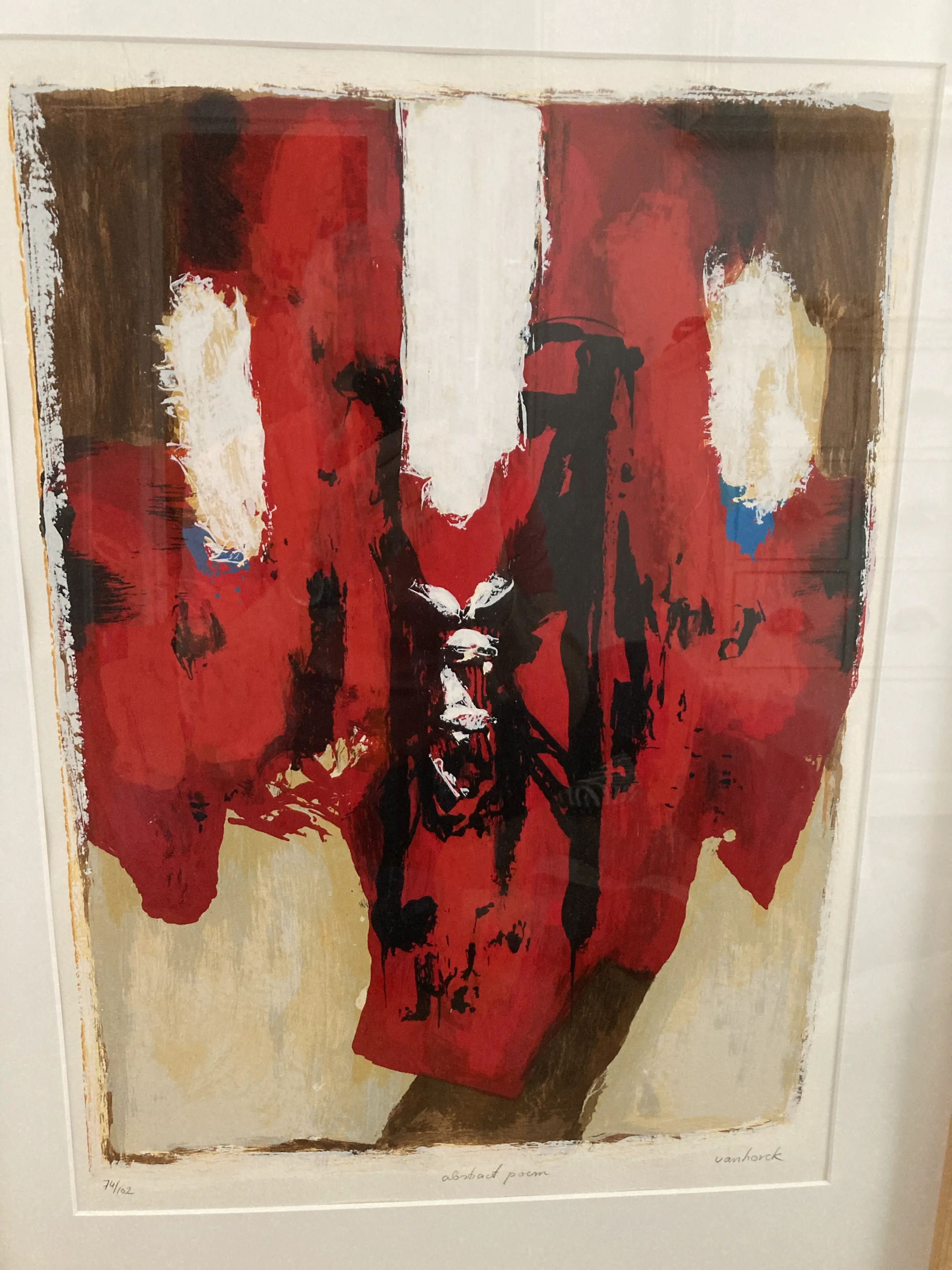 Mooie zeefdruk van Hans Vanhorck. Met l.o. 74/102 met potlood, in het midden ‘Abstract Poem ‘ met potlood en r.o. Vanhorck met potlood. Dezeegdruk zit in een blank houten Barth lijst ( b 2,5 cm en h 3,5 cm ).
