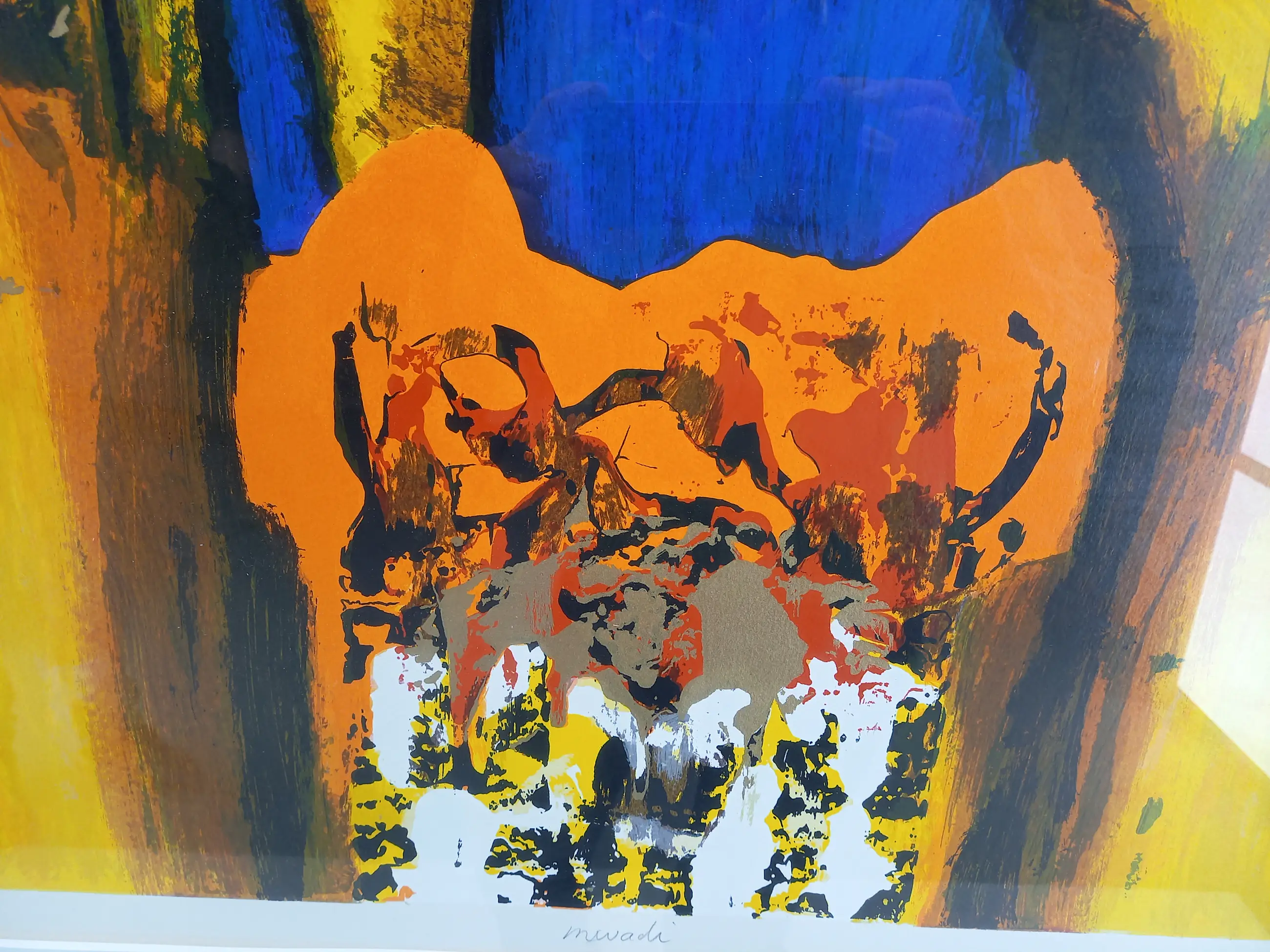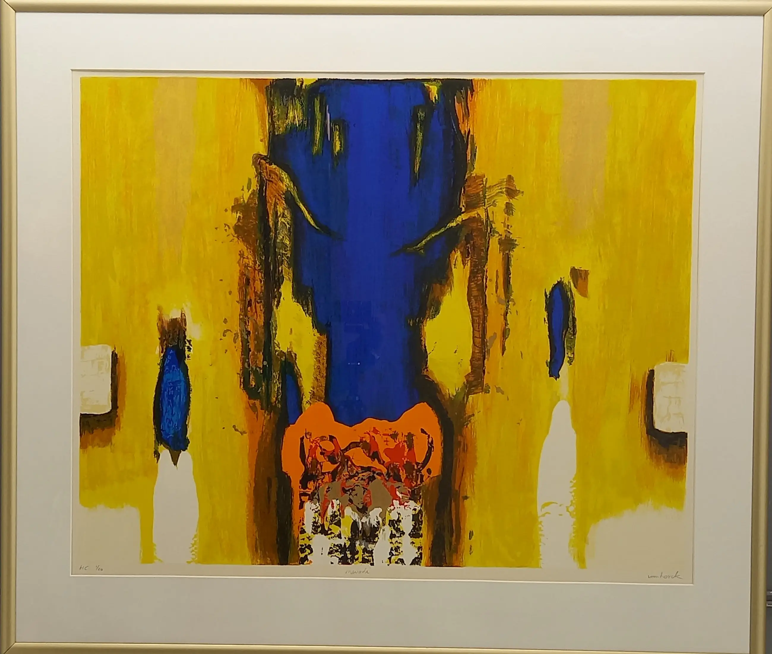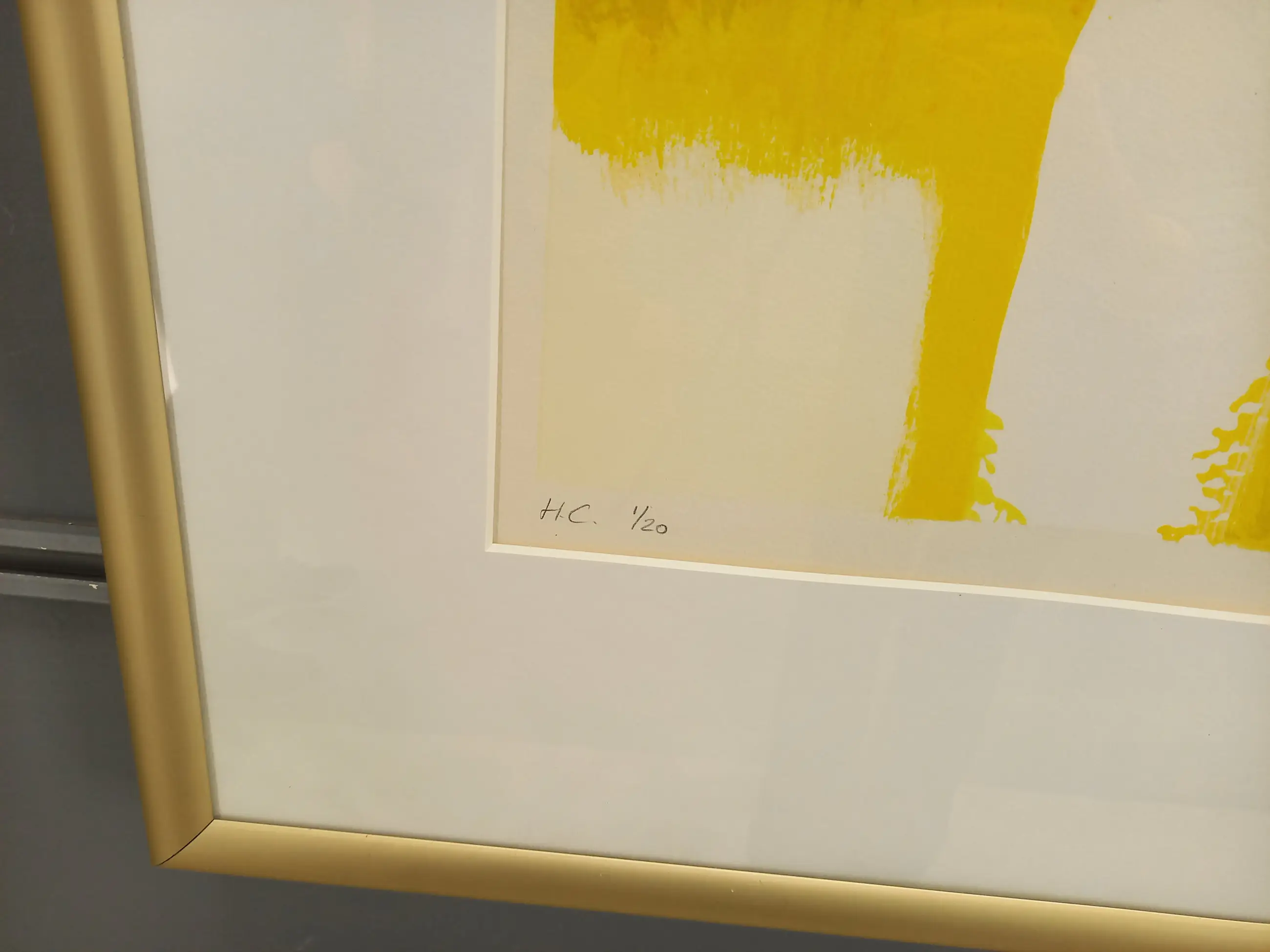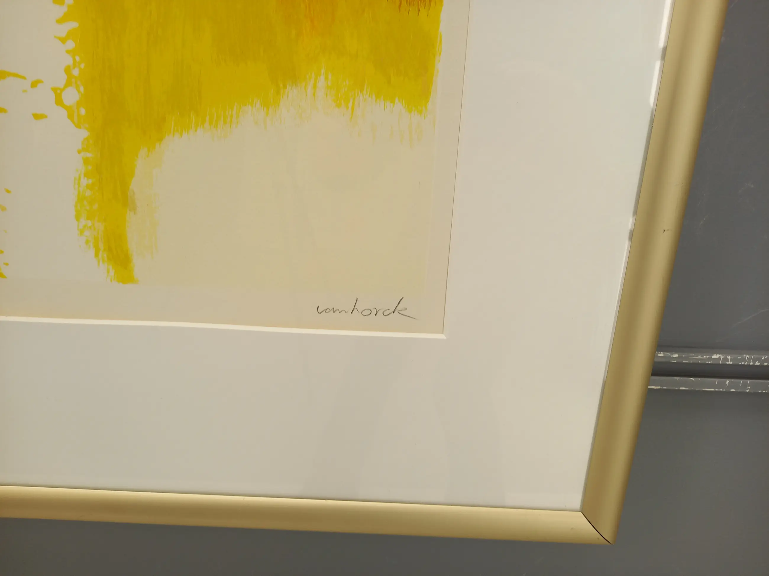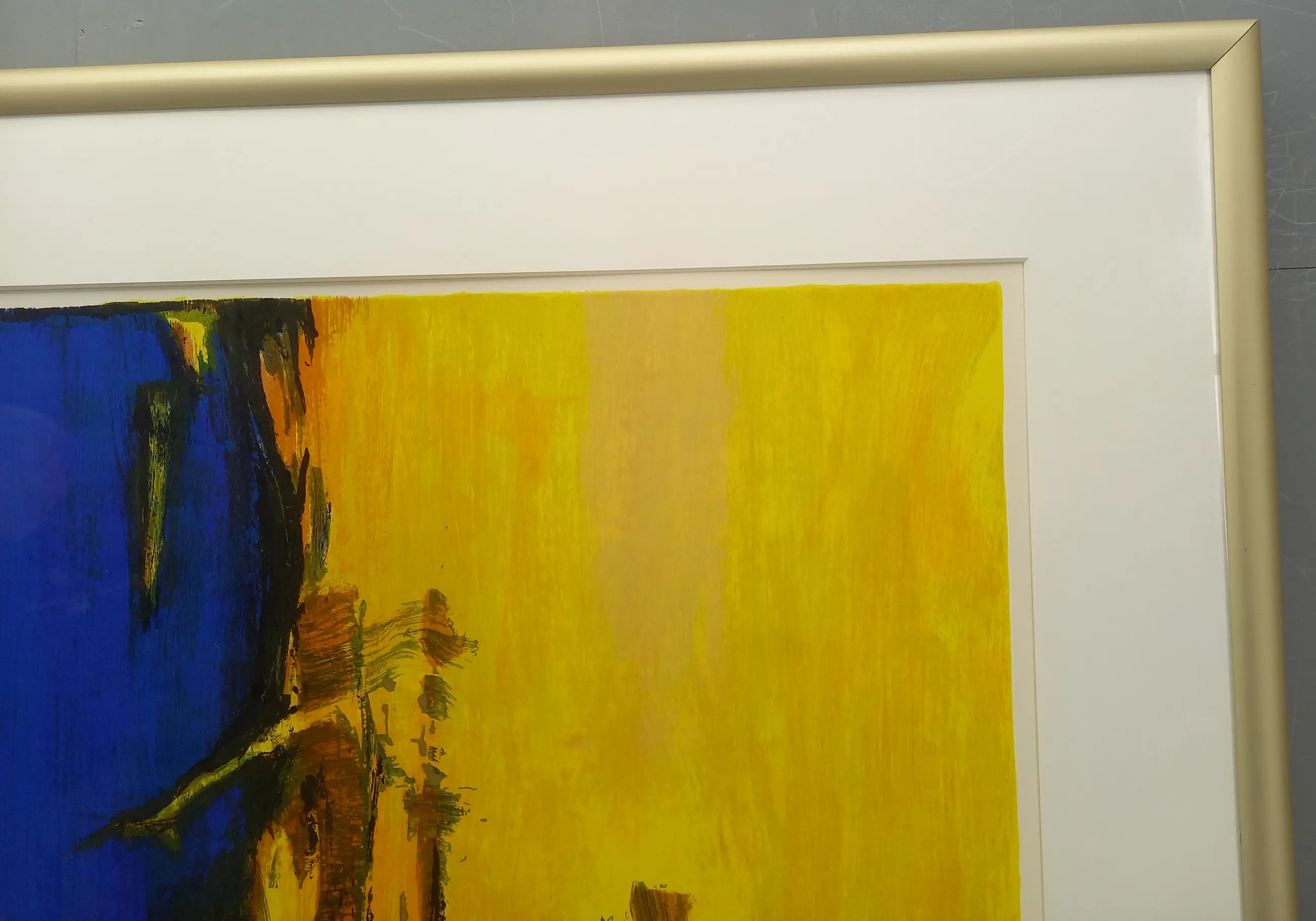 Zeer groot werk. Ingelijst met plexiglas, scheelt aanzienlijk in gewicht. Goudkleurige lijst.