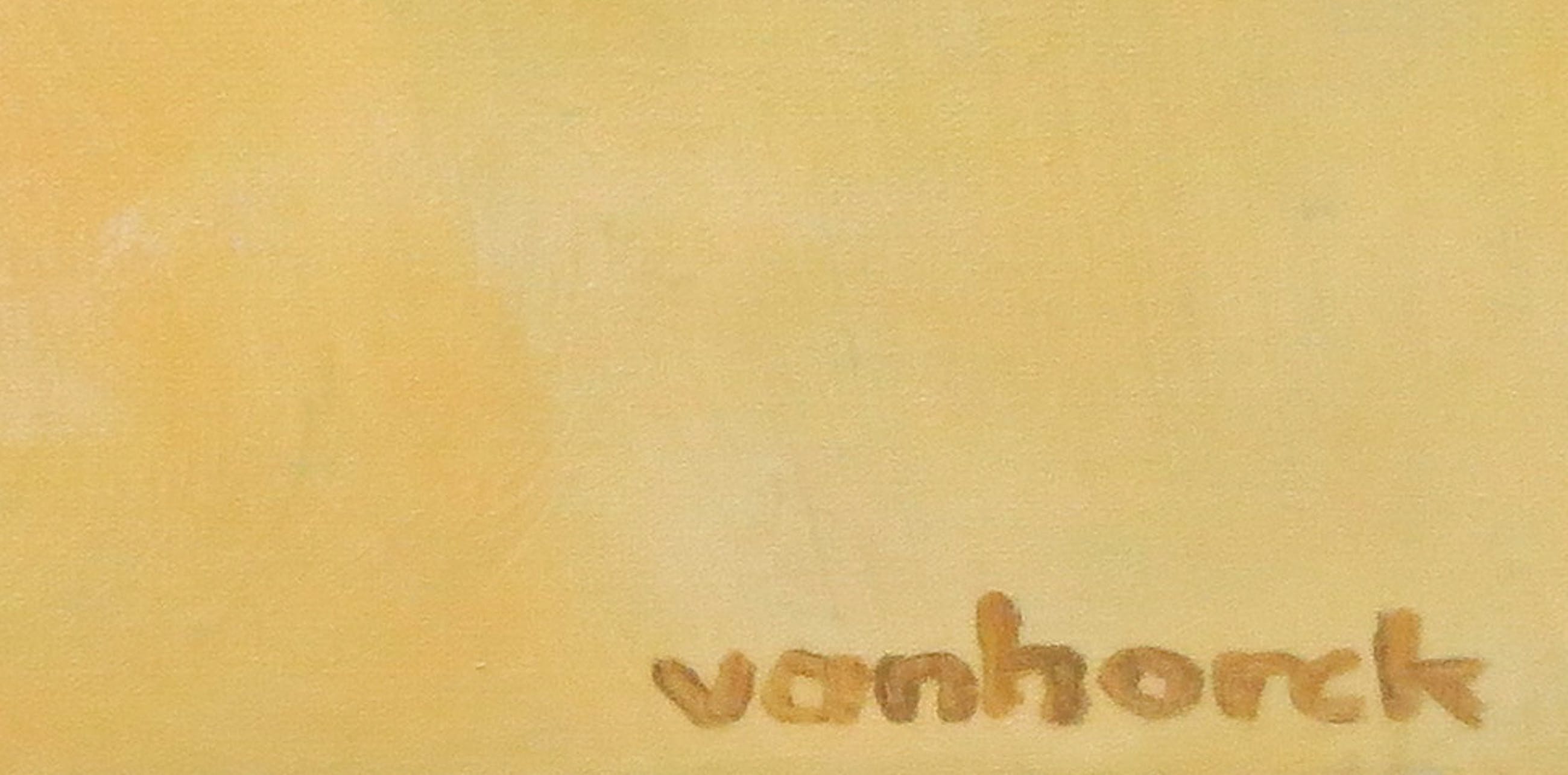 | Met wat lichte slijtage langs de randen en hoeken, met op een enkel plekje licht verfverlies. In de hoeken trekt het doek een beetje, door het gewicht van de verf. Door het spieraam wat op te spannen, wordt dit verholpen. Wat lichte craquelé in het midden van het werk. | |