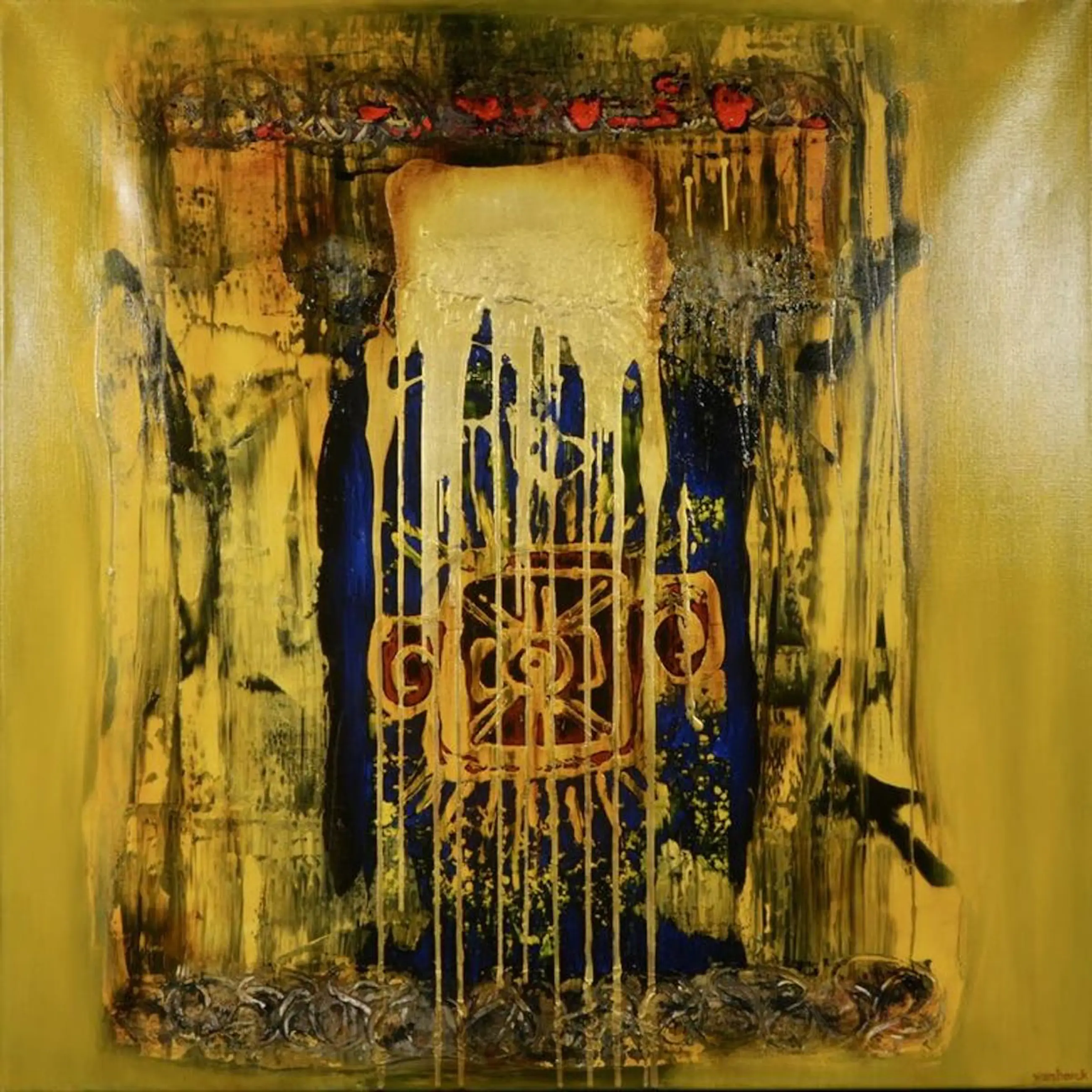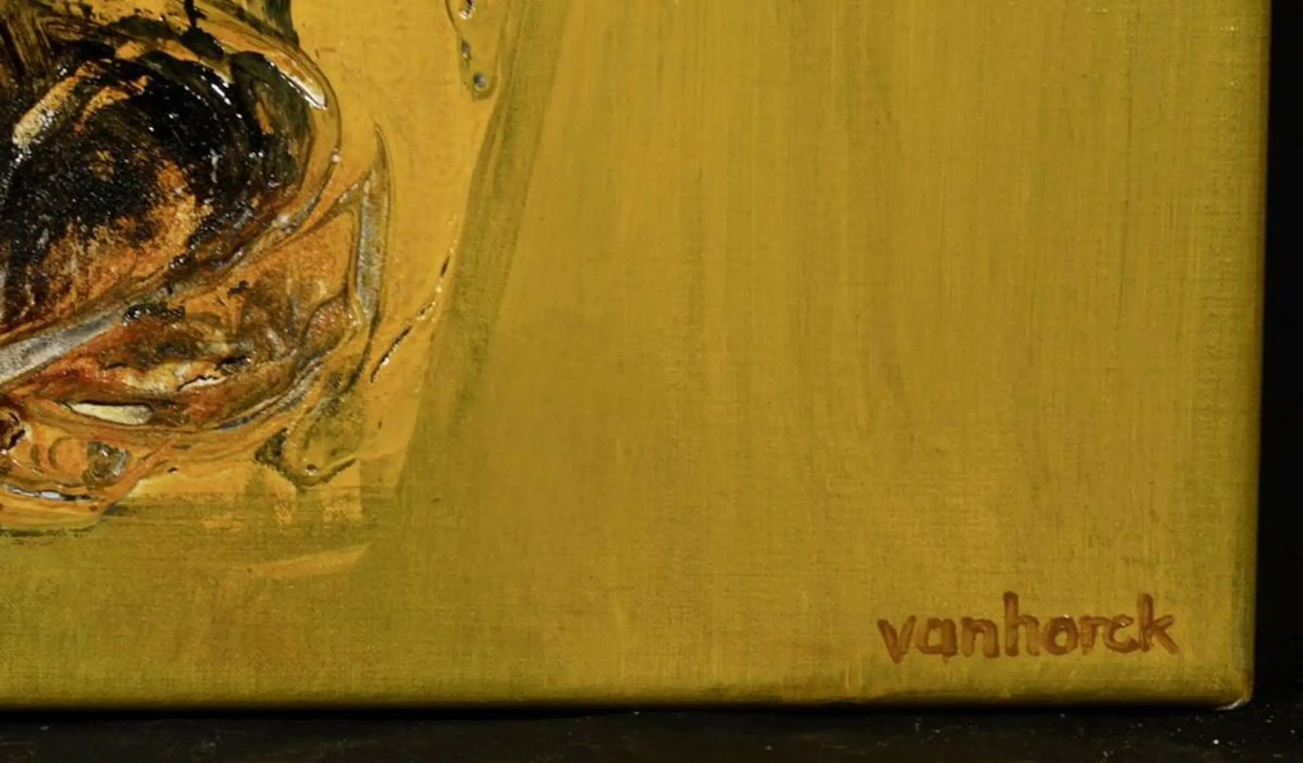 Omschrijving Titel: De avondster Jaartal: 1999 Afmetingen lijst: 120,5 cm x 120 cm Gesigneerd: Ja, met verf (rechtsonder) en verso Materiaal: Olieverf op doek Ingelijst: Nee Conditie: In zeer goede staat