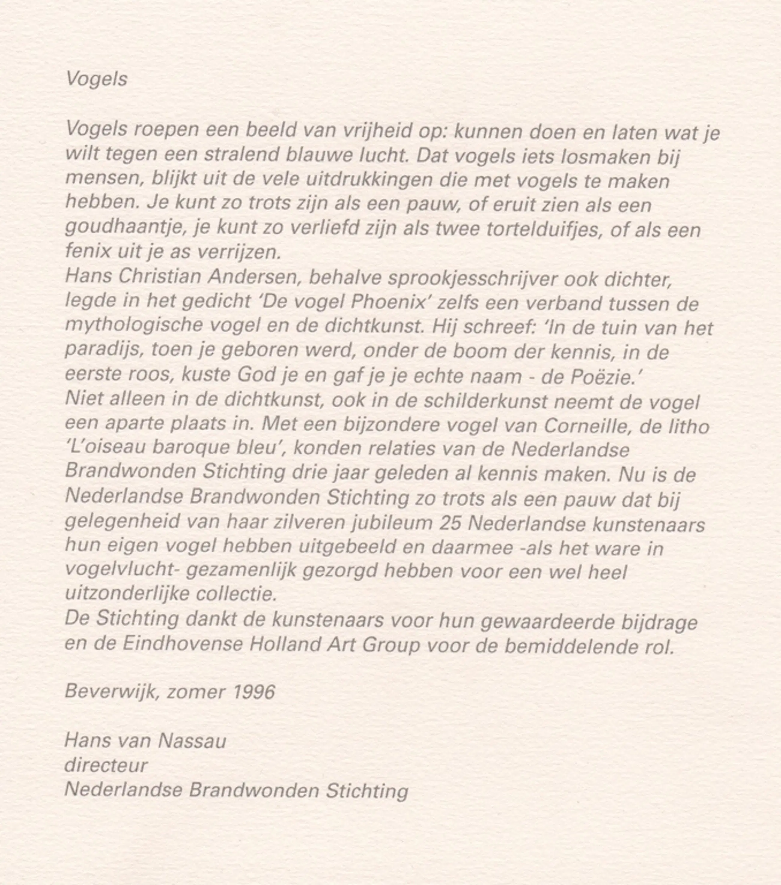 In 1996 uitgegeven ter ere van het 25-jarig bestaan van de Nederlandse brandwonden stichting. Voor deze gelegenheid hebben 25 kunstenaars hun interpretatie van een vogel vereeuwigd in een kunstwerk. De zeefdruk is gedrukt door Grafisch Atelier Peter Wilms op 250 grams arches velin papier. De oplage is zeer beperkt. Het gaat in totaal om 25 genummerde edities, 20 épreuve d'artistes en 10 hors commerce exemplaren. Deze zeefdruk is extreem zeldzaam. Alle kunstenaars hebben een complete box van 25 zeefdrukken ontvangen.