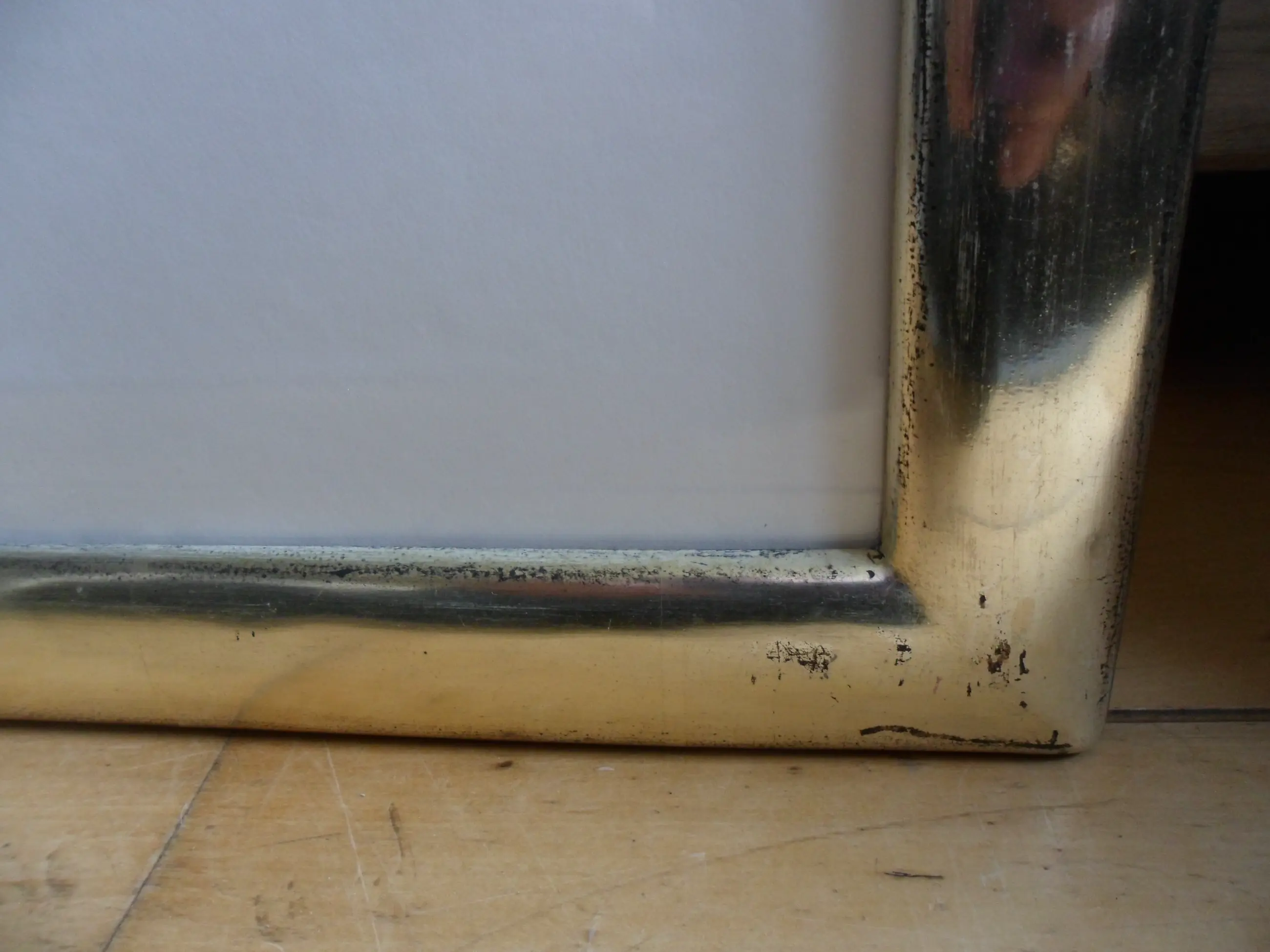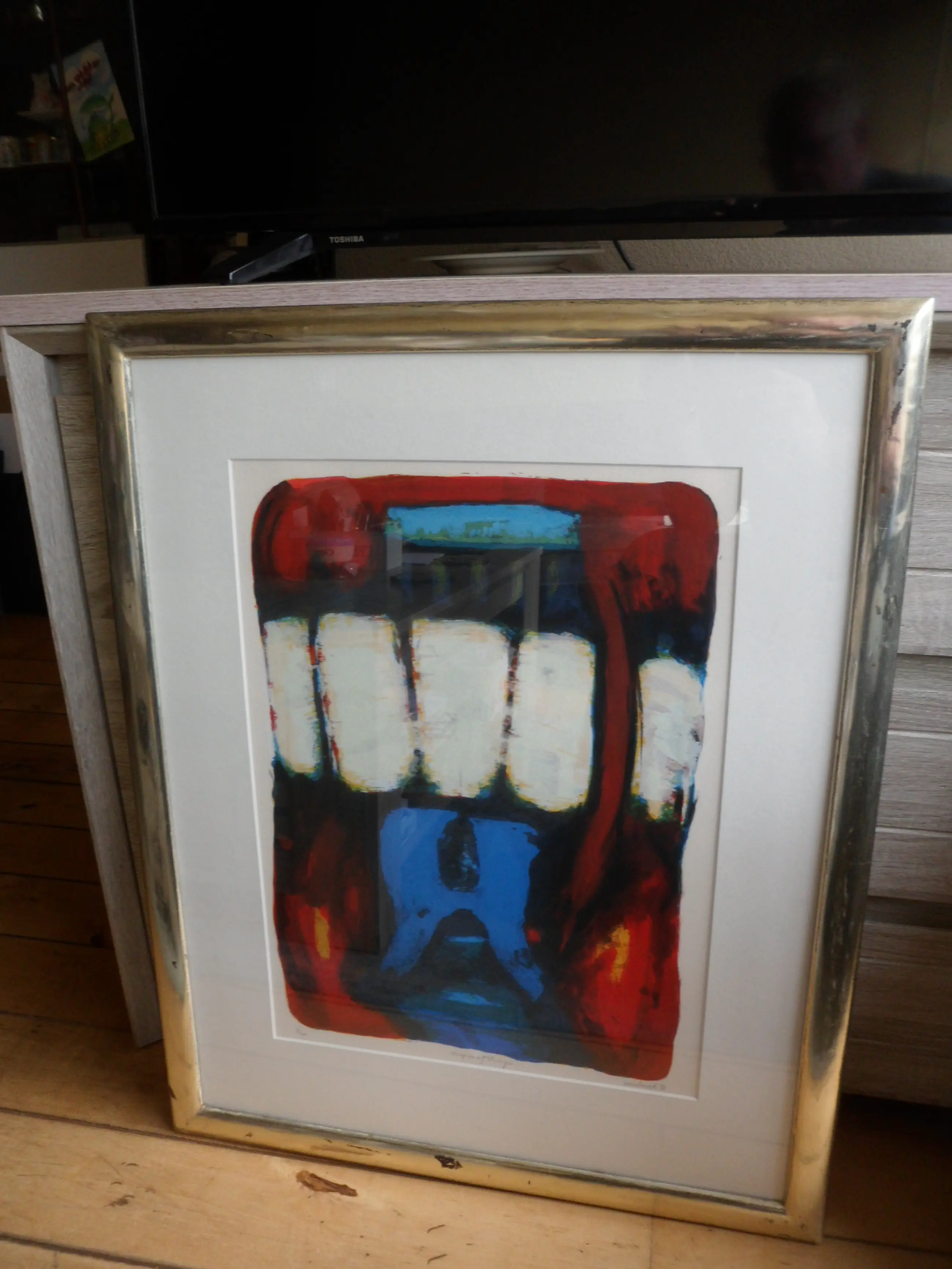 Zeefdruk is in zeer goede staat.De lijst weet ik niet of het schade is of dat de lijst zo hoort.Kijk de foto's voor een goede indruk.