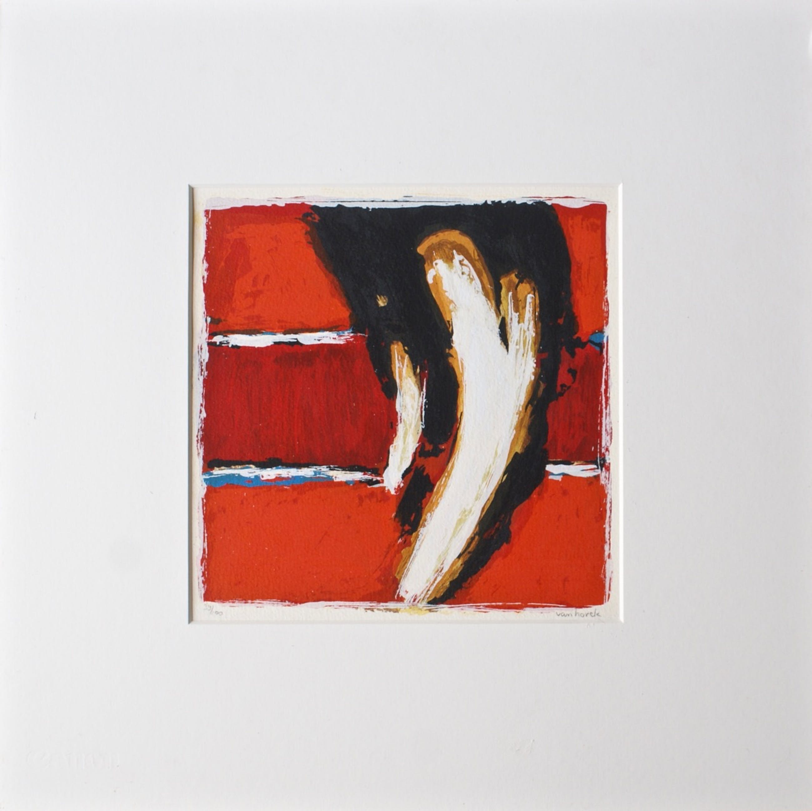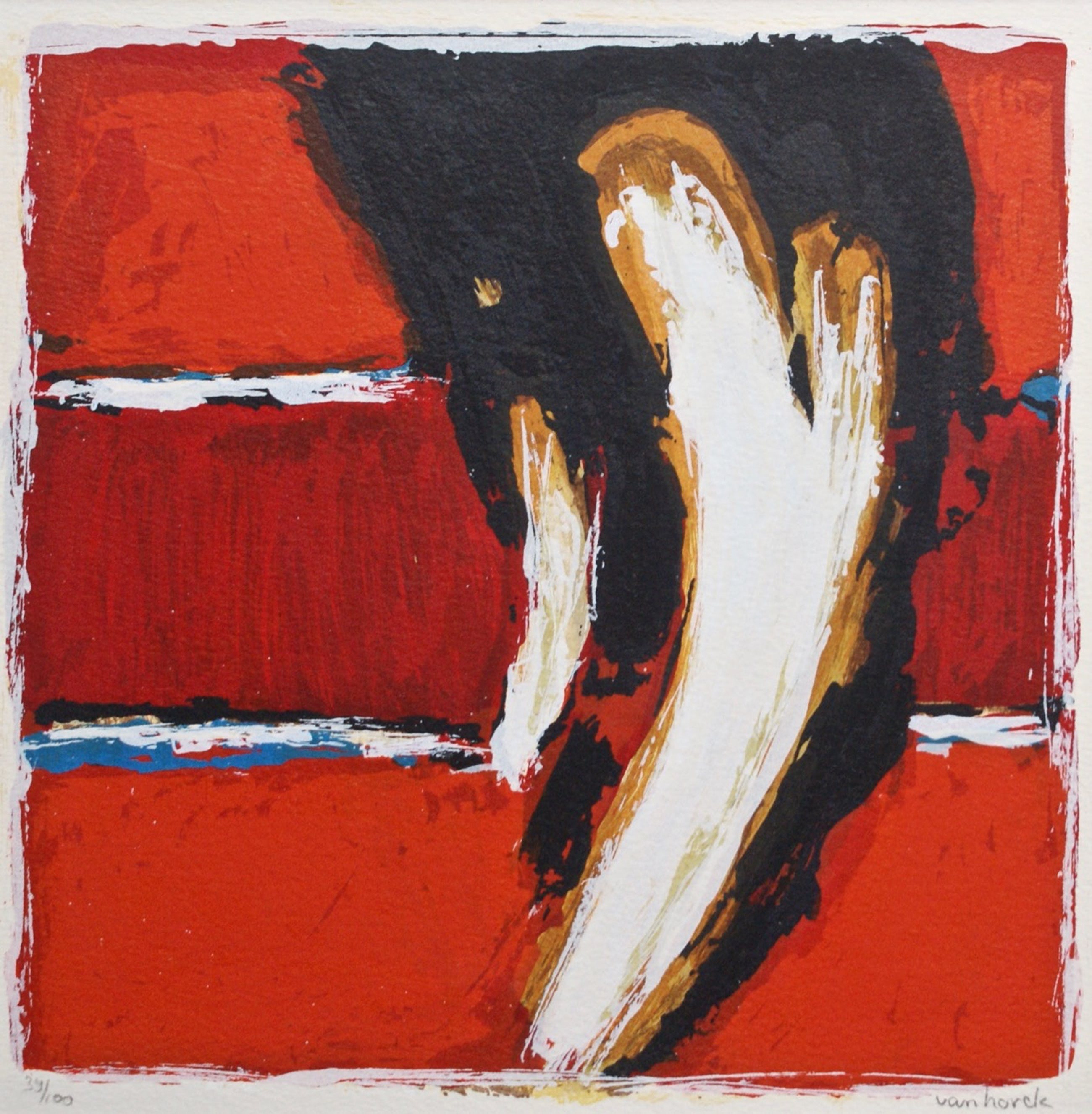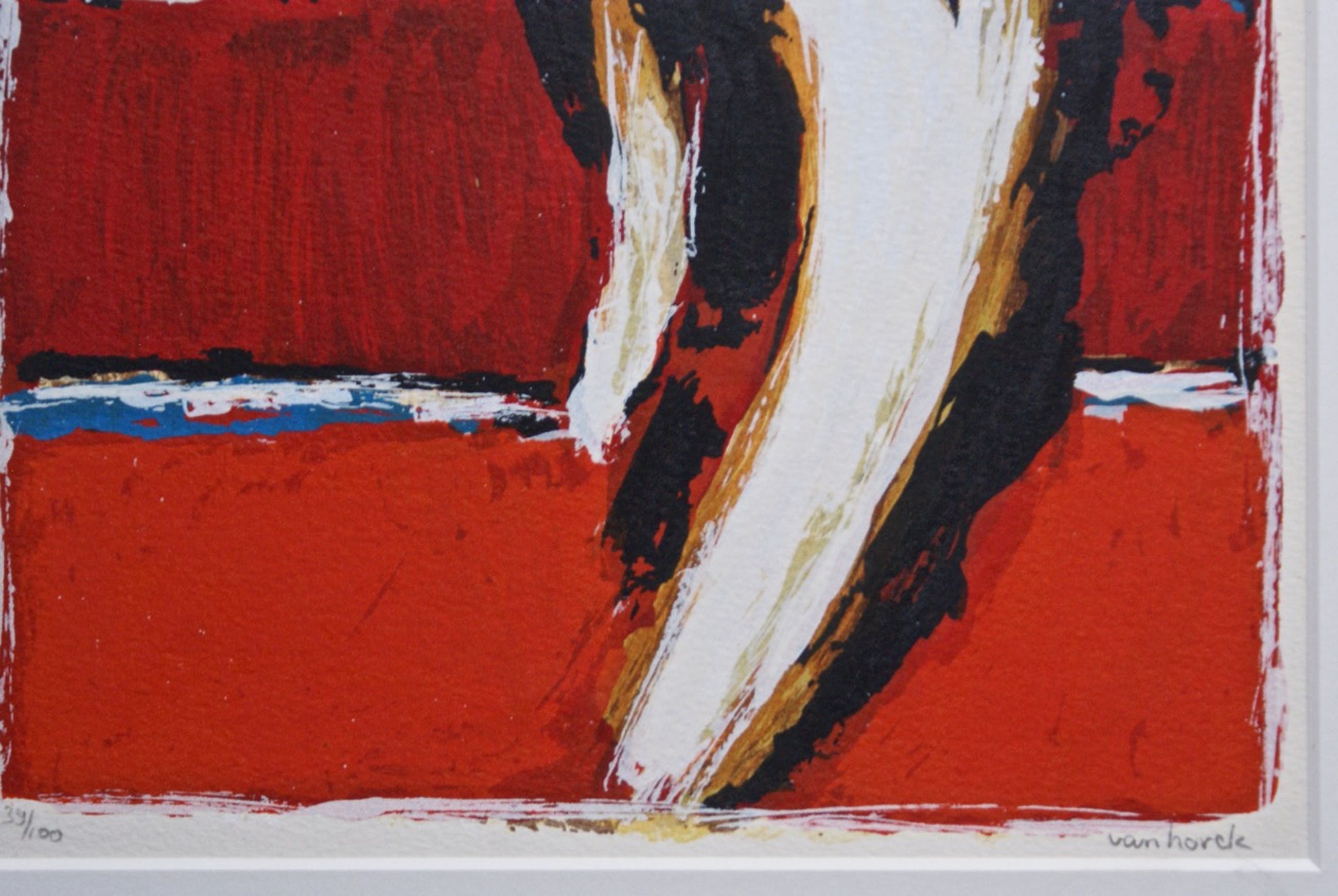 Een met intense kleuren uitgevoerd lithografischwerk van deze bekende kunstenaar. Het werkheeft verdere geen speciale titel meegekregen. Het werk is voorzien van luxe witte passe partout,is gesigneerd en is gezet in een stevige aluminiumwissellijst met slechts enkele gebruikerssporen.Die zijn er uit te schuren mocht U dat nodig achten.Het werk kan m.i. zo aan de muur. De litho's van Vanhorck worden regelmatig aange-boden bij Catawiki zodat U wat dat betreft een prima referentiekader kunt zoeken voor wat betreft prijzen.