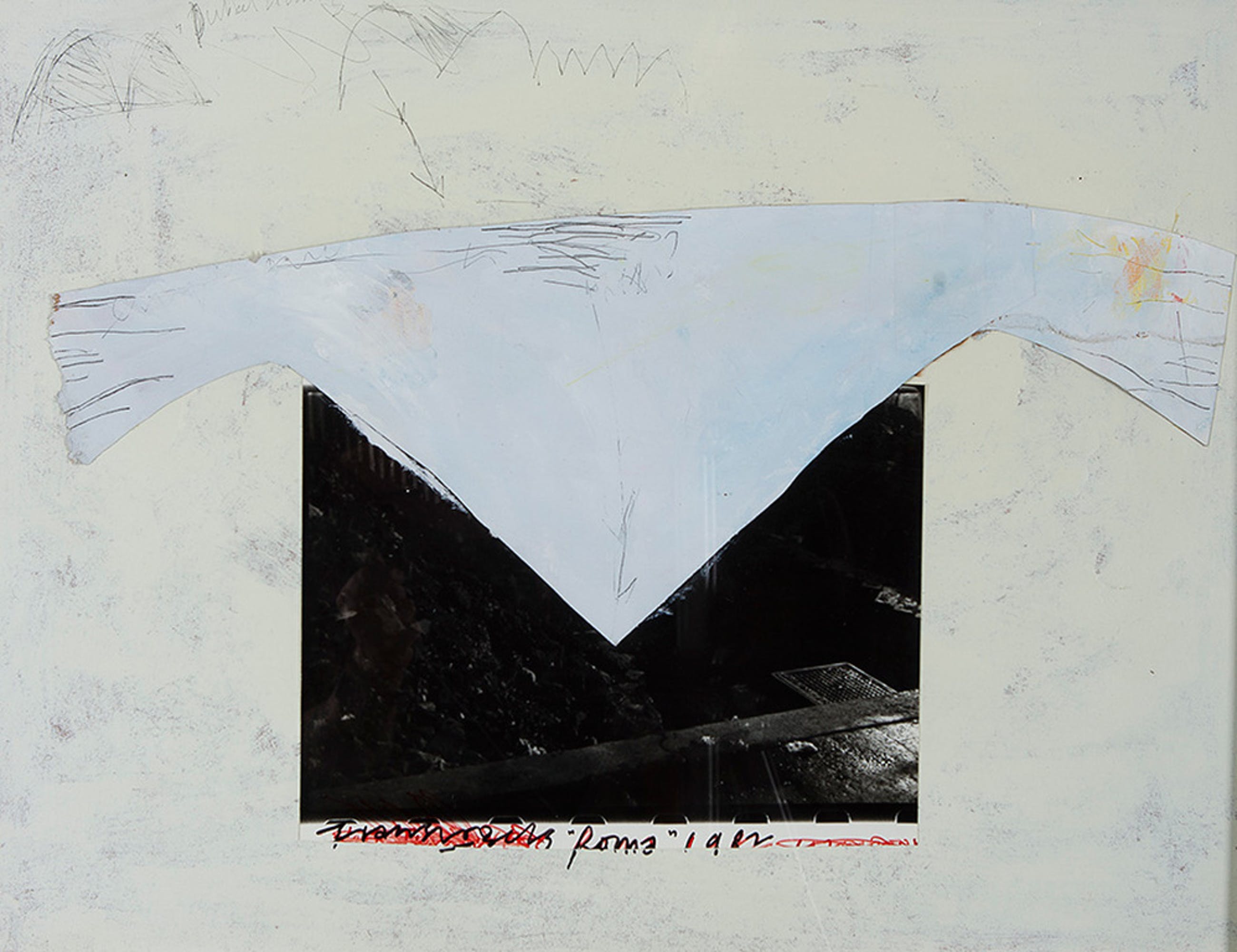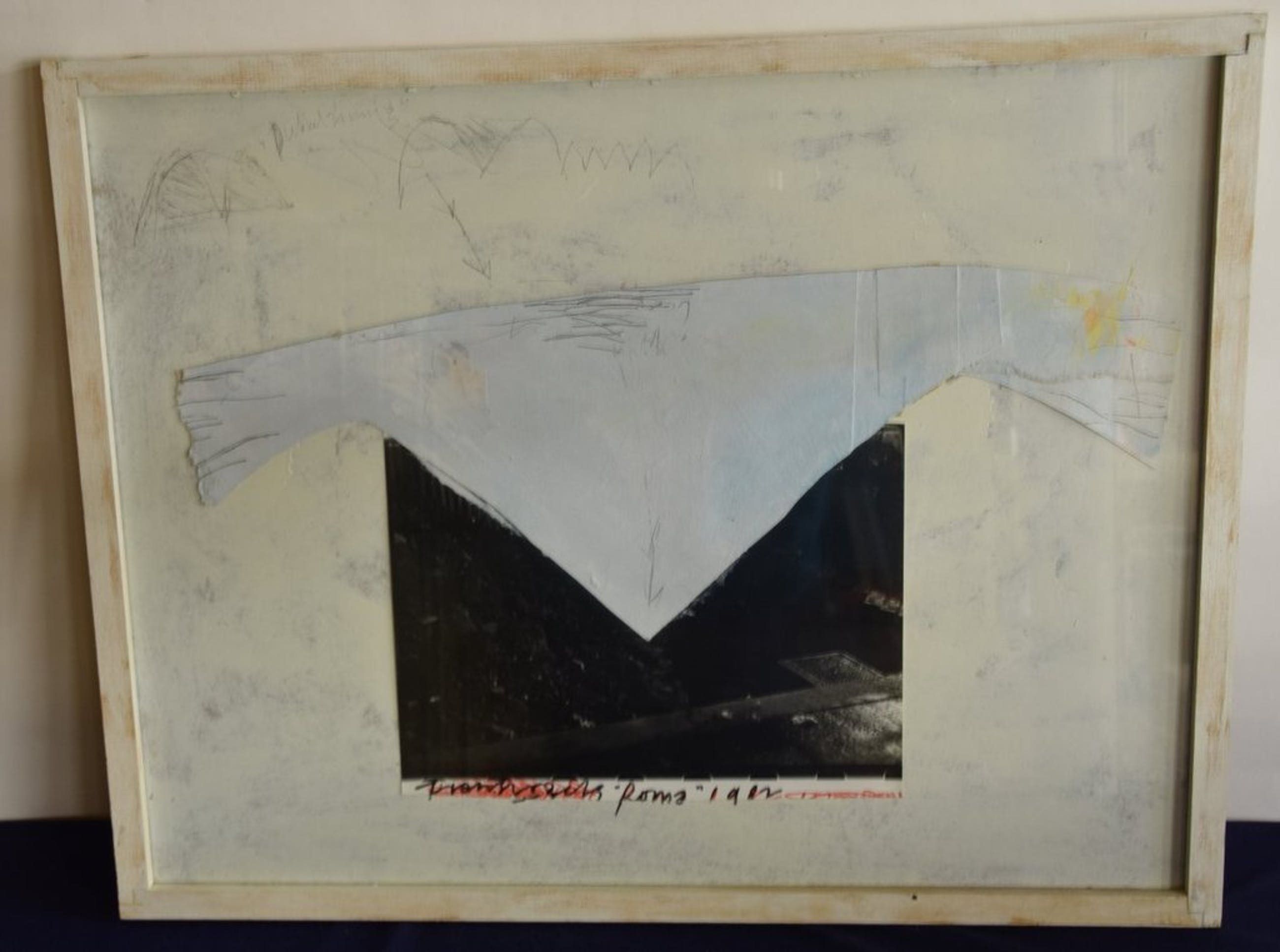 Techniek: Collage met fotoprint, viltstift, lakverf, acrylverf en potlood op karton en hardboard in kunstenaarslijst.