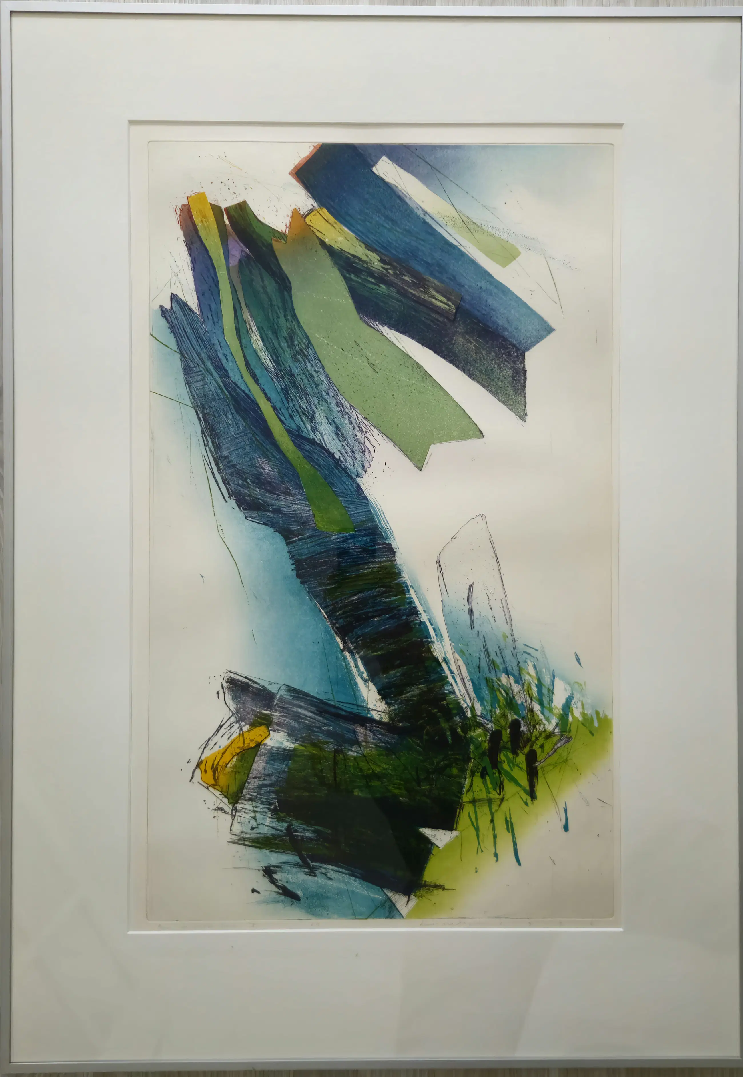 Ets in metalen lijst. Abstracte voorstelling van zwarte lijnen en kleurrijke accenten voor een blauwe achtergrond.
