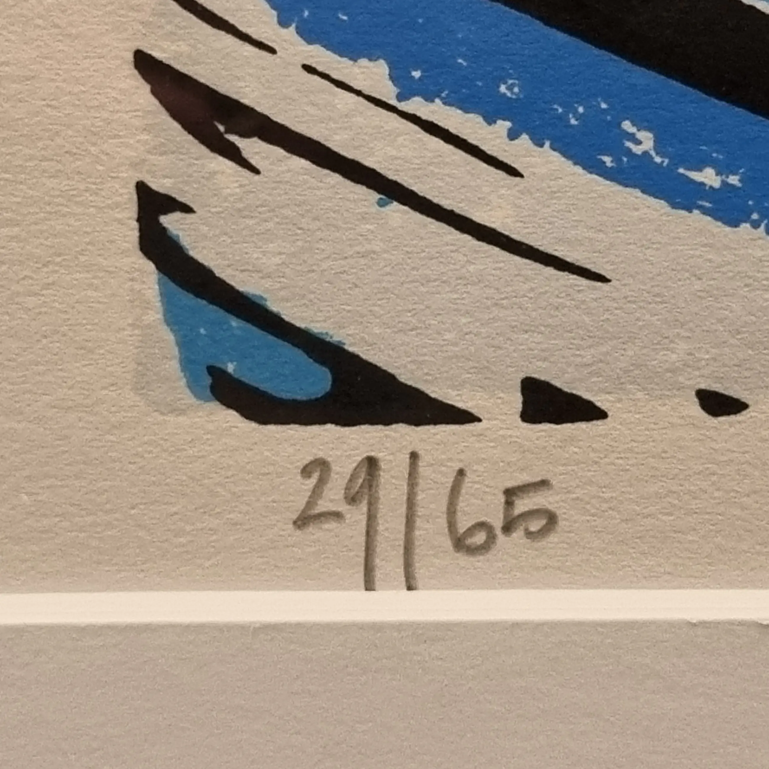 Het werk is professioneel ingelijst met een passe-partout in een strakke aluminium lijst, wat het een moderne en verzorgde uitstraling geeft.