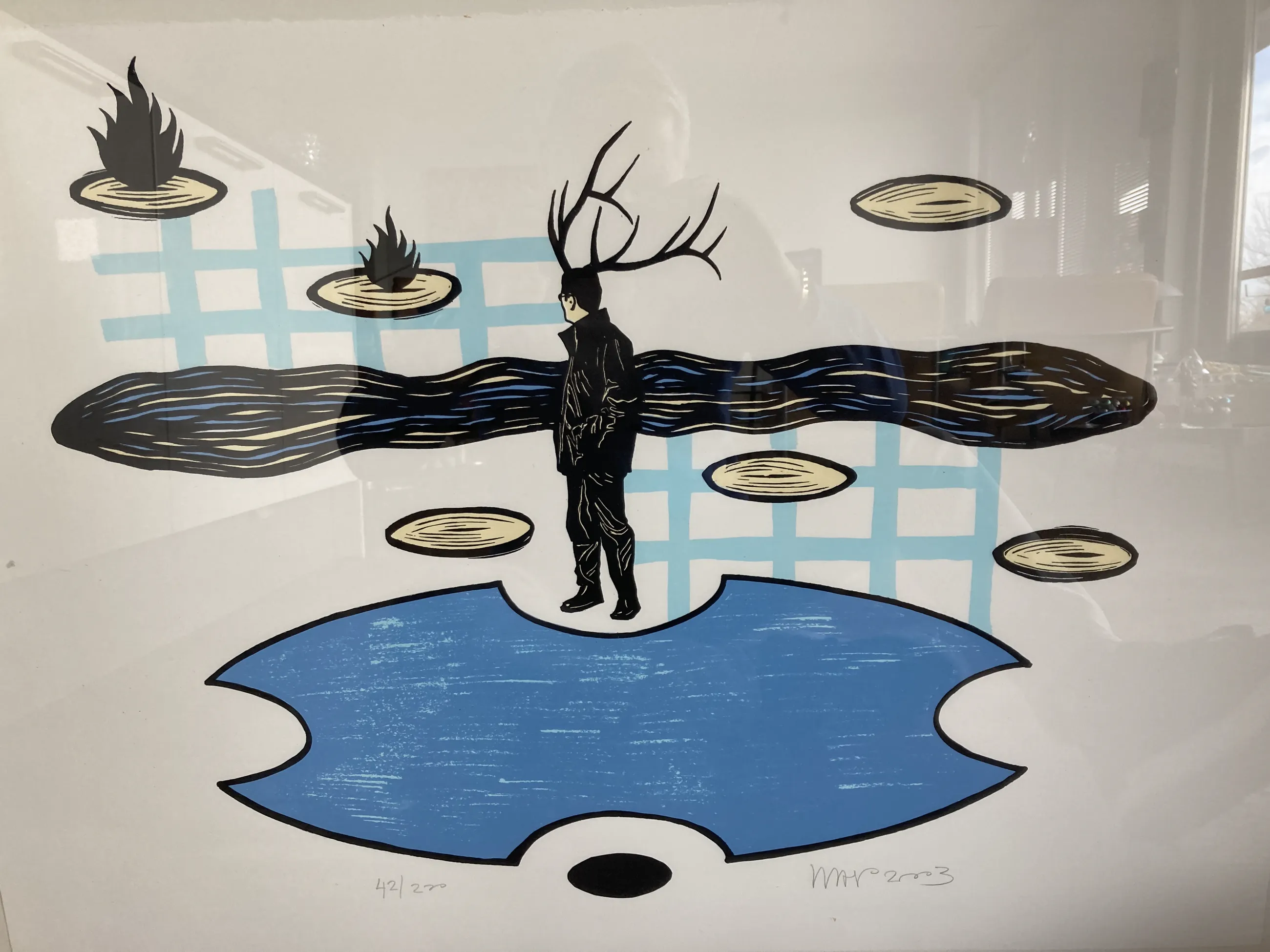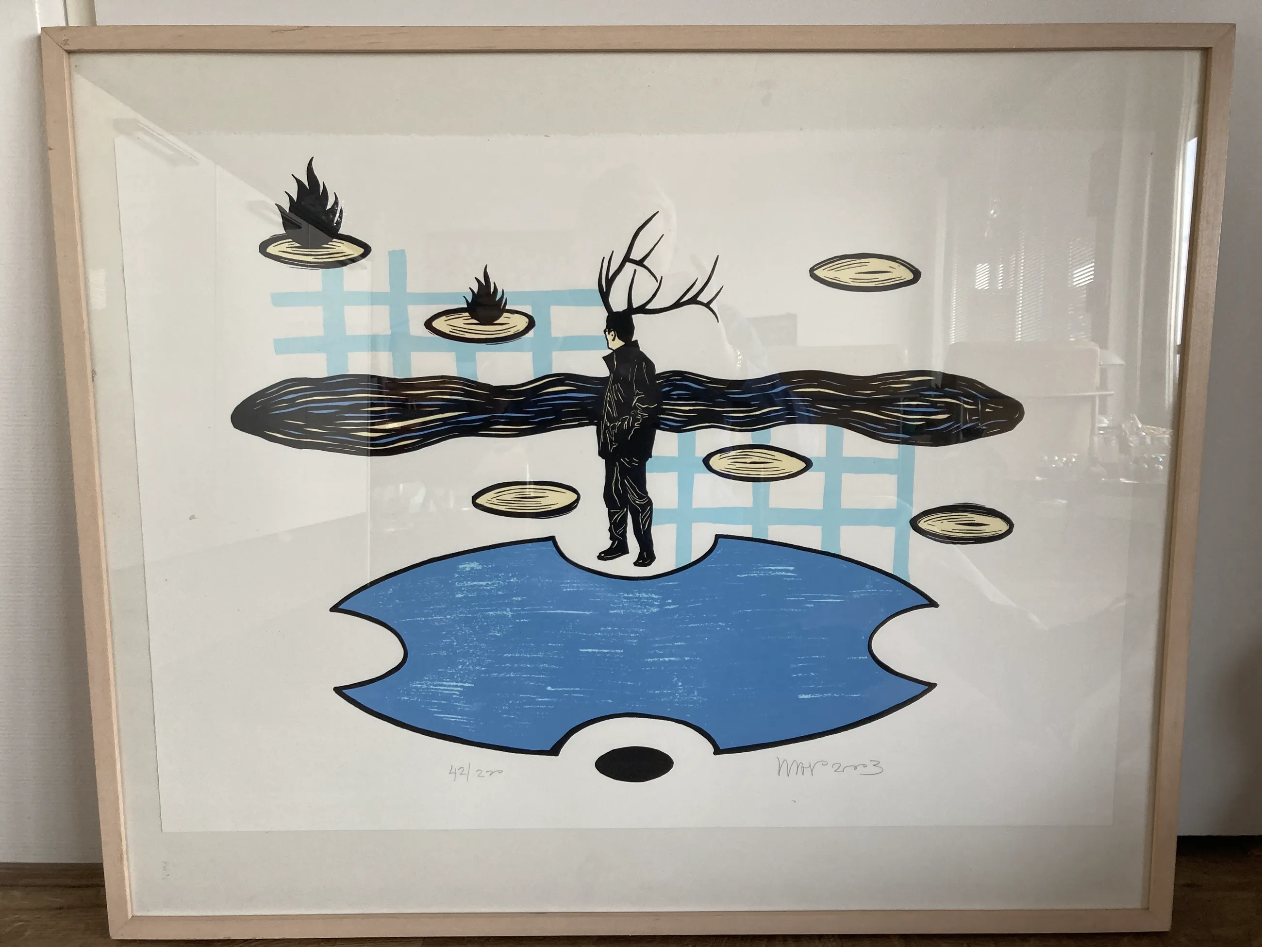 Fraaie zeefdruk in een blank houten lijst (h 3 cm en b 1,5 cm). Met l.o.42/200 met potlood en r.o.WAP 2003 met potlood.