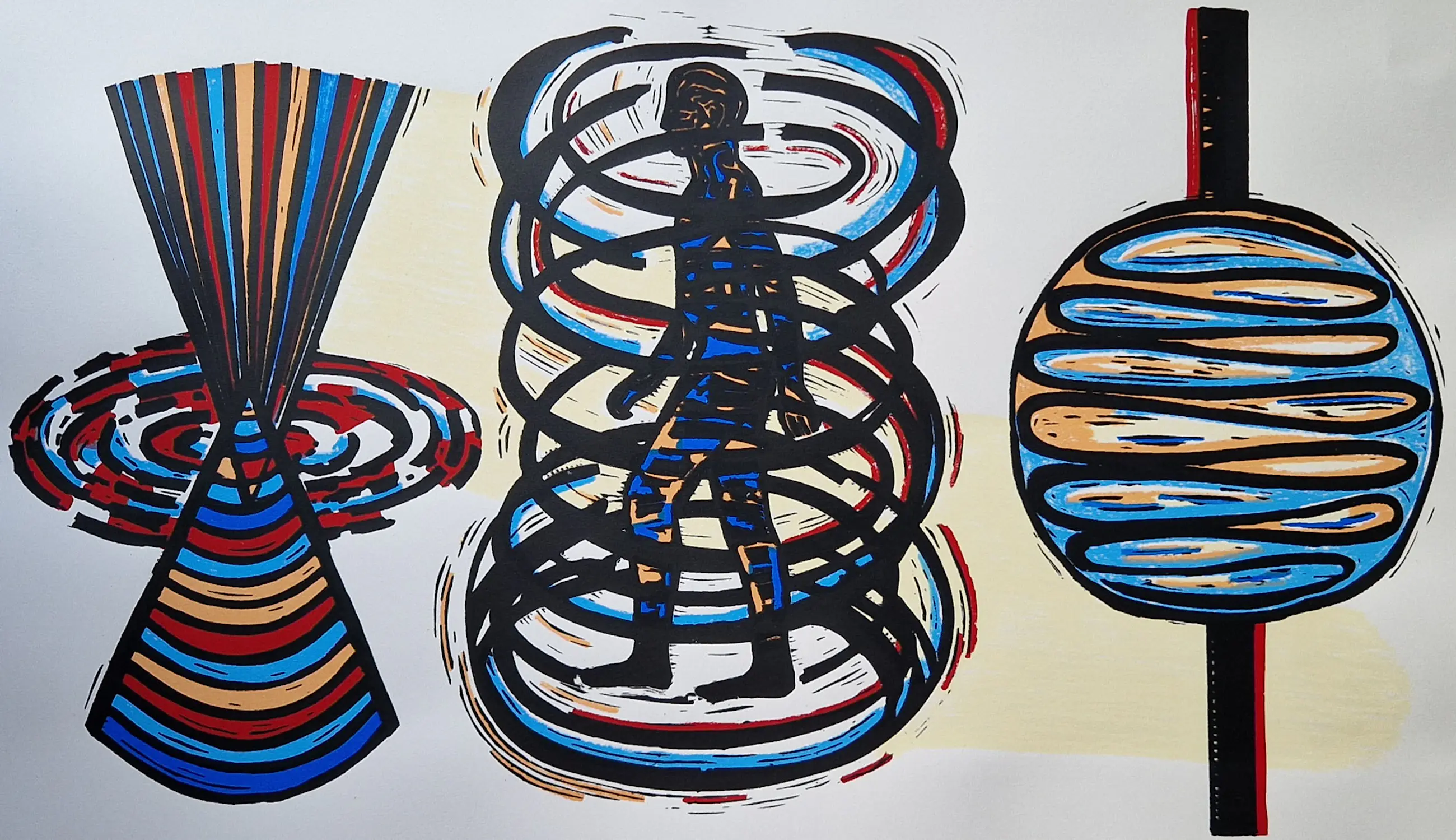 Litho van Hans Wap met de titel: 'Spinning tops' uit 1998. Het werk is rechtsonder met de hand gesigneerd door de kunstenaar.