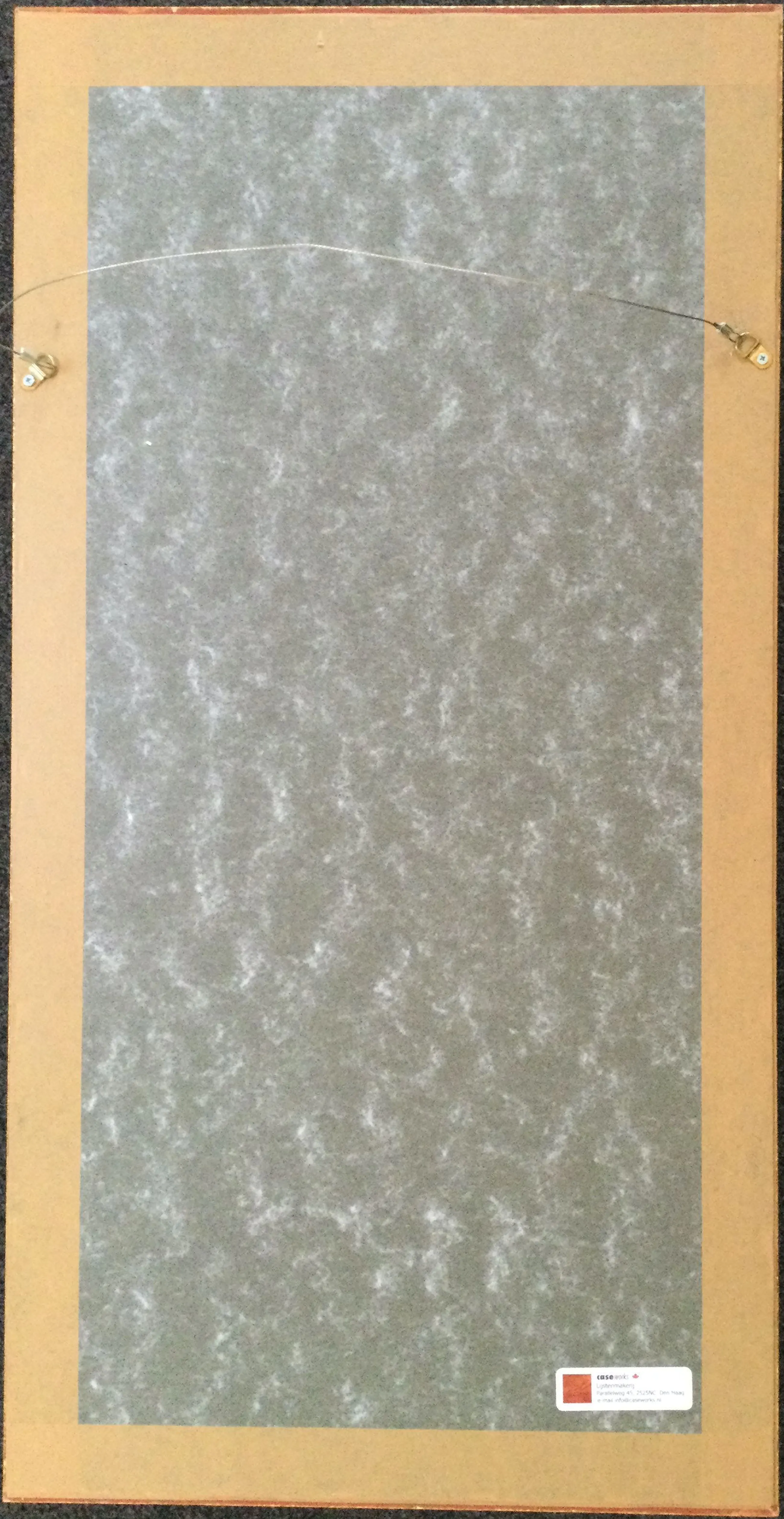 Goed ingelijst in een fraaie houten lijst met passe-partout en glasplaat. Lijst heeft langs de randen enkele kleine beschadigingen.