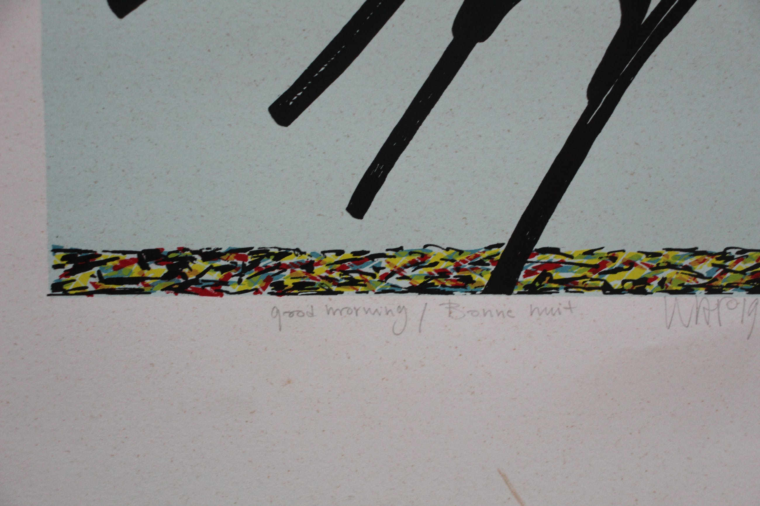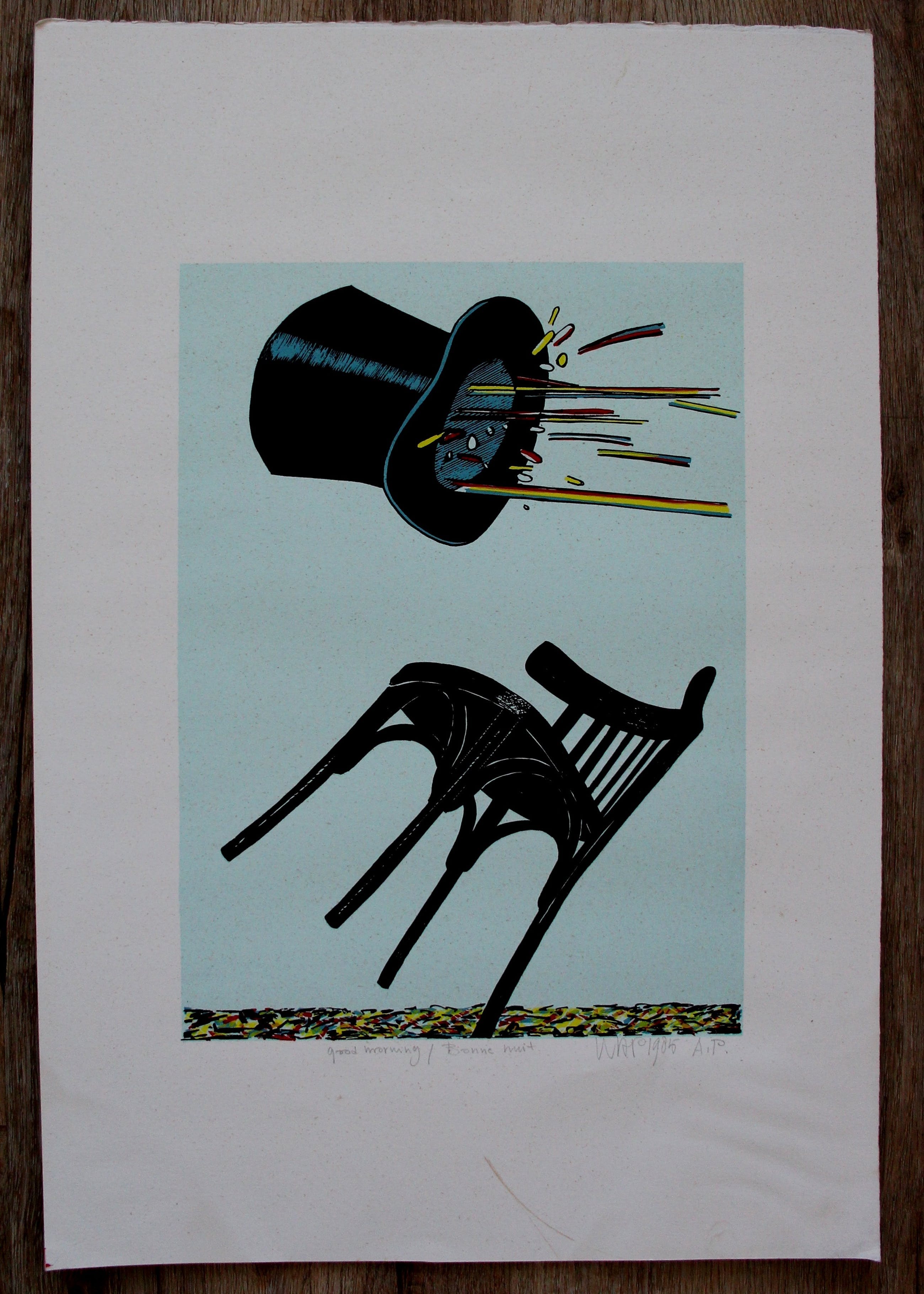 Zeefdruk van Hans Wap. Titel: Good morning/Bonne nuit. Jaar: 1985. Nummer: A.P. Afmetingen blad H55.5 x b37.5cm. Afmetingen voorstelling: H34.5 x b25cm. Het werk is, rechts onderin, gesigneerd door de kunstenaar. De authenticiteit van het aangeboden werk wordt volledig gegarandeerd. Een certificaat van echtheid kan, op aanvraag worden gemaild.