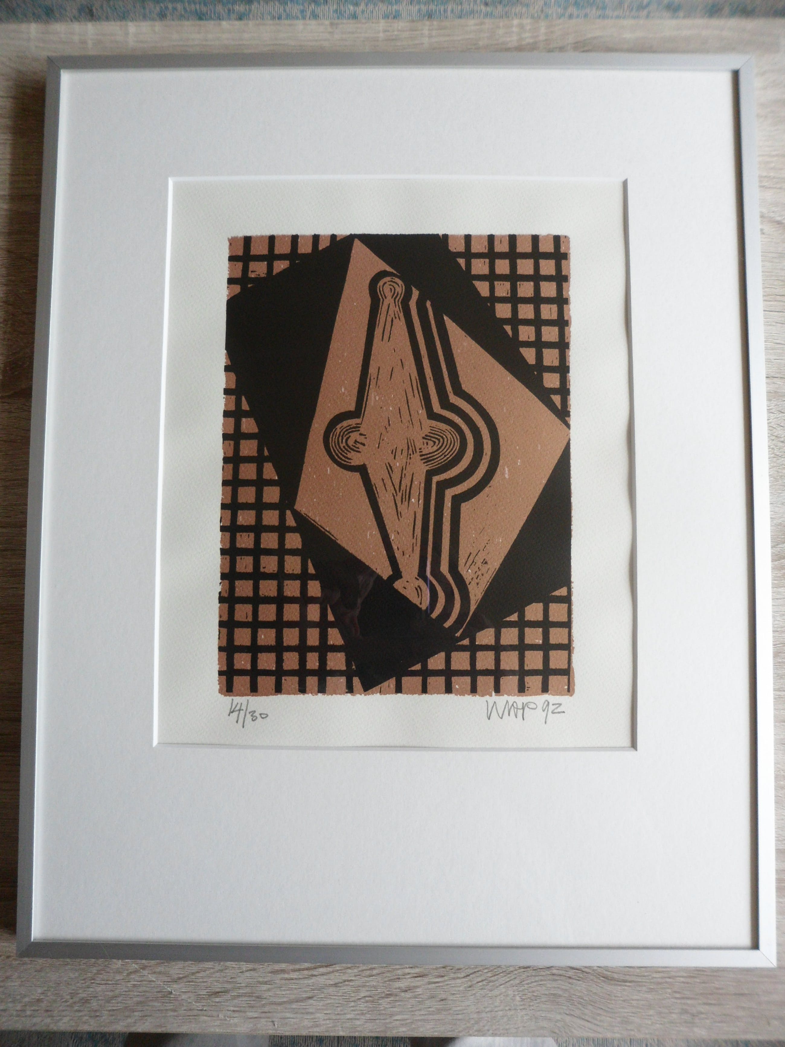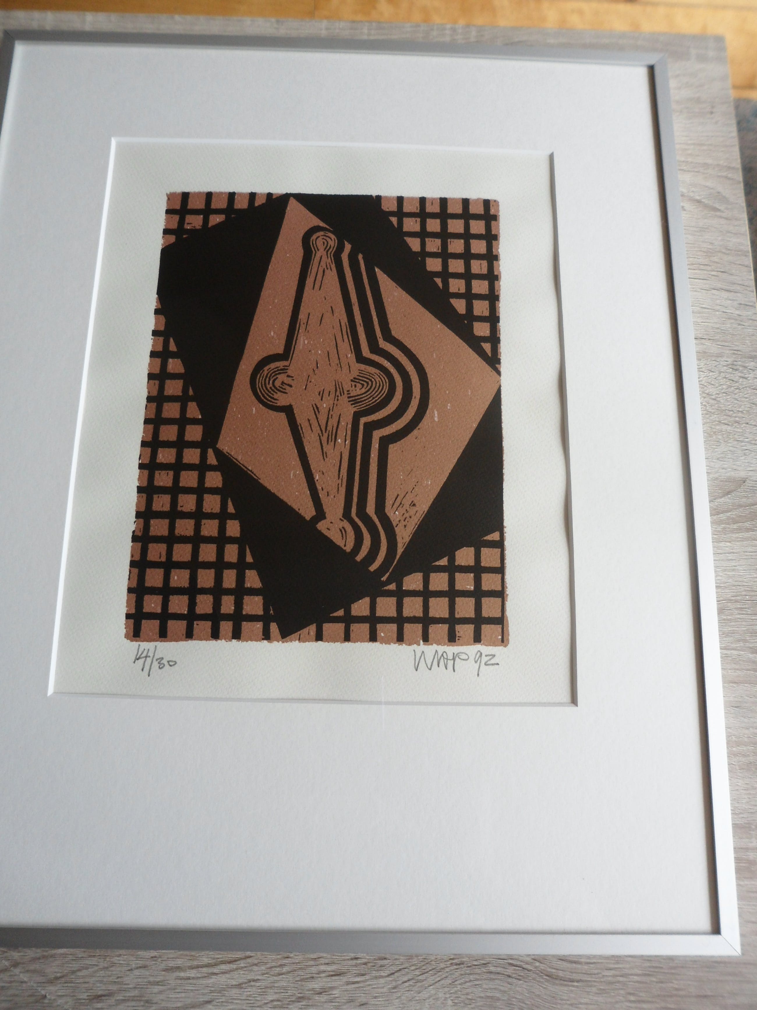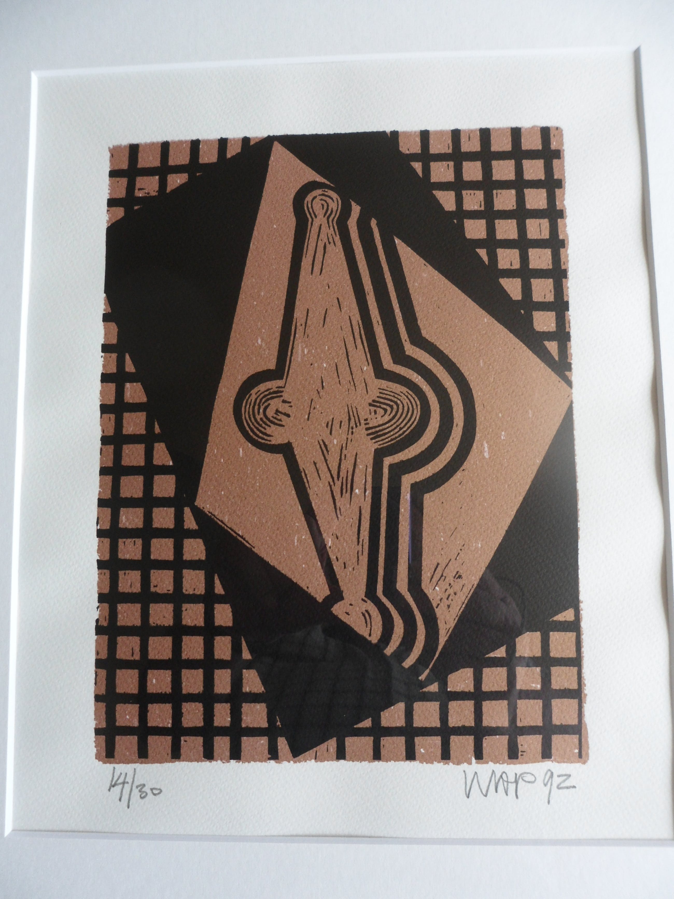 zwart-witte linoleumsnede als in de 'Car Dump' serie) en pastel,