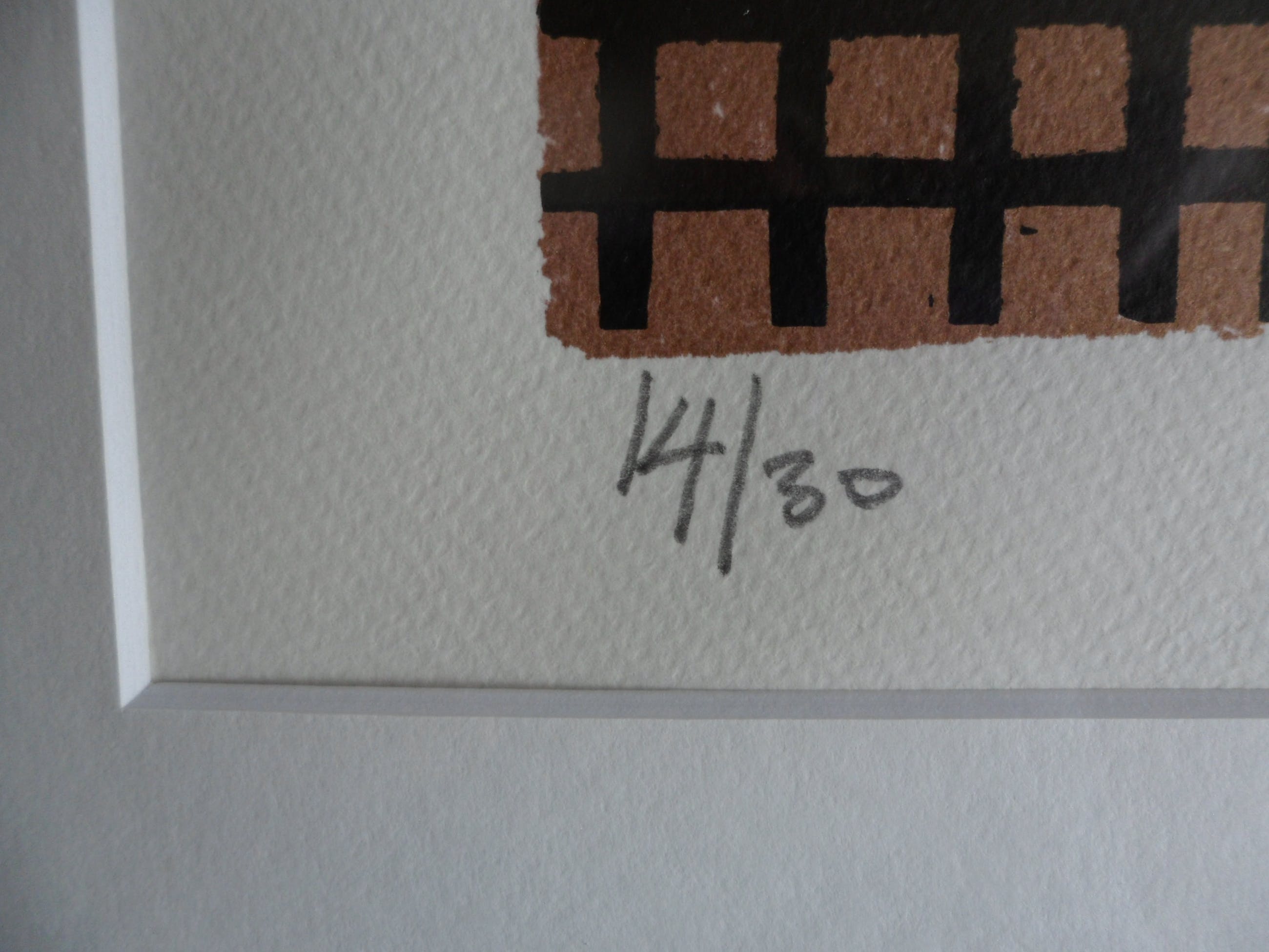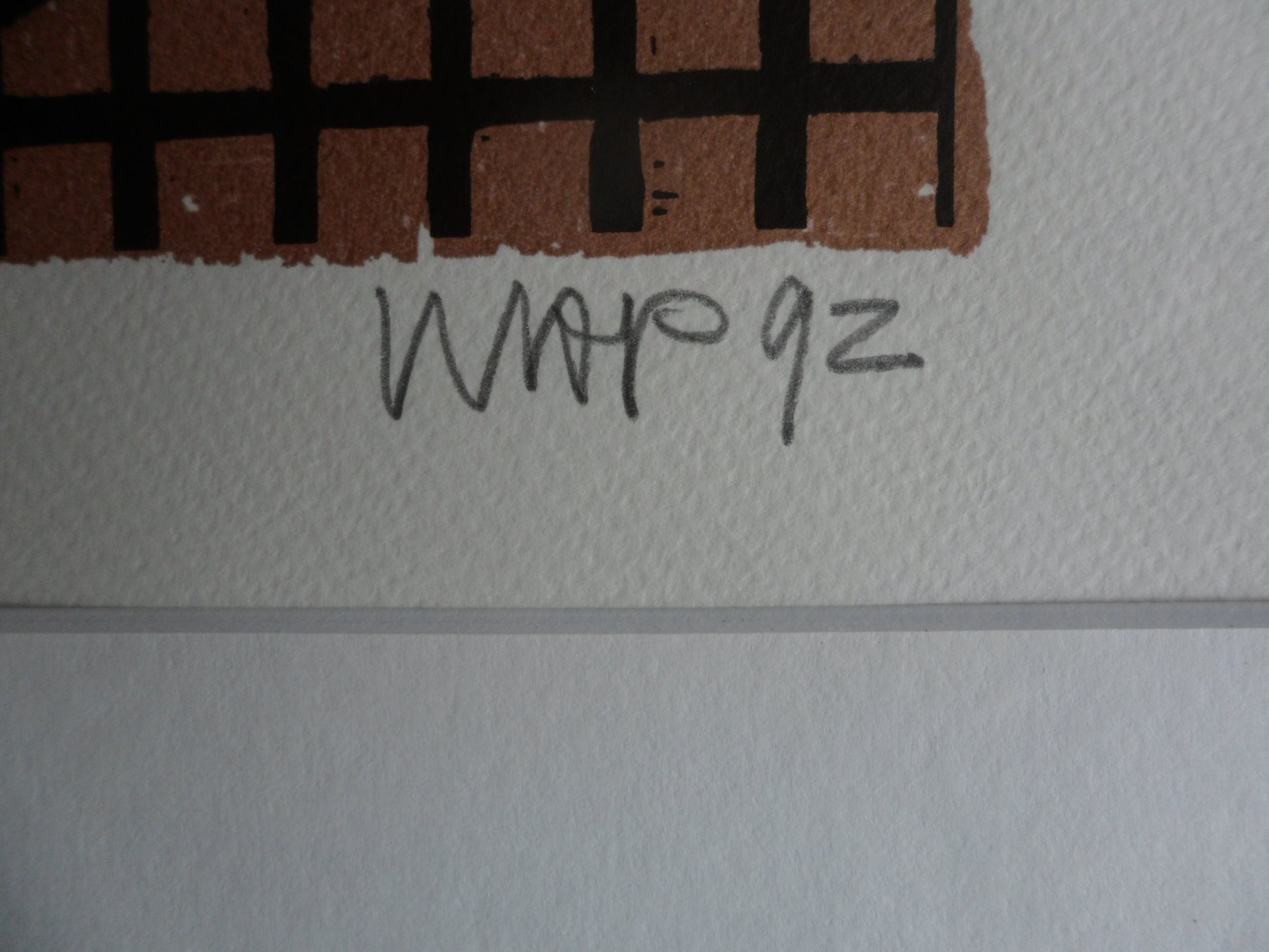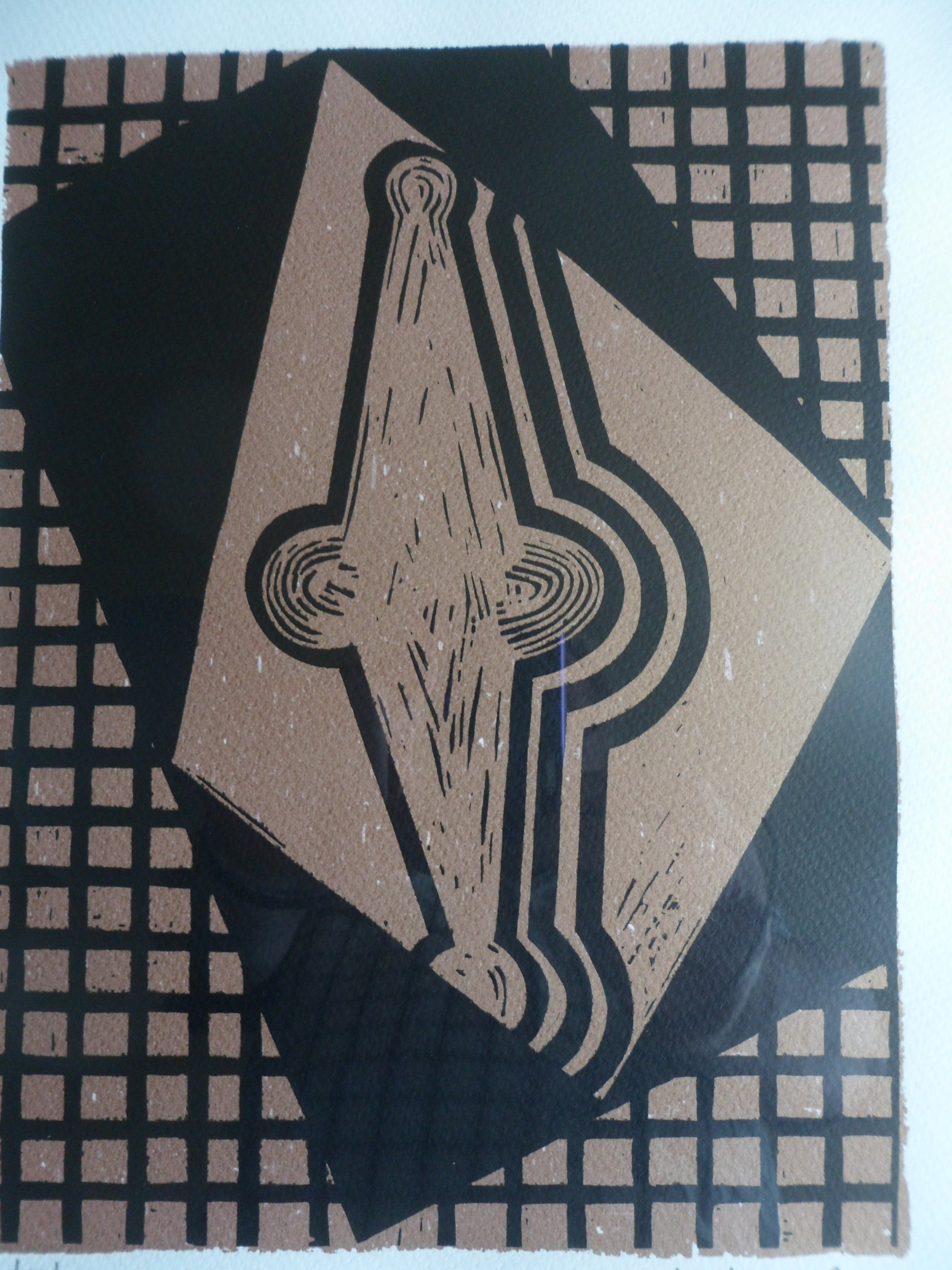 zwart-witte linoleumsnede als in de 'Car Dump' serie) en pastel,