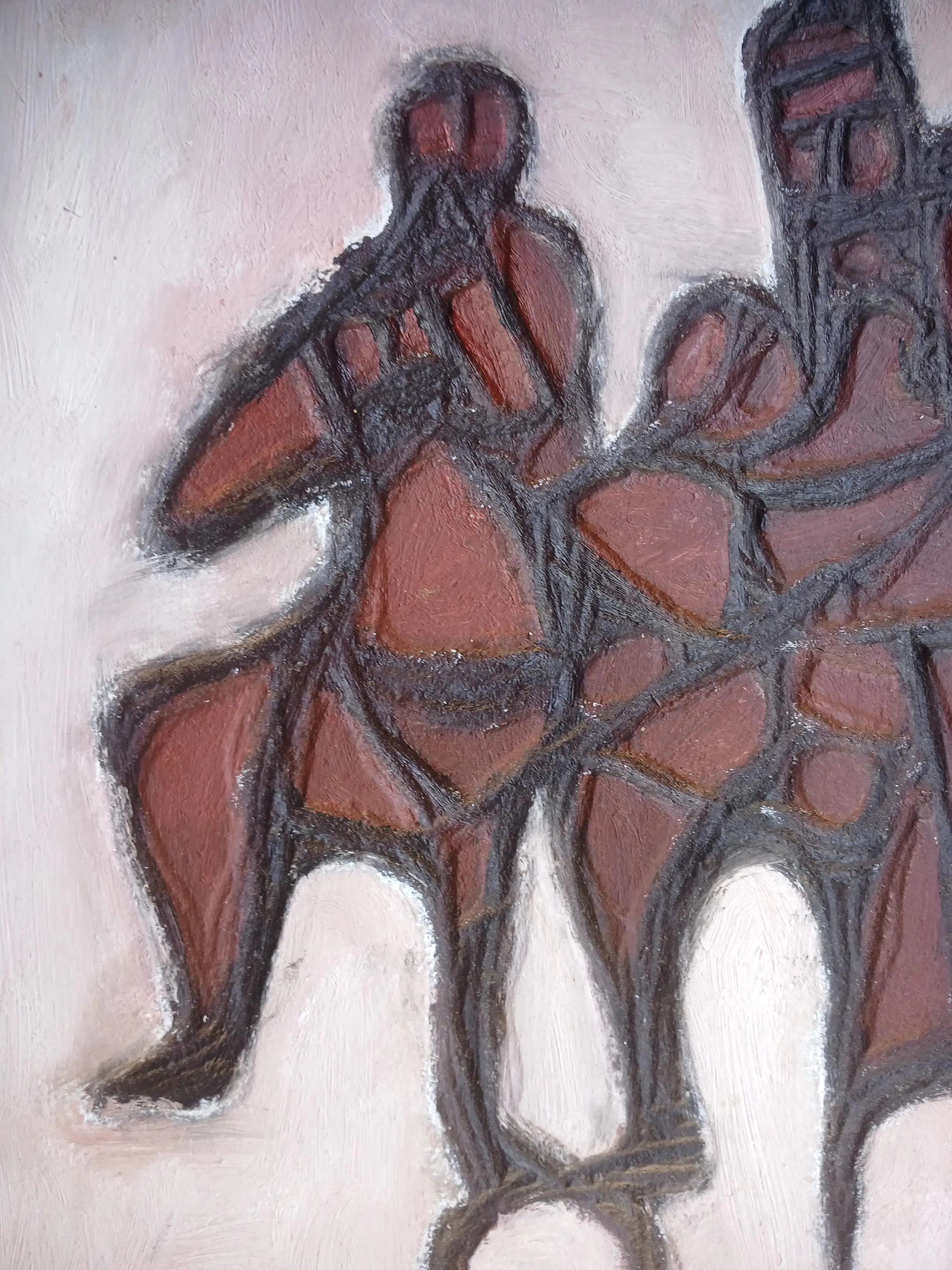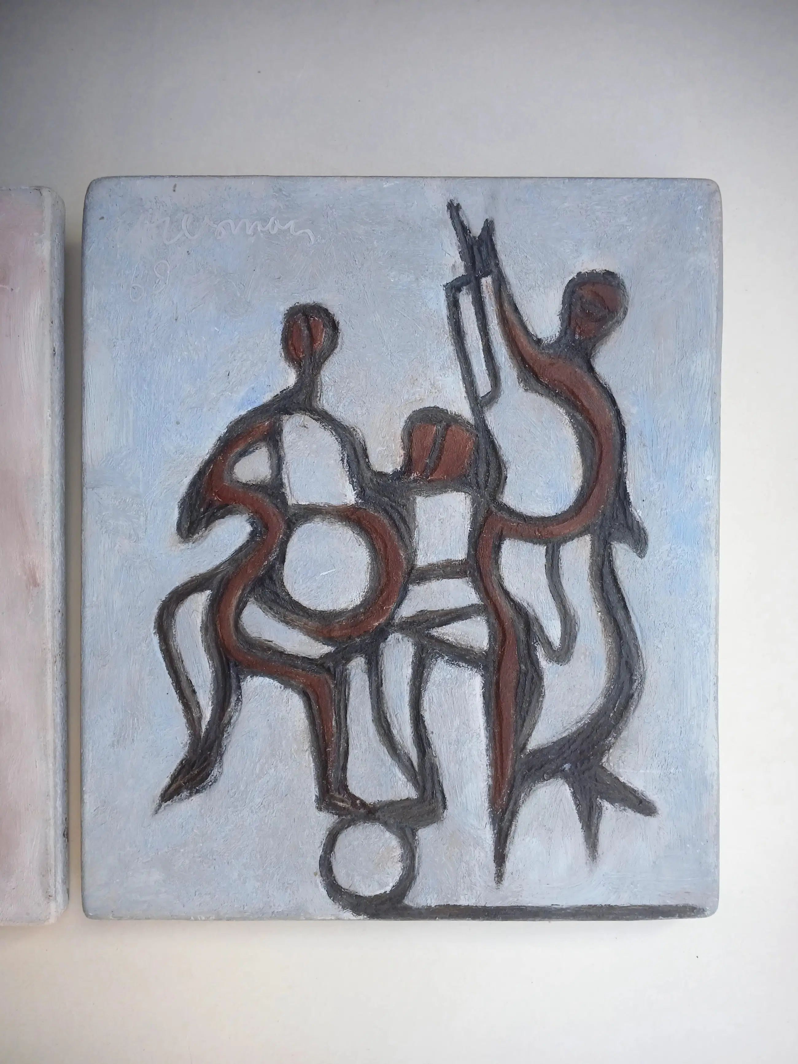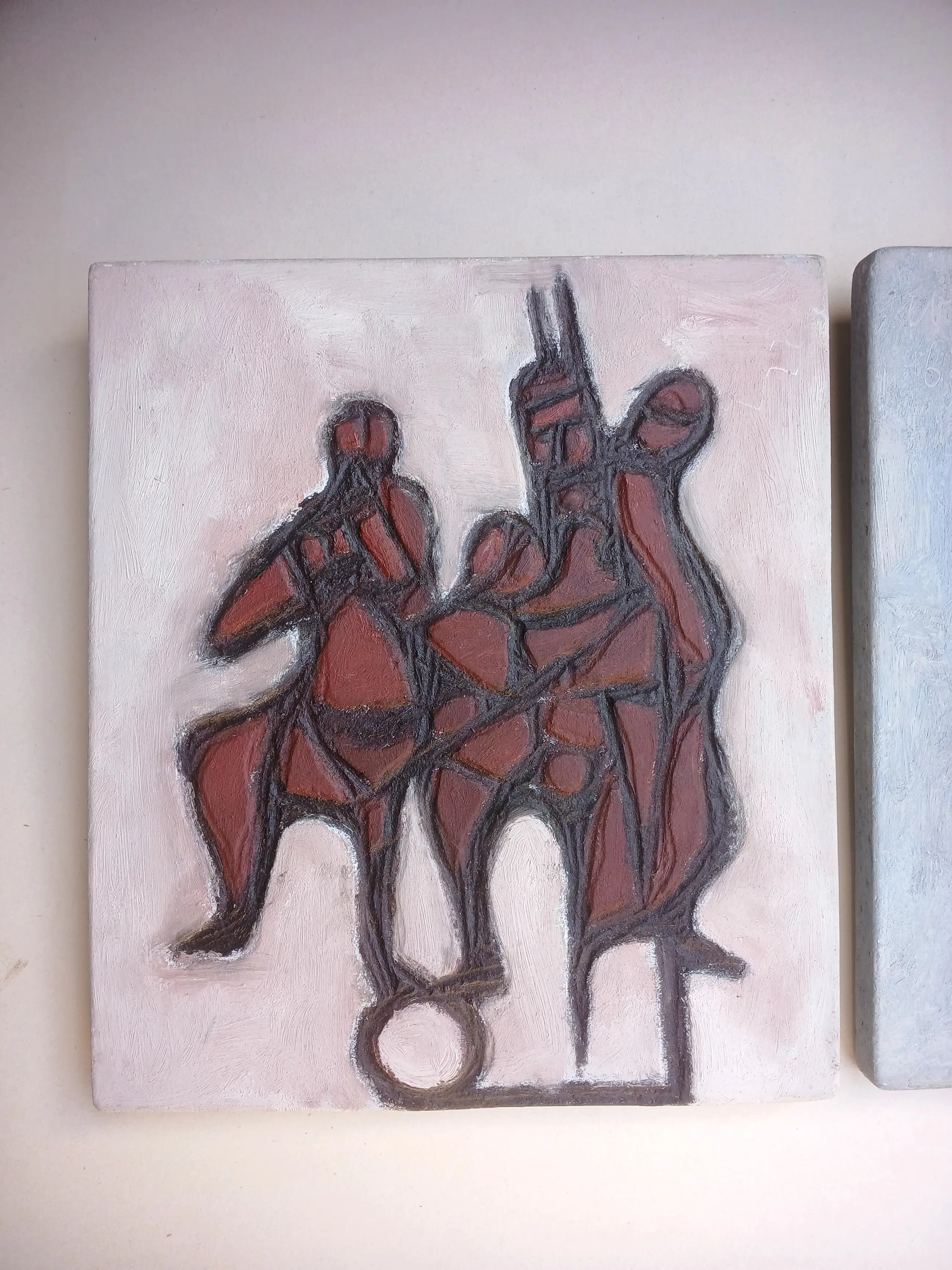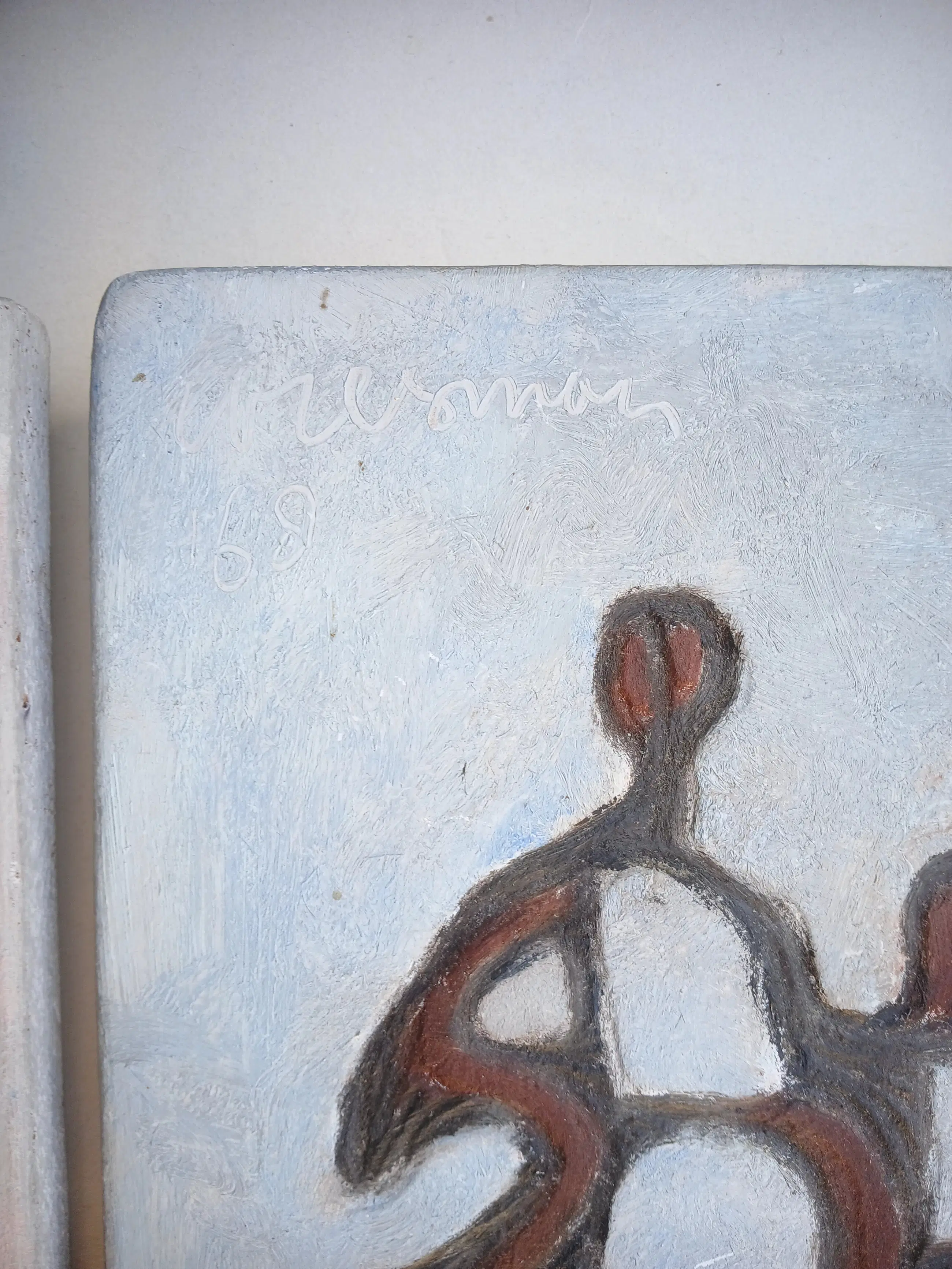 Een set fraaie houtsnijwerken uit 1968 van de kunstenaar Hans Wiesman. De werken horen bij elkaar, het blauwe werk is linksboven gesigneerd door Wiesman met het jaartal 1968 erbij. Mooie figuratieve persoonsfiguren. Lijkt op muzikanten met een gelijkenis in de hoofdlijnen. Uitgegutst in een paneel. De werken worden met zog verpakt en verstuurd.