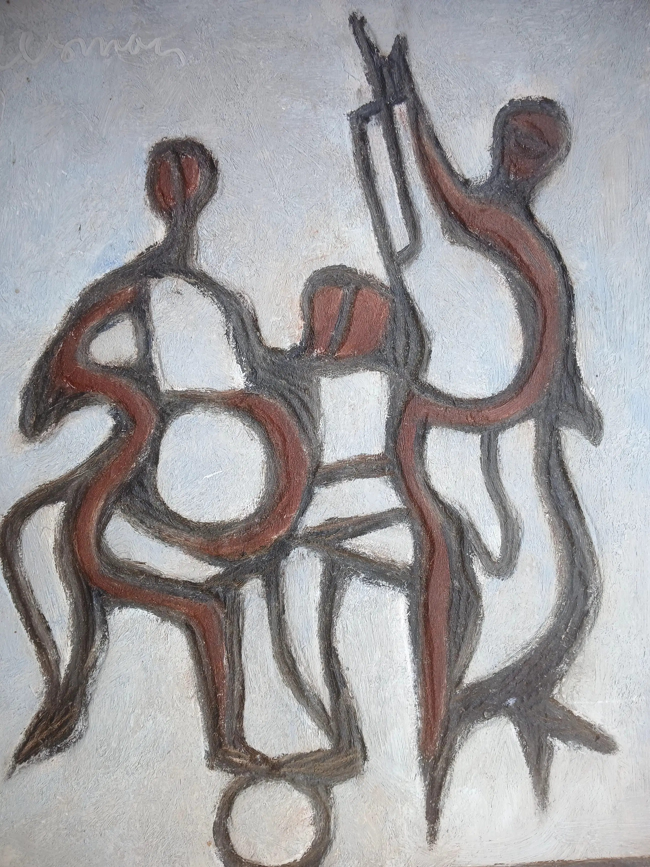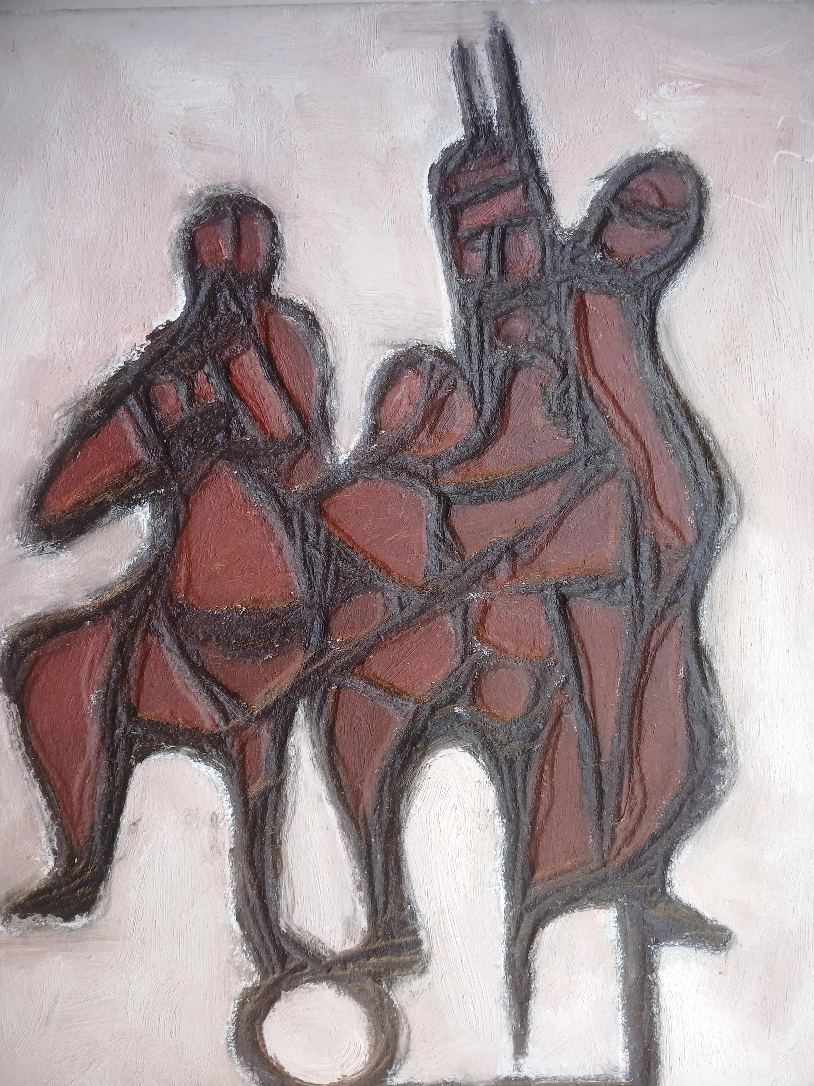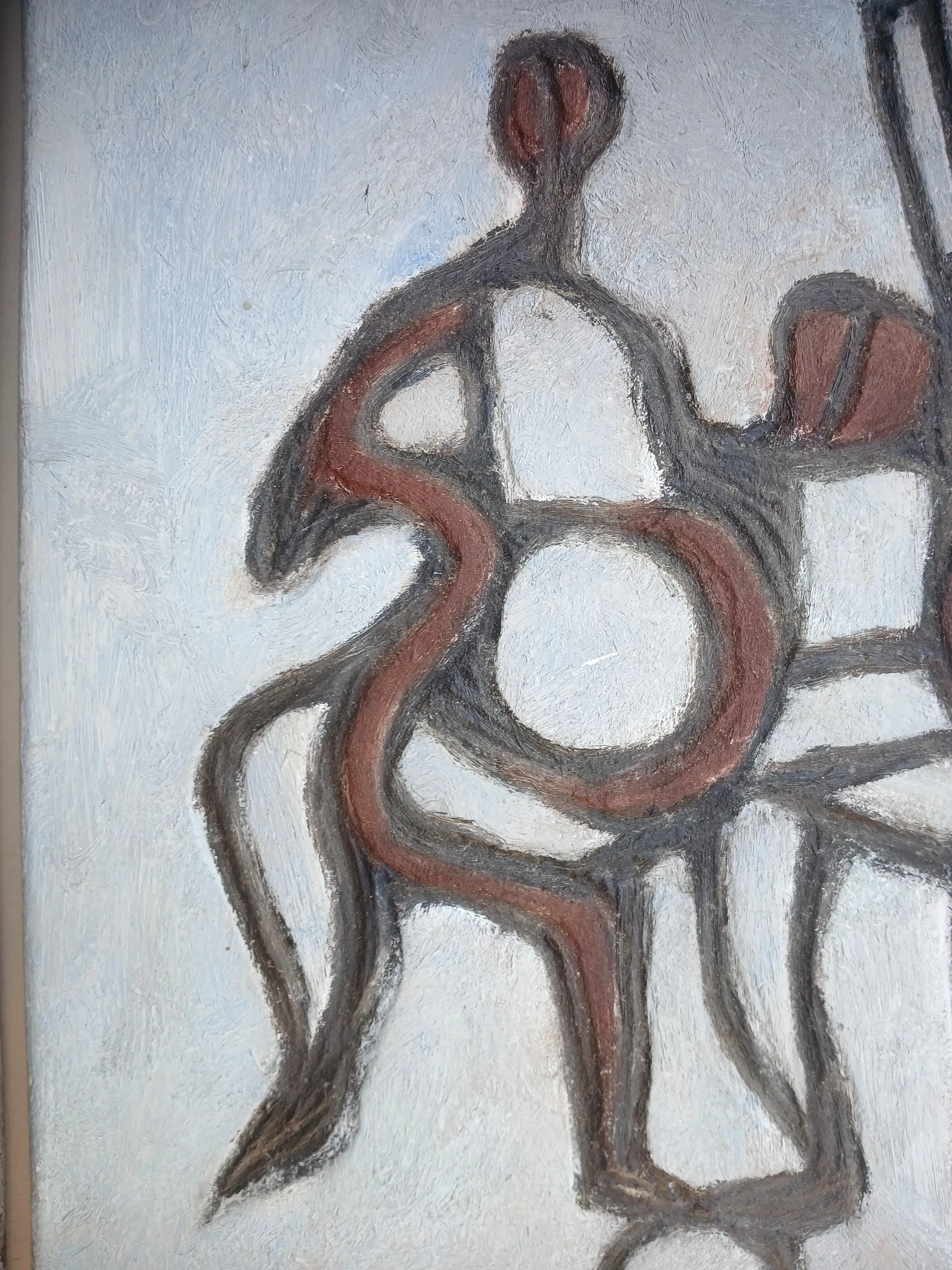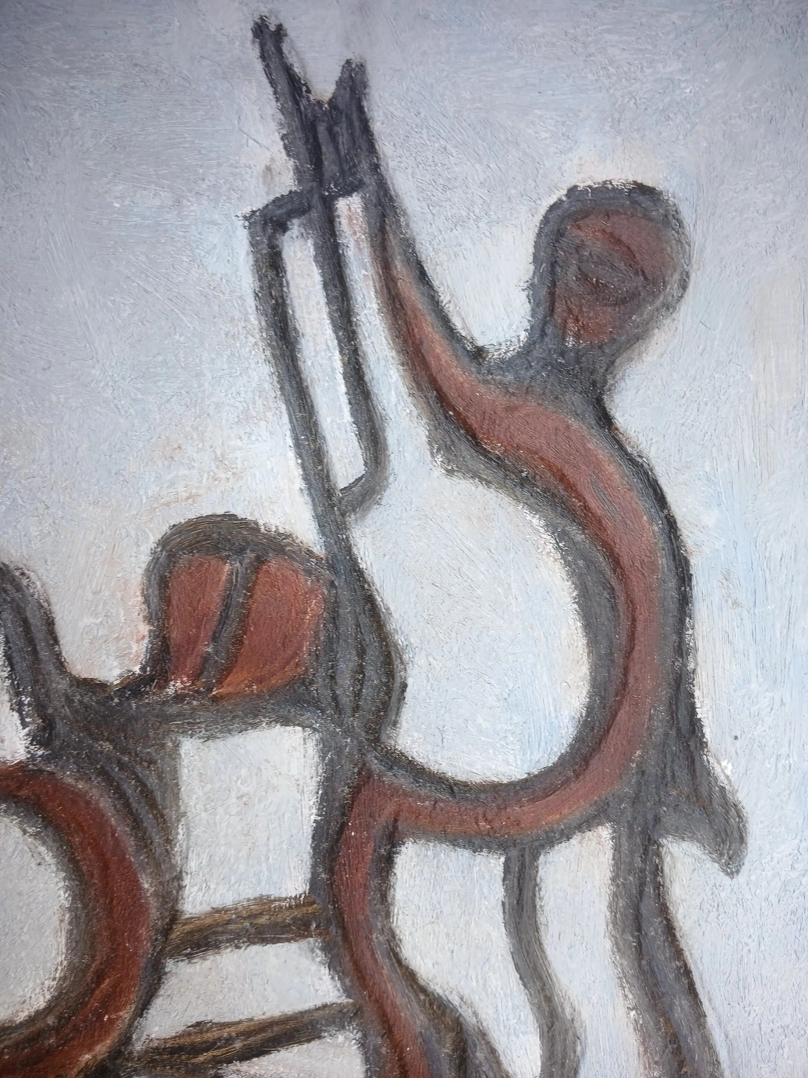 Een set fraaie houtsnijwerken uit 1968 van de kunstenaar Hans Wiesman. De werken horen bij elkaar, het blauwe werk is linksboven gesigneerd door Wiesman met het jaartal 1968 erbij. Mooie figuratieve persoonsfiguren. Lijkt op muzikanten met een gelijkenis in de hoofdlijnen. Uitgegutst in een paneel. De werken worden met zog verpakt en verstuurd.