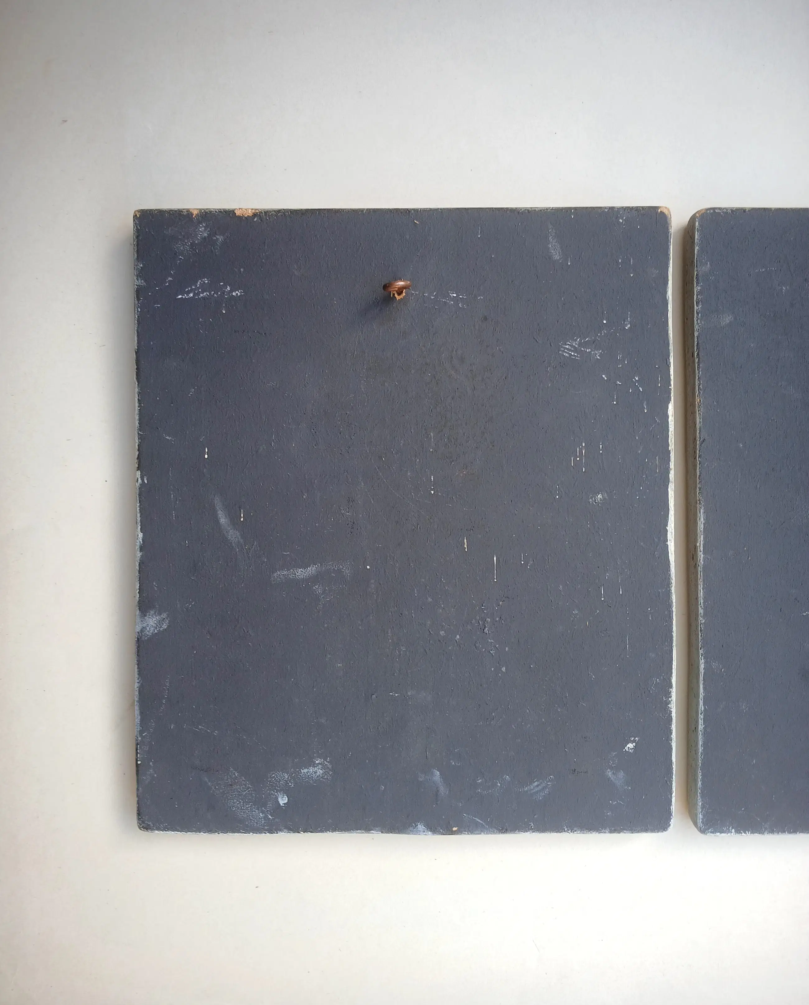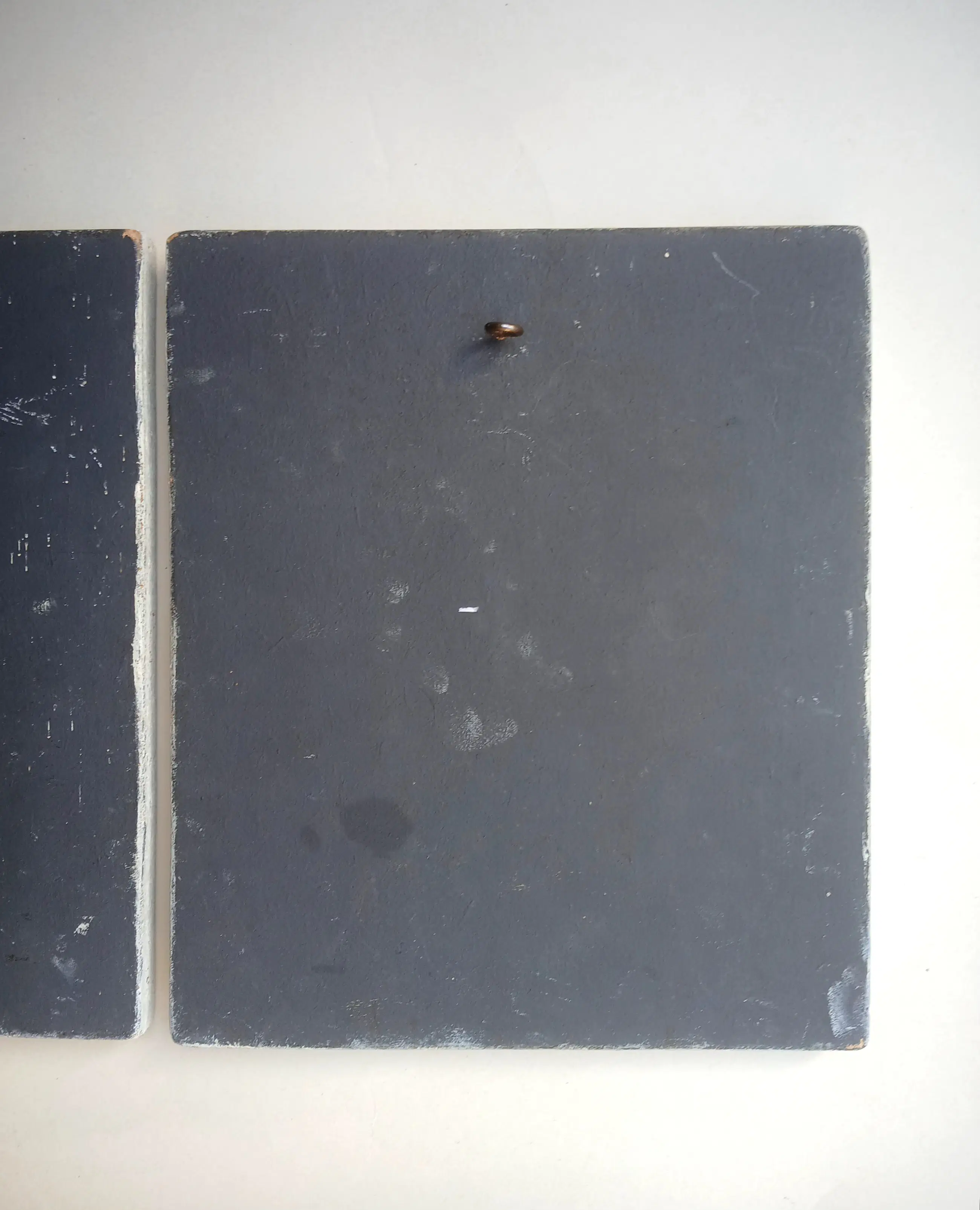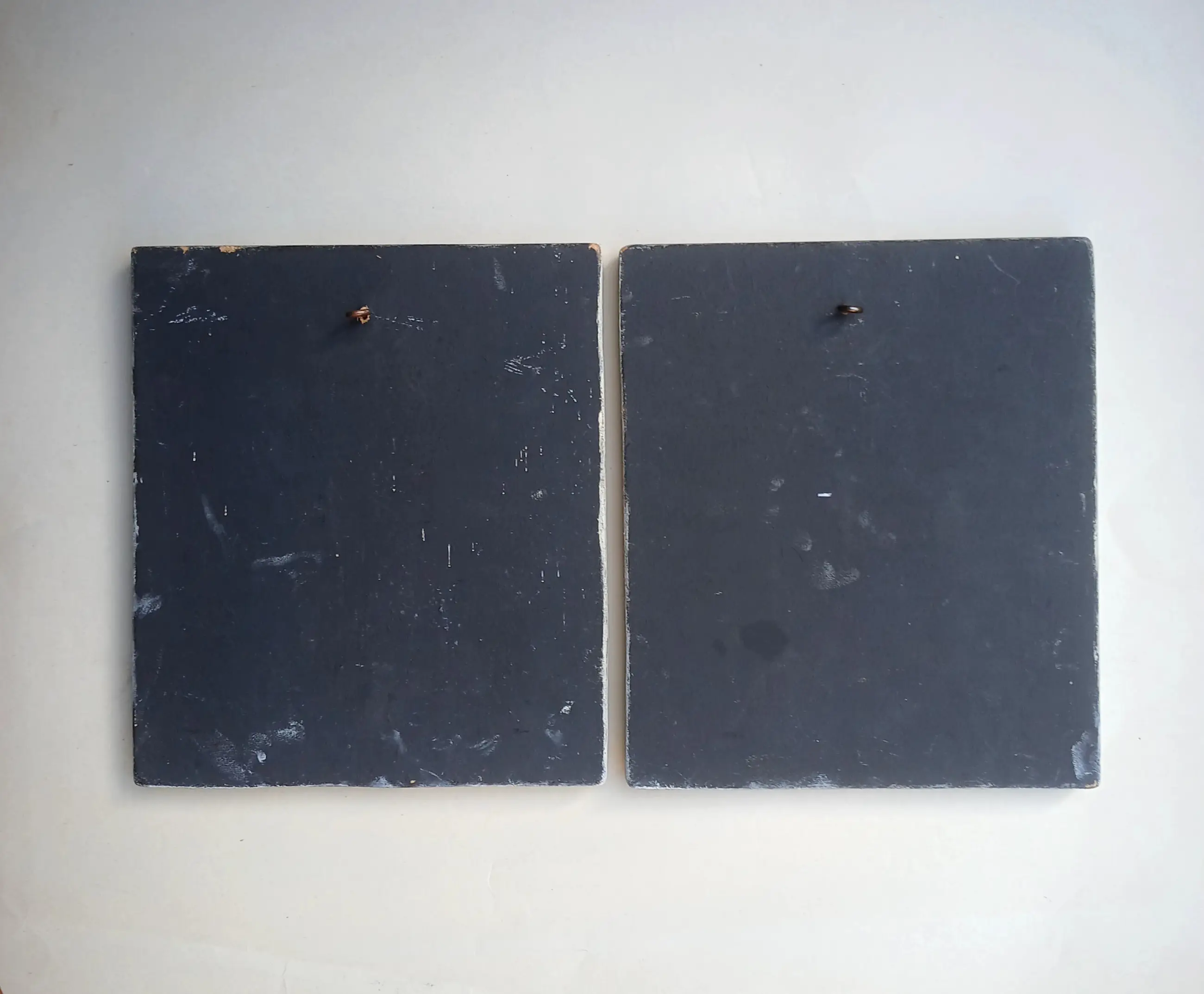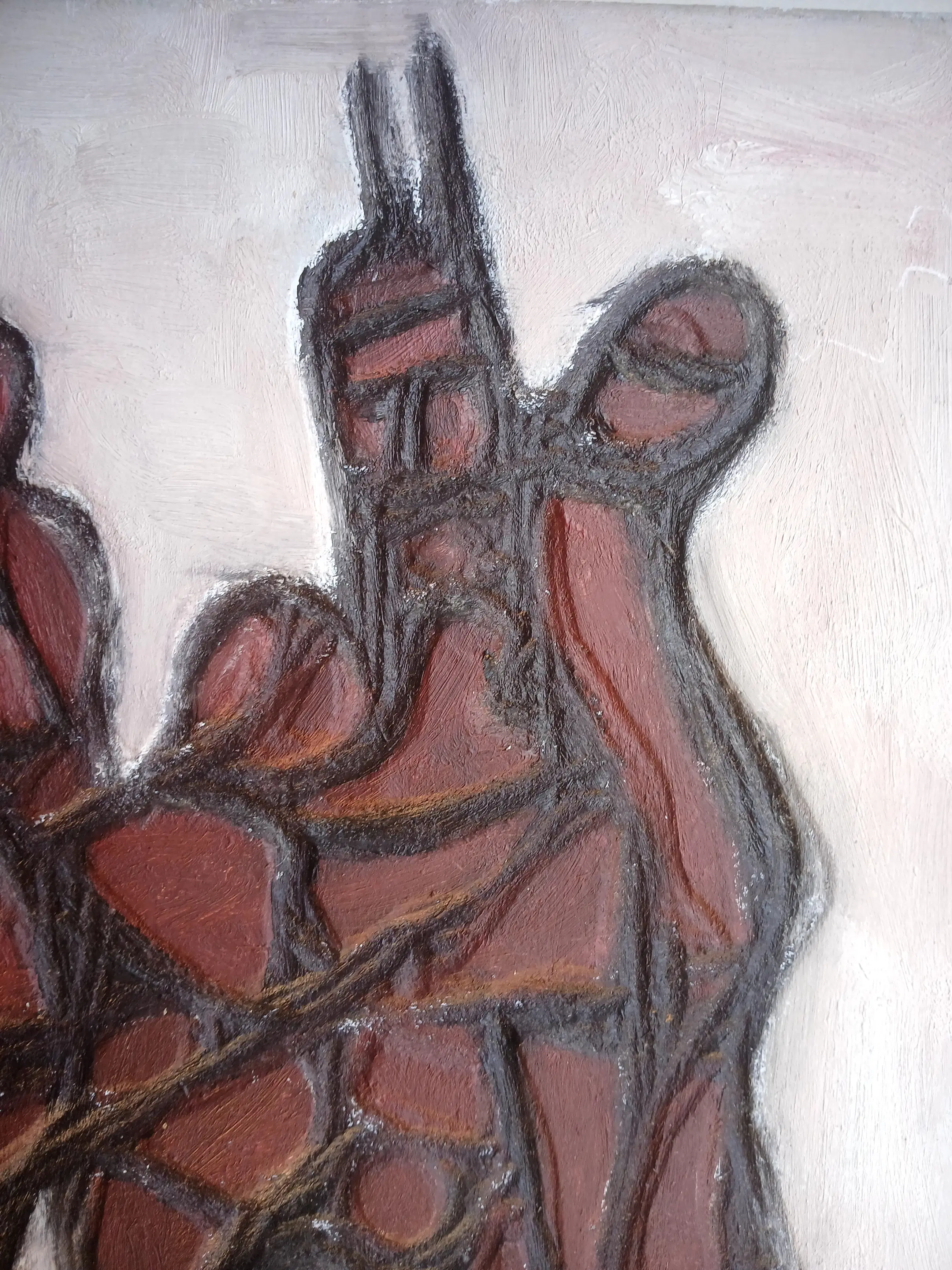 Een set fraaie houtsnijwerken uit 1968 van de kunstenaar Hans Wiesman. De werken horen bij elkaar, het blauwe werk is linksboven gesigneerd door Wiesman met het jaartal 1968 erbij. Mooie figuratieve persoonsfiguren. Lijkt op muzikanten met een gelijkenis in de hoofdlijnen. Uitgegutst in een paneel. De werken worden met zog verpakt en verstuurd.
