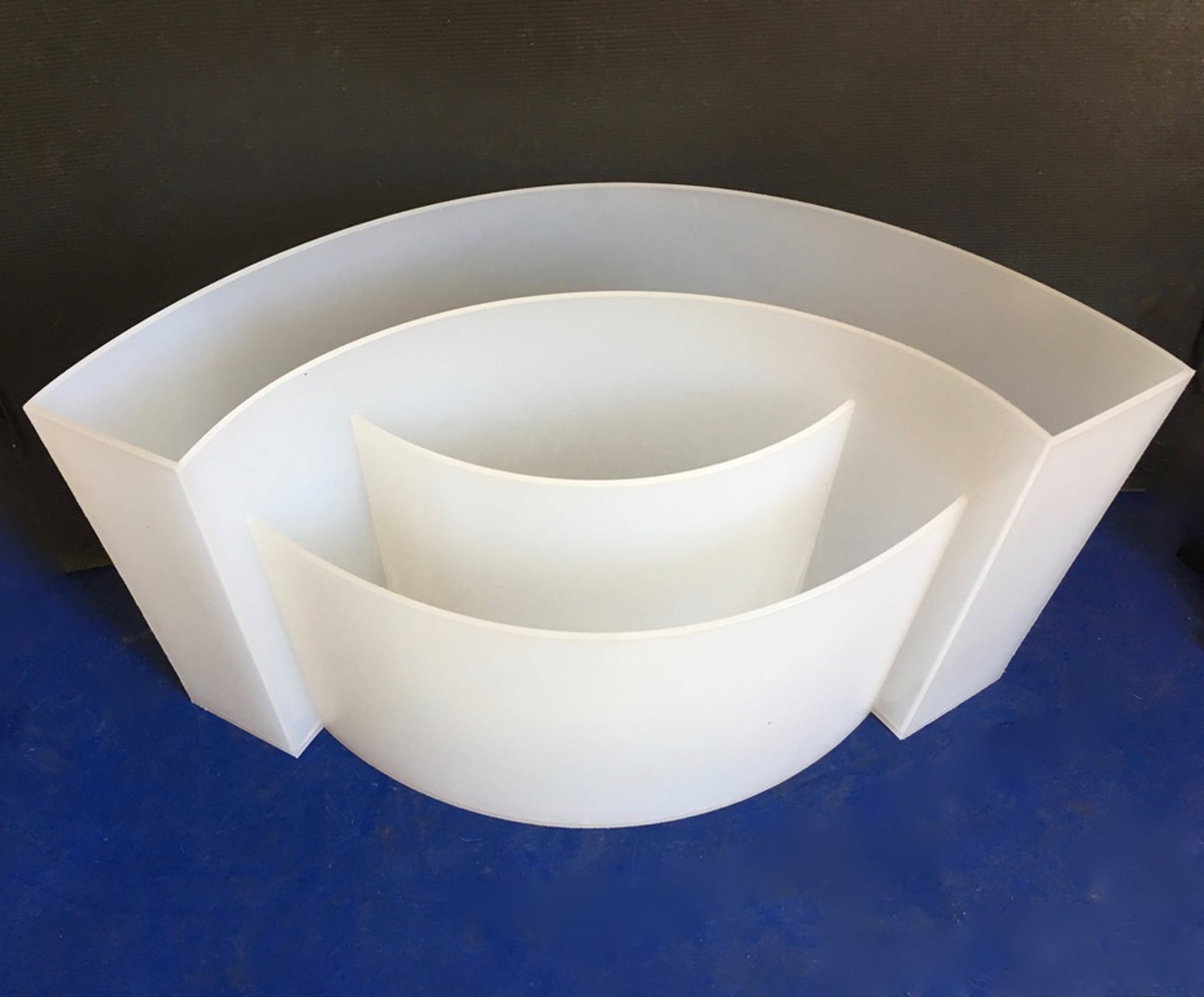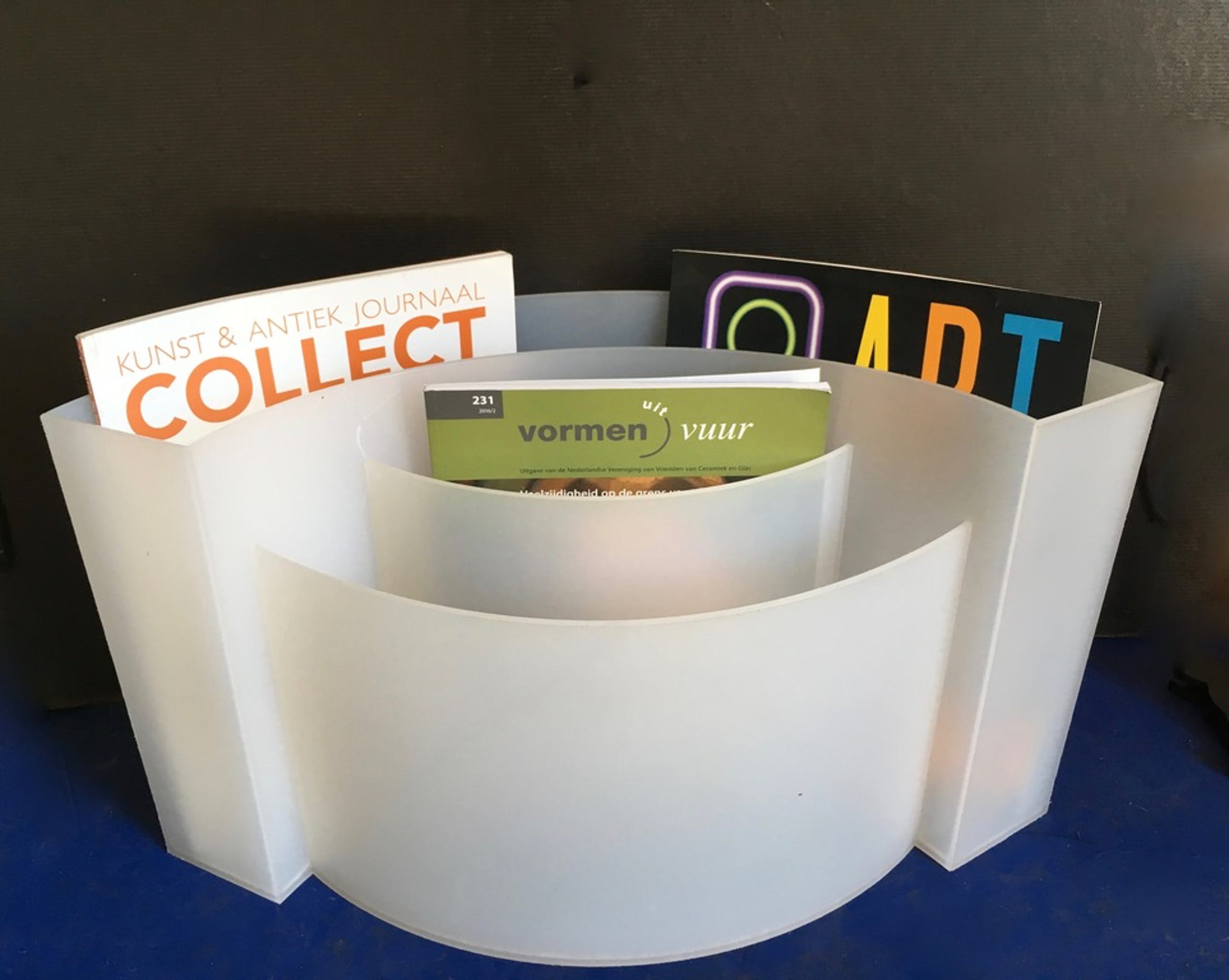 Goed ontworpen design lectuurbak waarbij mooi met vormen wordt gespeeld. Drie verschillende golvende bakken met verschillende hoogtes.