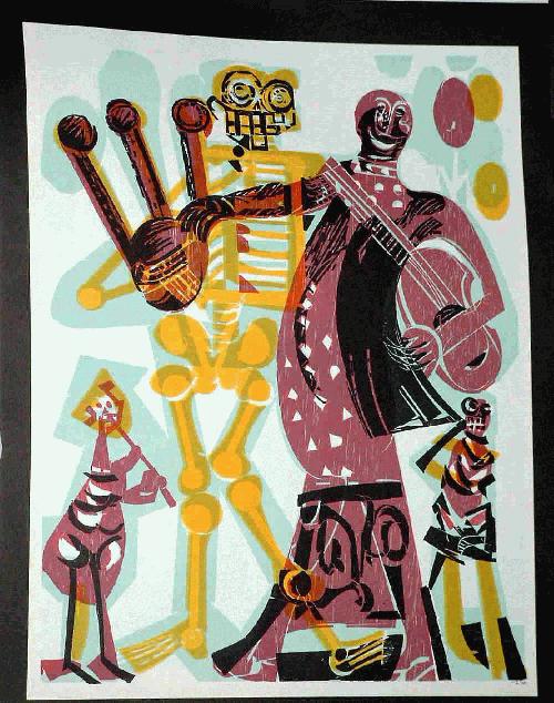 Dreizehn hochwertige rasterlose Drucke nach den Farbholzschnitten “Totentanz von Basel .- Der Kirbelpfeiffer, der Kardinal, die Herzogin, der Krüppel, der Koch, die Königin, der Herold, der Blutvogt, der Narr, der Ratsherr, der Heide, der Jude und der Schultheiß. (Nach Absprache ist es auch möglich die Drucke einzeln zu erwerben, wenn Sie Fotos möchten kann ich Ihnen diese zu mailen). jede Farbe einzeln schichtweise gedruckt Ein Blatt Blatt/sheet: 49,8 x 41 cm Platte/plate: 45 x 35 cm Das Gesamtwerk besteht aus vierzig Farbholzschnitten (46x38 cm) und erschien 1966 als Mappenwerk im Verlag der Kunst, Dresden. Es gilt als eine der bedeutendsten Arbeiten des Künstlers. Aus der Beschreibung des Herausgebers: „Wir bringen hier Blätter des TOTENTANZ VON BASEL . Damit hat der Sammler und Freund von Graphiken von HAP Grieshaber noch einmal die Möglichkeit, einen Teil des Werkes des Künstlers zu erwerben. Wir sprechen von der Buchdruckerkunst. Diese Blätter sind wirklich ein Kunstwerk geworden. Die Blätter sind rasterlos gedruckt. Jede Farbe lief einzeln durch die Maschine und so entstand die schichtweise Oberlagerung der Farben, während etwa beim üblichen Offsetdruck Farbsätze hergestellt werden, welche in einer normalen Farbskala durch die Maschine laufen. Dieser Druckvorgang ist deshalb schnell erledigt, während unser Druck sich über Wochen hinzog, weil die einzelnen Farben nicht "naß' gedruckt worden konnten, sondern jede Farbe erst trocken sein mußte, bis die neue Farbe darüber gedruckt werden konnte. Die Drucke wurden mit der Erlaubnis von Grieshaber gedruckt.