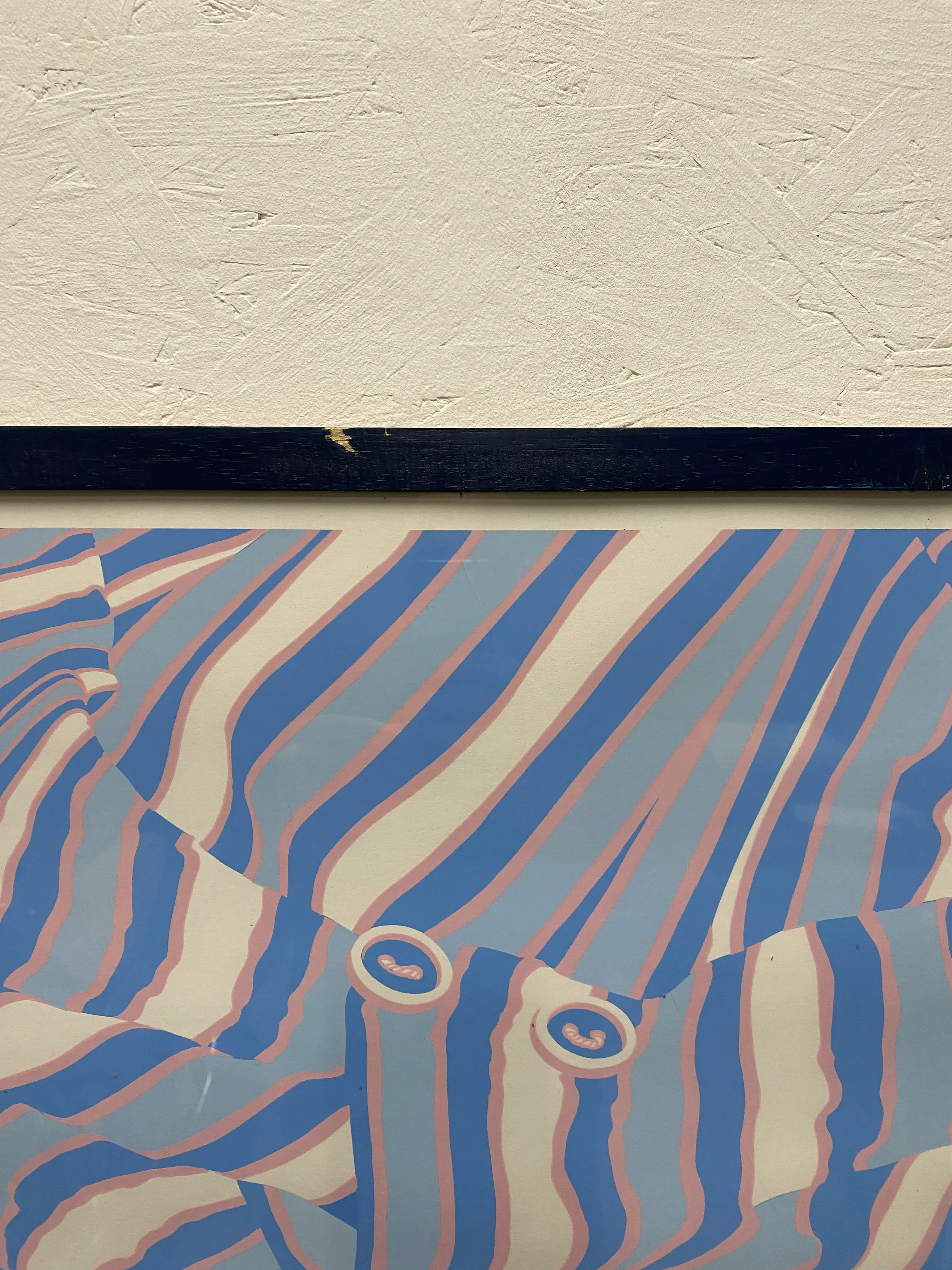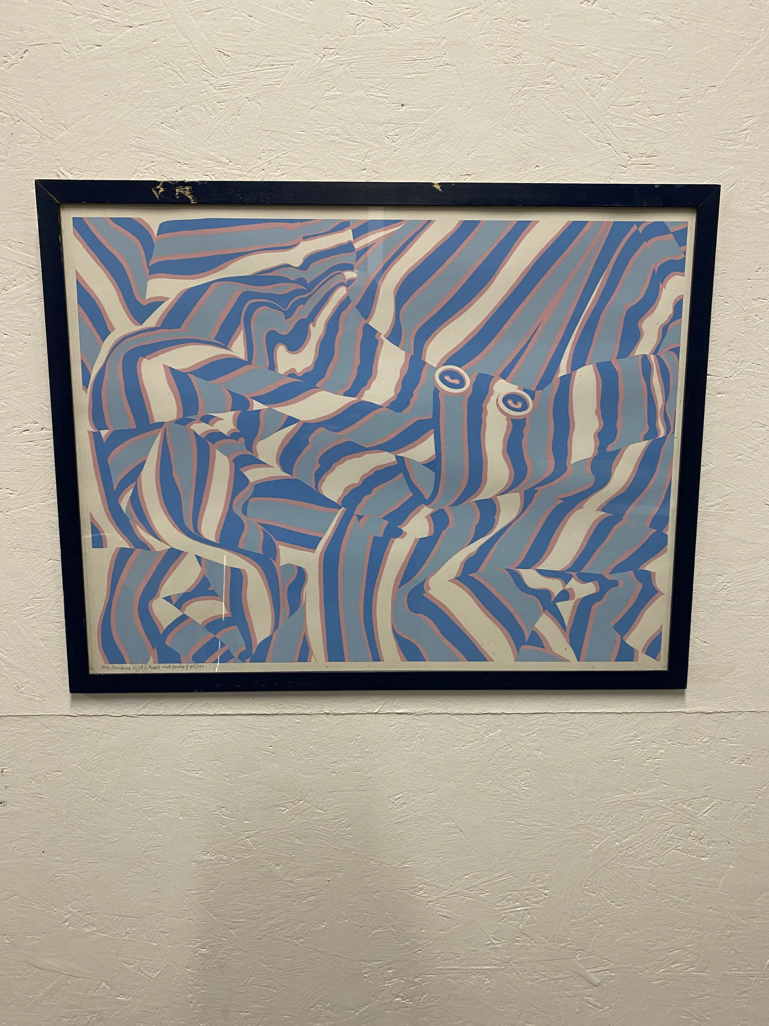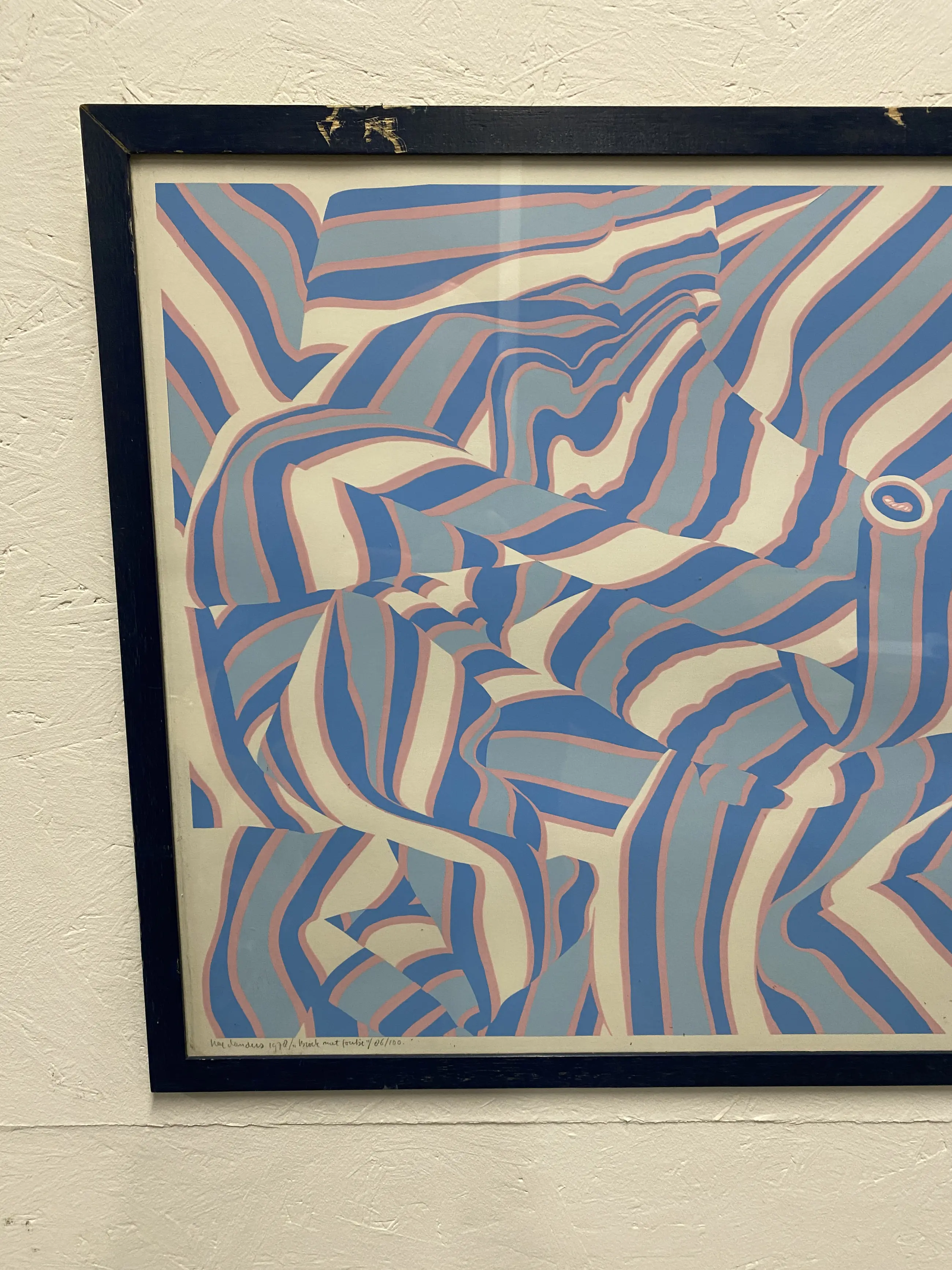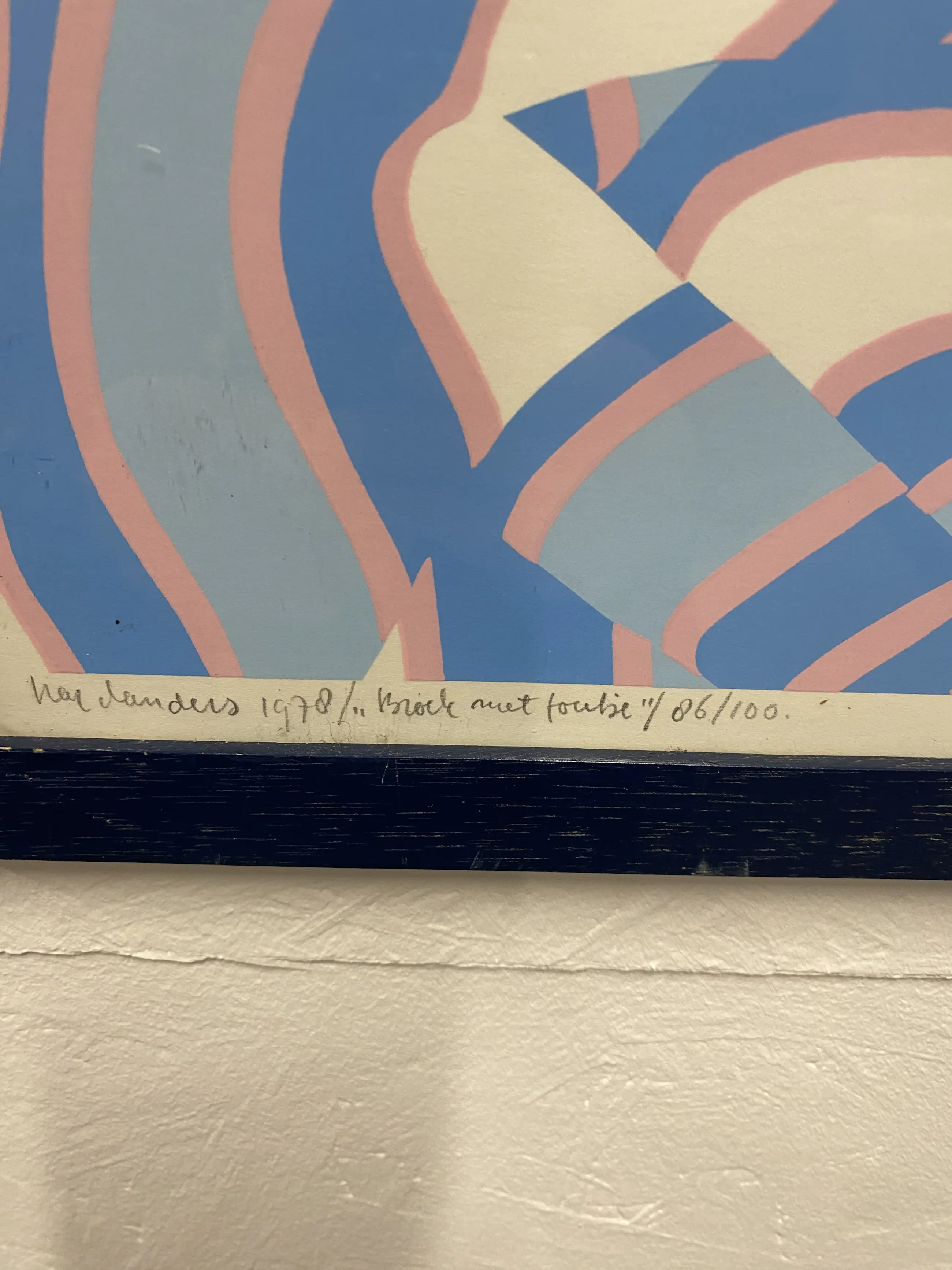 Werk van Har Sanders getiteld broek met een foutje. Oplage 100 stuks dit is nr 86/100 Werk is ingelijst in houten lijst, doch is de lijst beschadigd wat overigens prima bij te werken is mocht deze lijst eromheen blijven