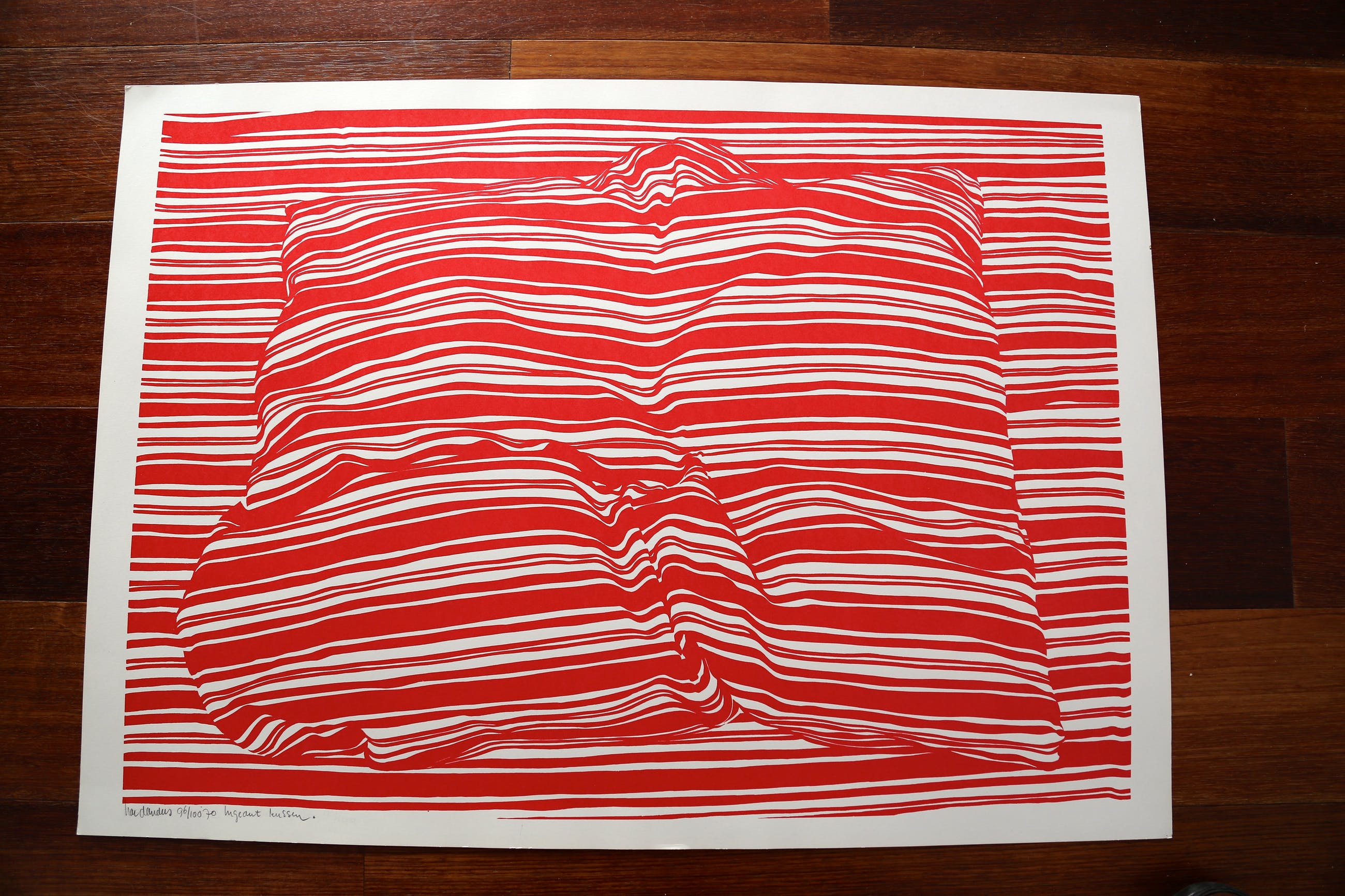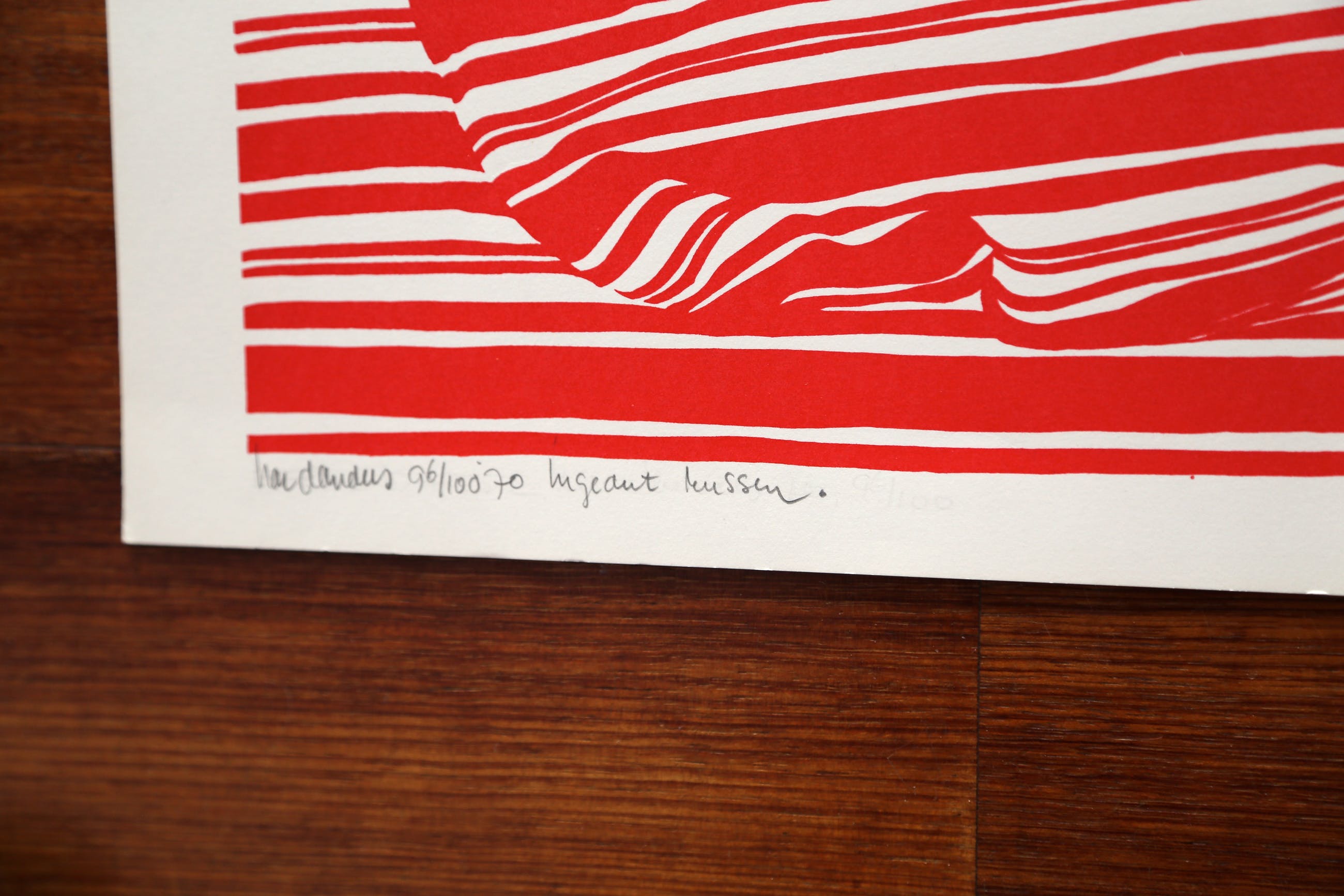 Zeefdruk, 96 in oplage van honderd, rood. Afbeelding zelf 65 x 45 cm.