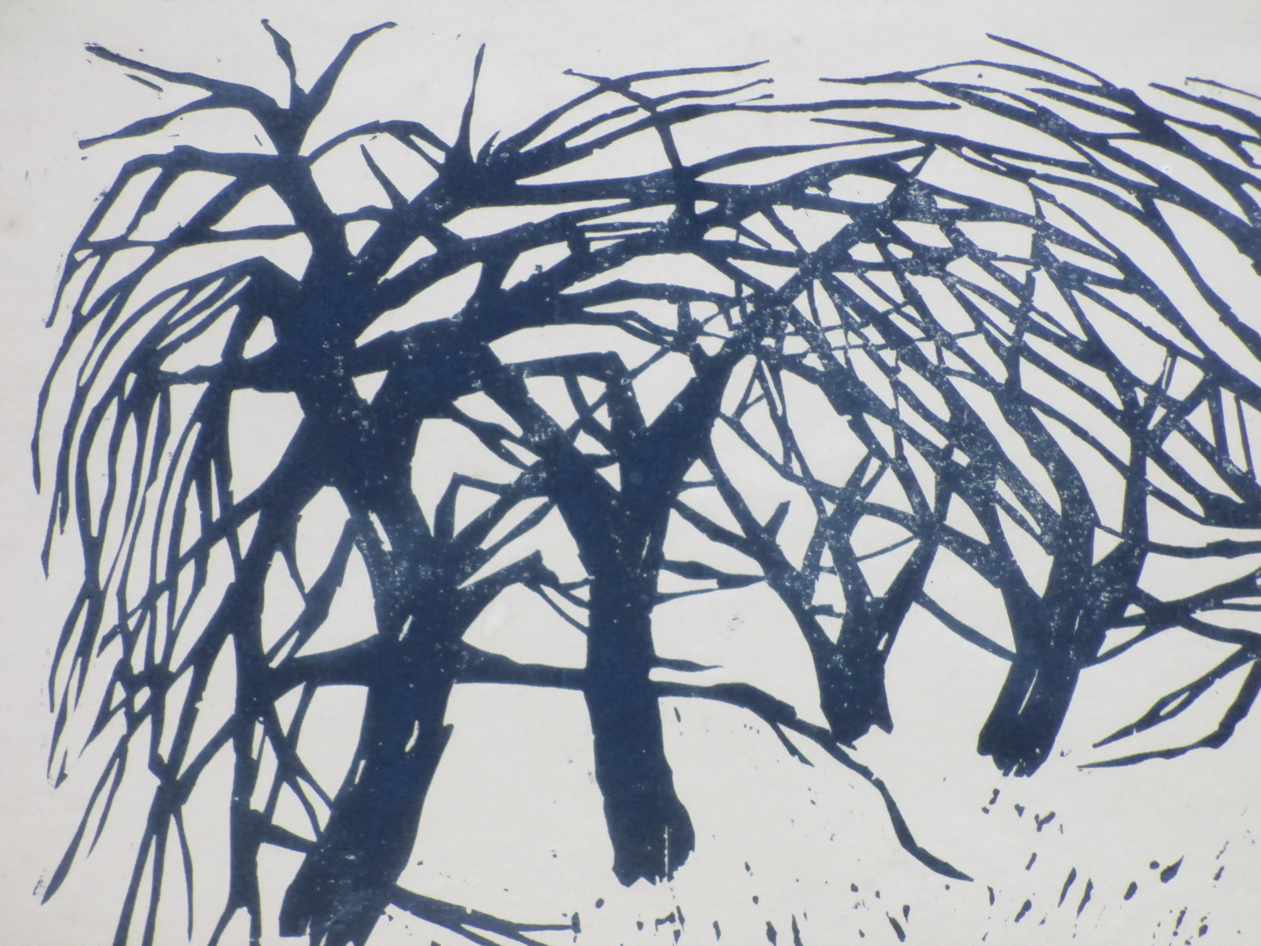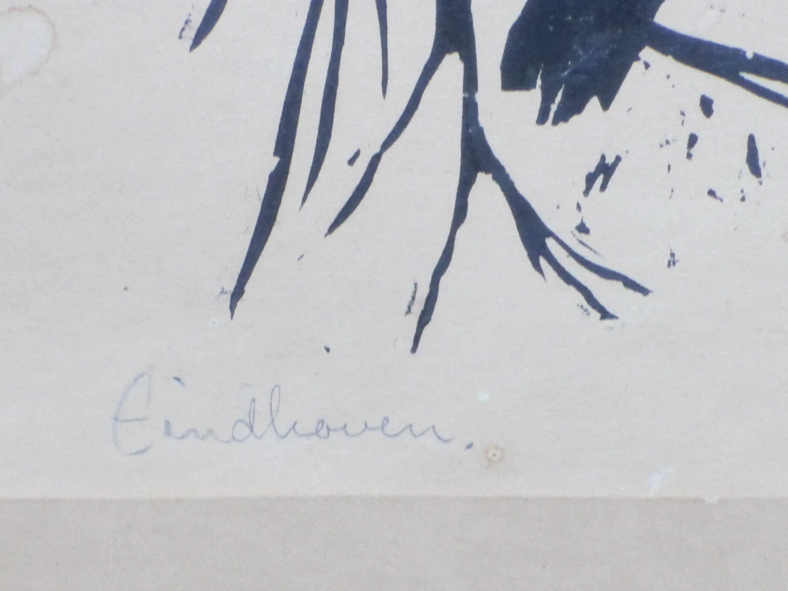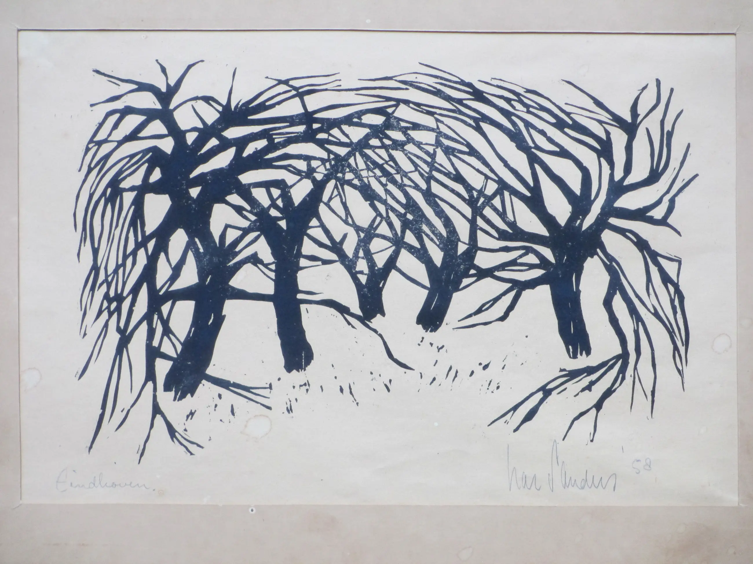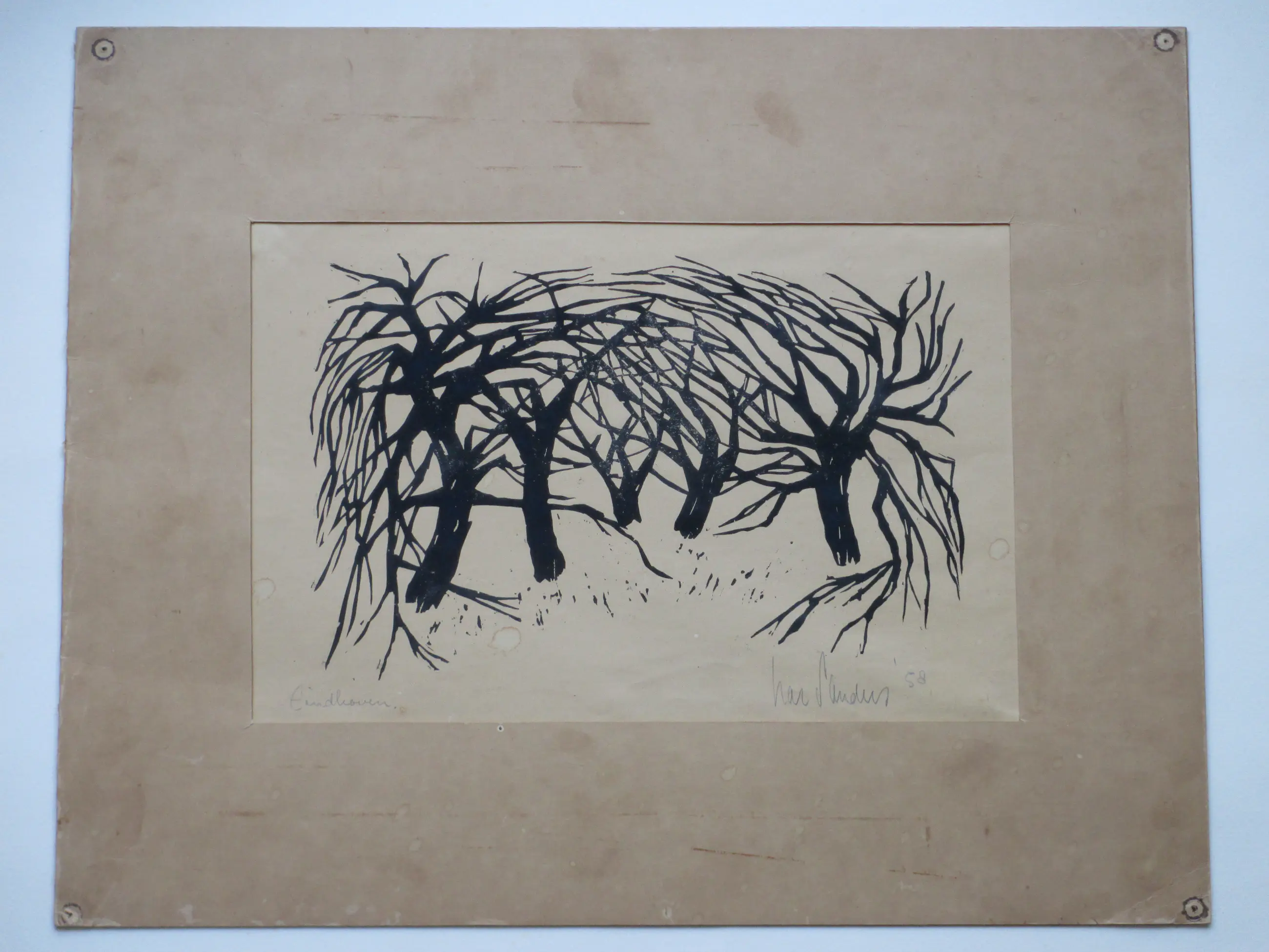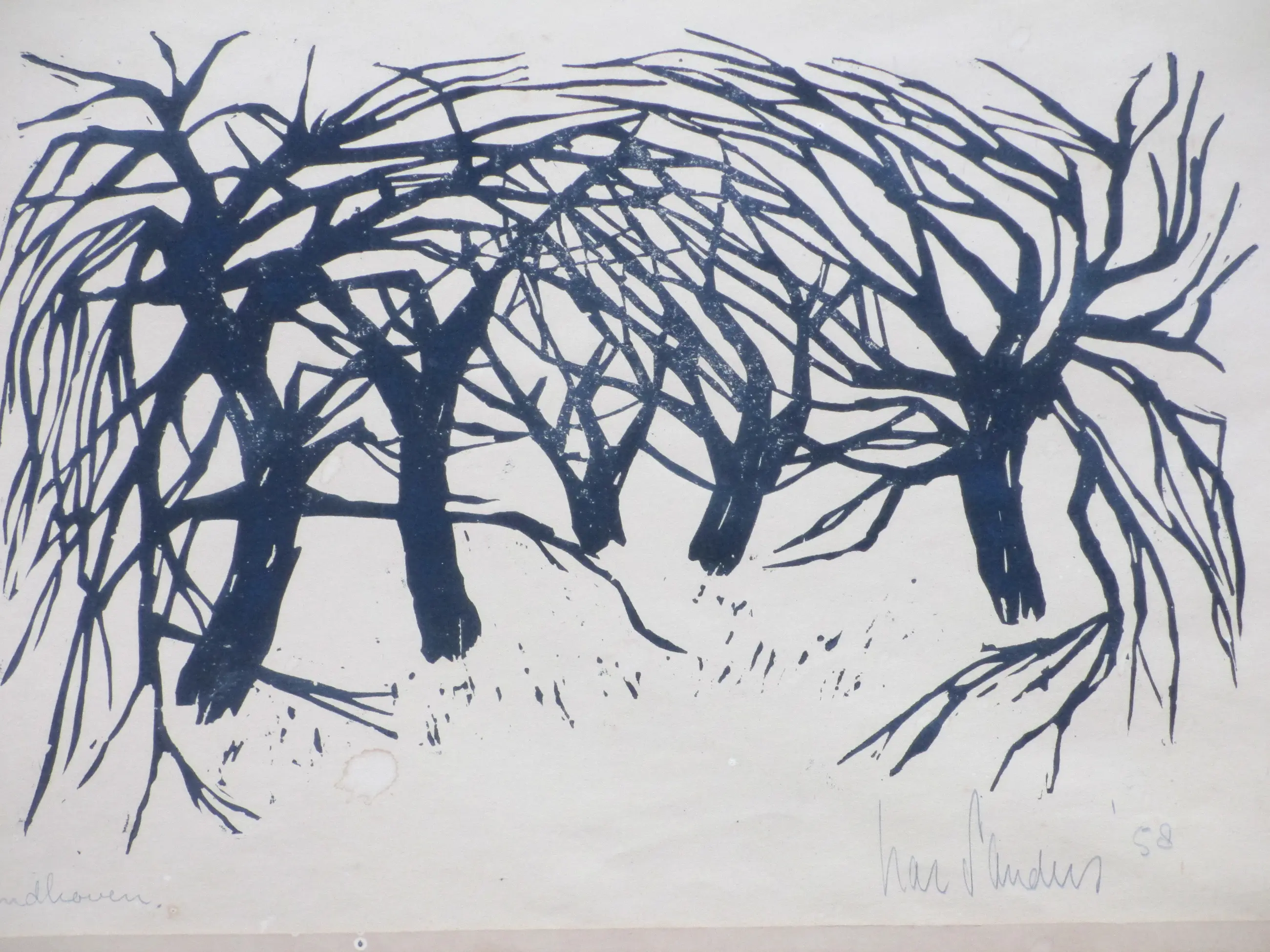 Linosnede door Har Sanders Voorstelling van een landschap met bomen Werk losbladig onder passe-partout, beeldmaat 20x32, p.p.maat 40x49 Gesigneerd en gedateerd in potlood r.o.: 'Har Sanders '58' Annotatie in potlood l.o.: 'Eindhoven' Authenticiteit volledig gegarandeerd
