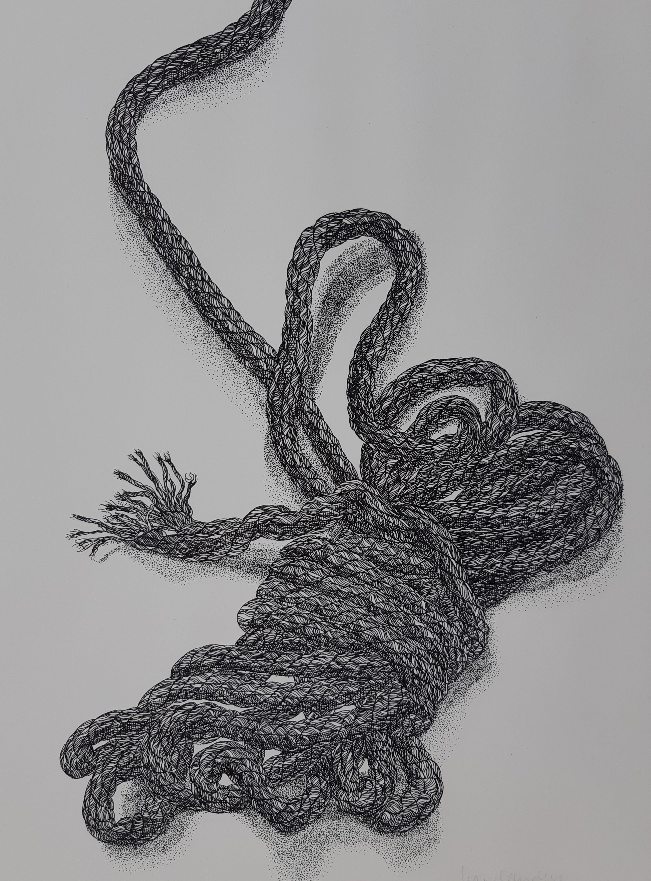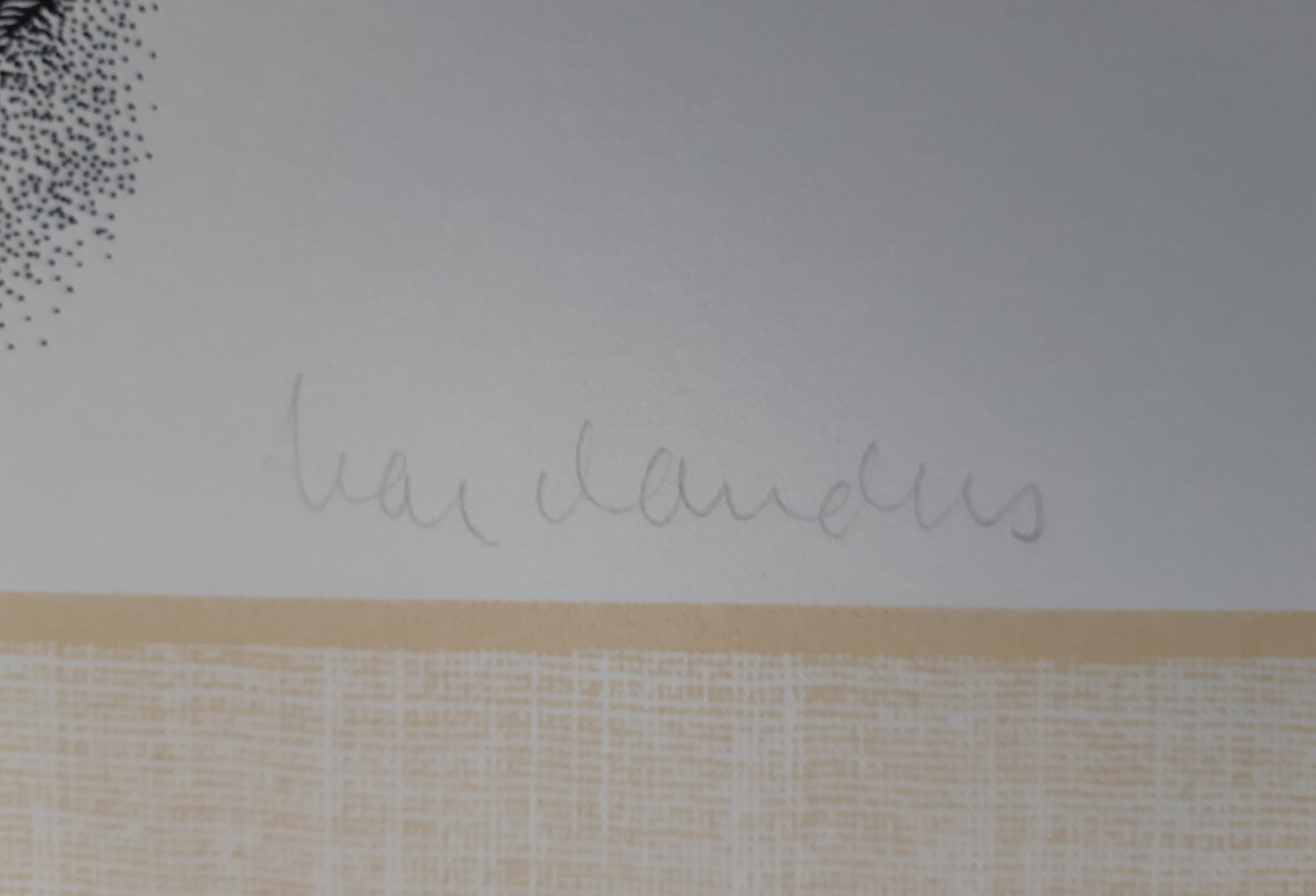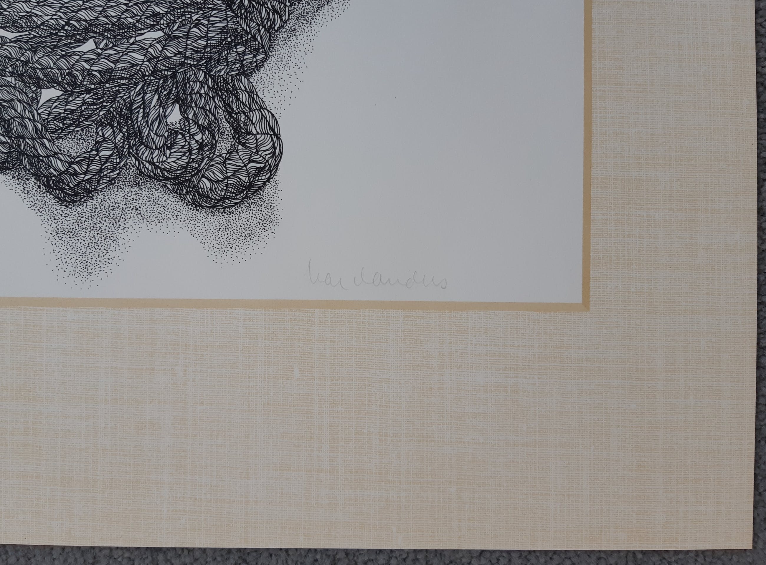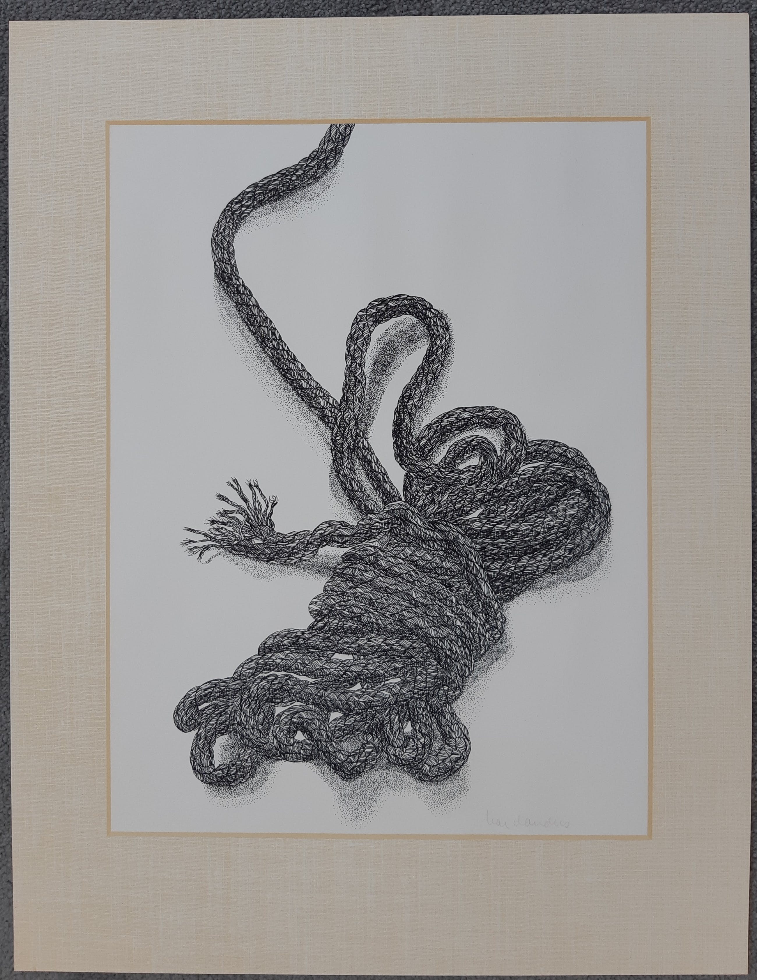Fraaie zeefdruk van Har Sanders, getiteld Striktouw. Opvallend is dat de zeefdruk achter een passe partout lijkt te zitten. Dit maakt echter deel uit van het gedrukte kunstwerk. Het werk is met potlood gesigneerd en is in uitstekende conditie. Dit werk is niet uitgegeven in de AH-reeks Het dagelijks leven, er is geen AH-blindstempel.
