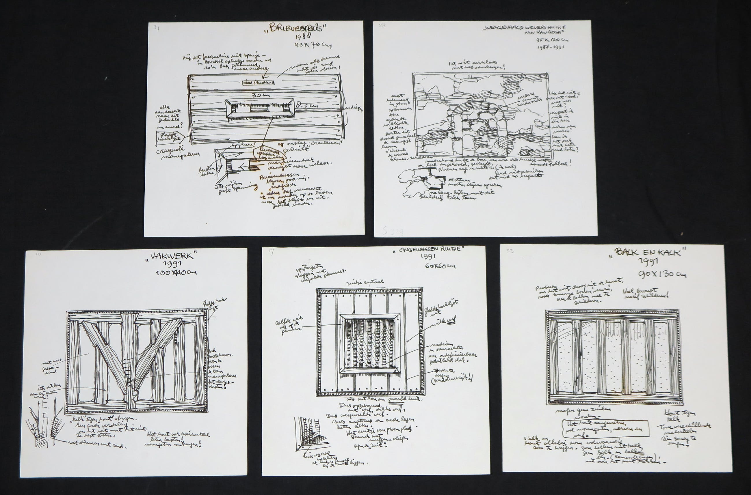 | Werken zijn in goede staat en bevatten allemaal een originele pentekening op de achterzijde. Bij het werk linksboven is de inkt van de achterzijde door het papier getrokken, waardoor de voorzijde wat vlekkerig oogt. Het werk in het midden op de onderste rij is niet gesigneerd. | |||