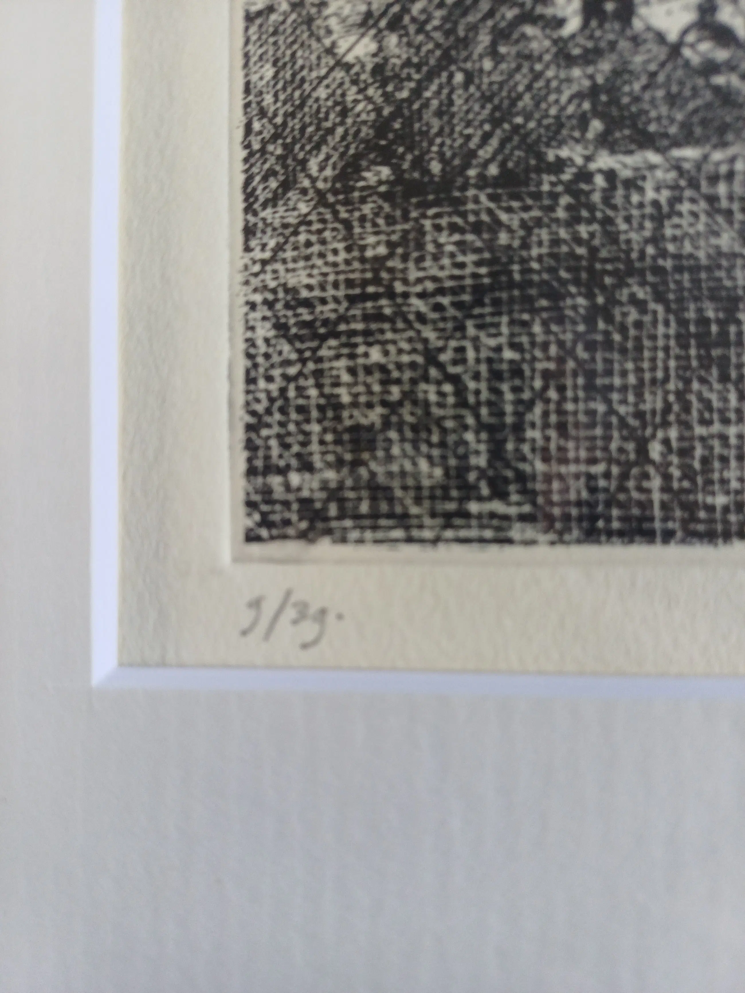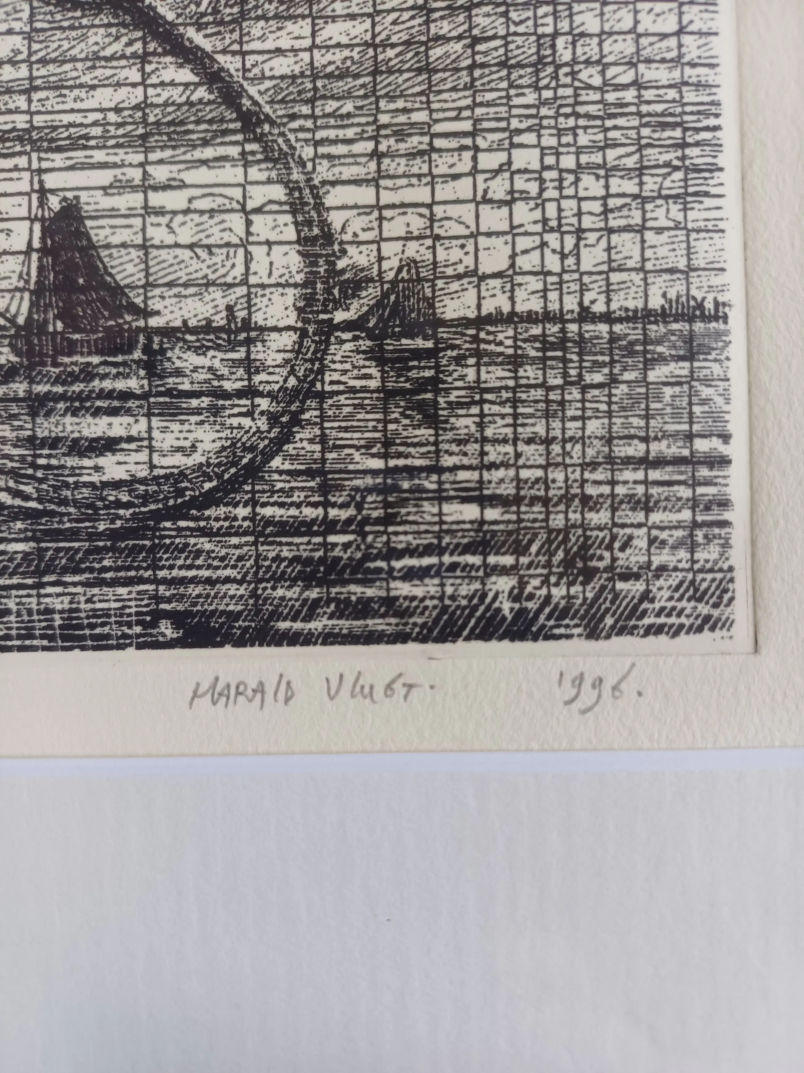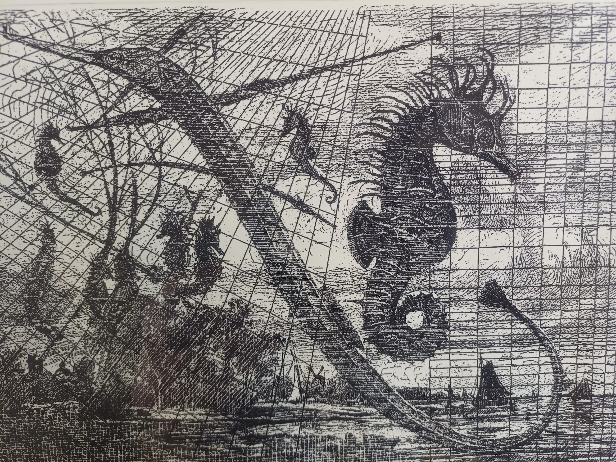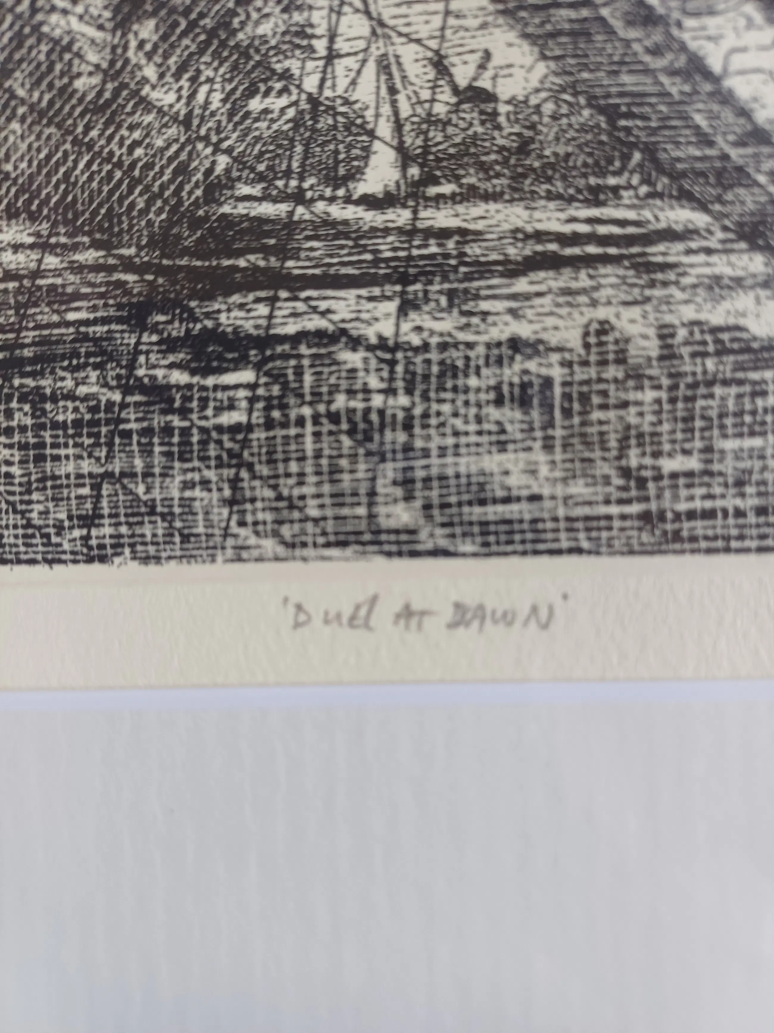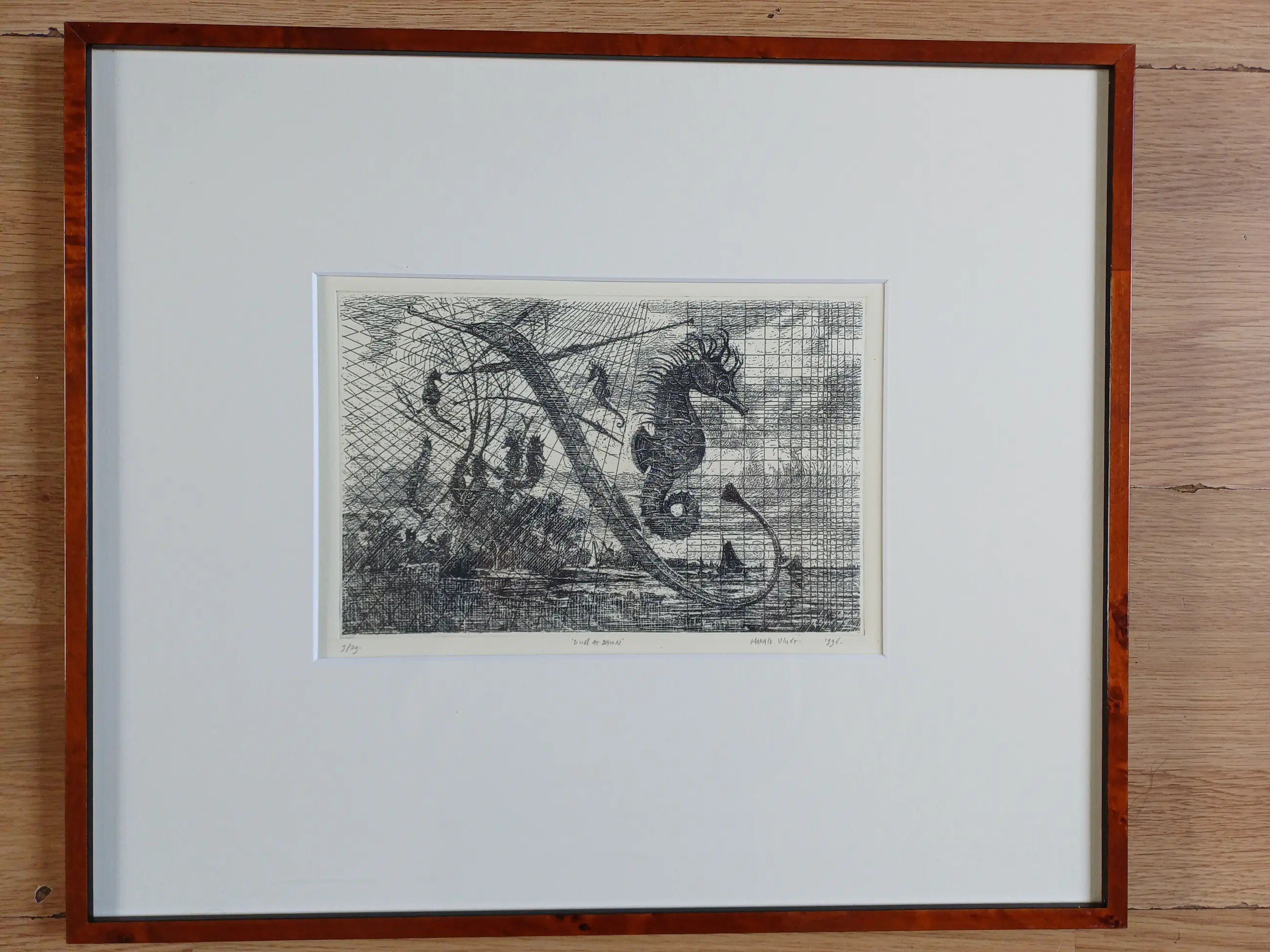Duel at Dawn, een ets van Harald Vlugt gemaakt in 1996 in een oplage van 39 stuks waarvan dit nummer 9 is. Een afbeelding met zeepaardjes en bootjes op het water. Ingelijst in passe-partout achter glas.