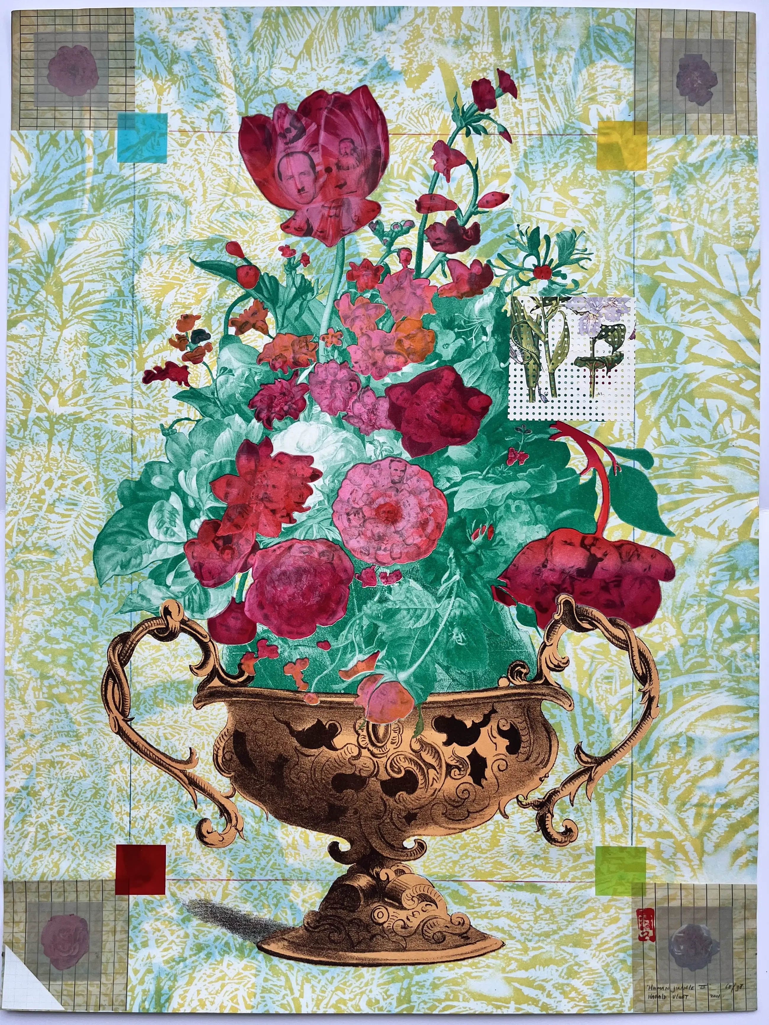 Fraaie zeefdruk met collage technieken van Harold Vlugt. Gesigneerd door de kunstenaar.