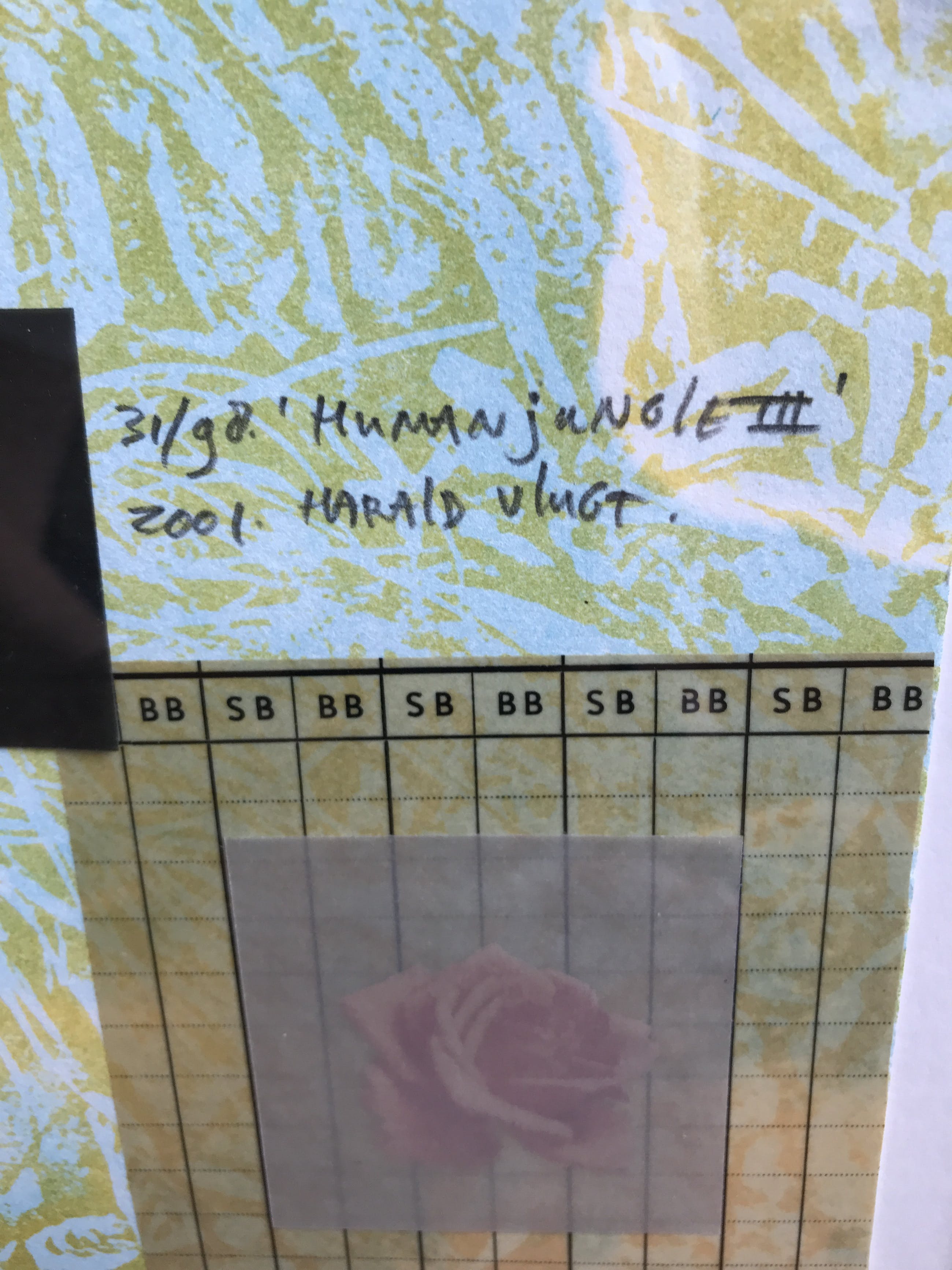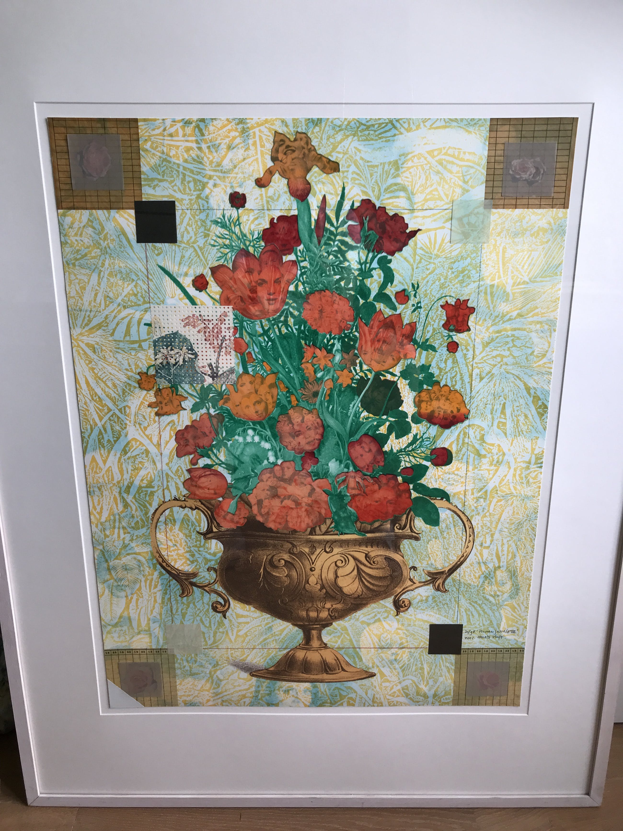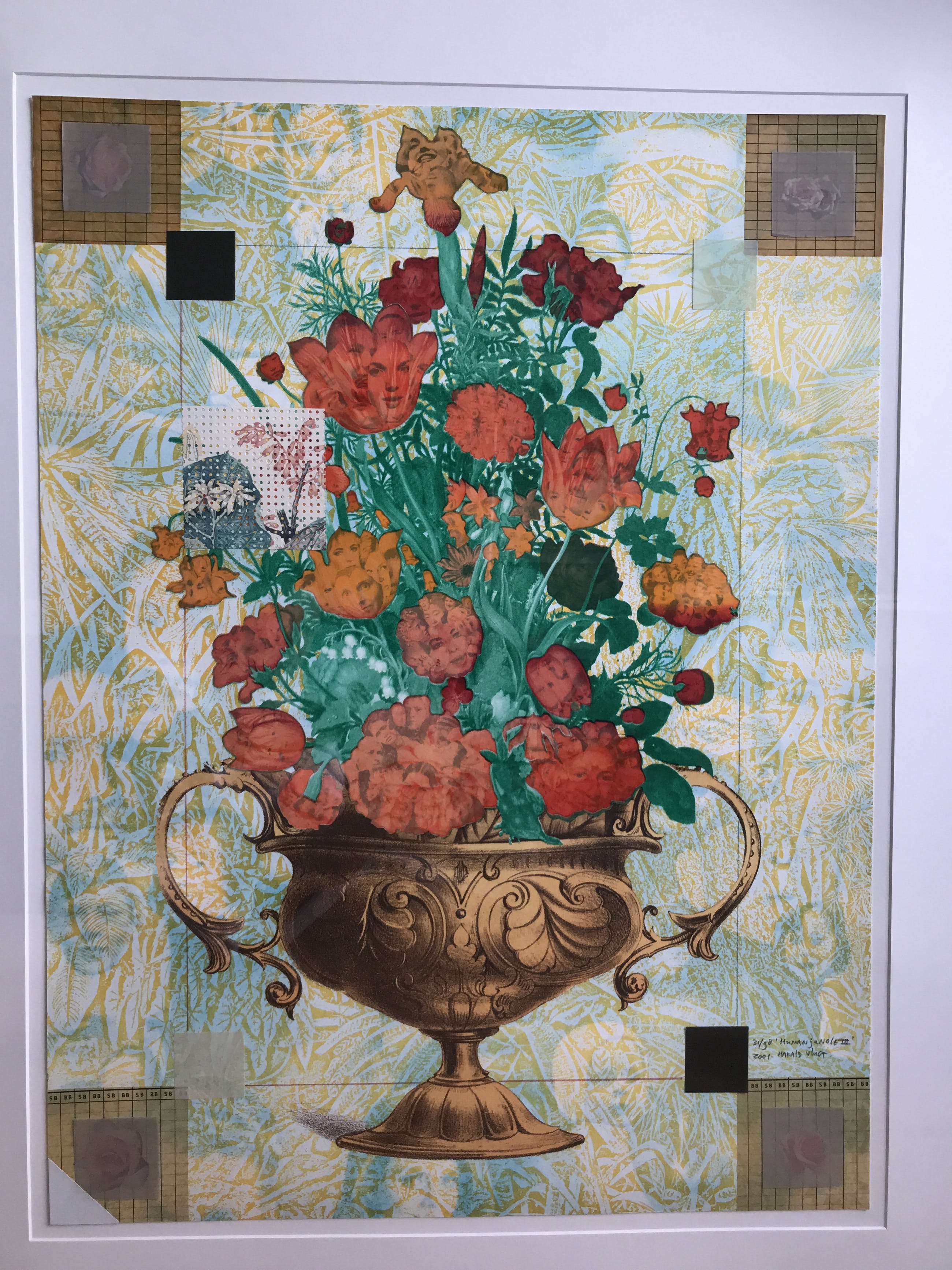 De menselijke Jungle III toont een weelderig boeket. De rode tulpen en andere rode en oranje bloemen staan in volle bloei en zijn nonchalant gerangschikt in een koperkleurige pot. Hier wil Vlugt het mannelijke element in beeld brengen. Zorgvuldige observatie onthult portretten van mannen verborgen in de verschillende bloemblaadjes, terwijl vrouwen en kinderen de achtergrond vullen.