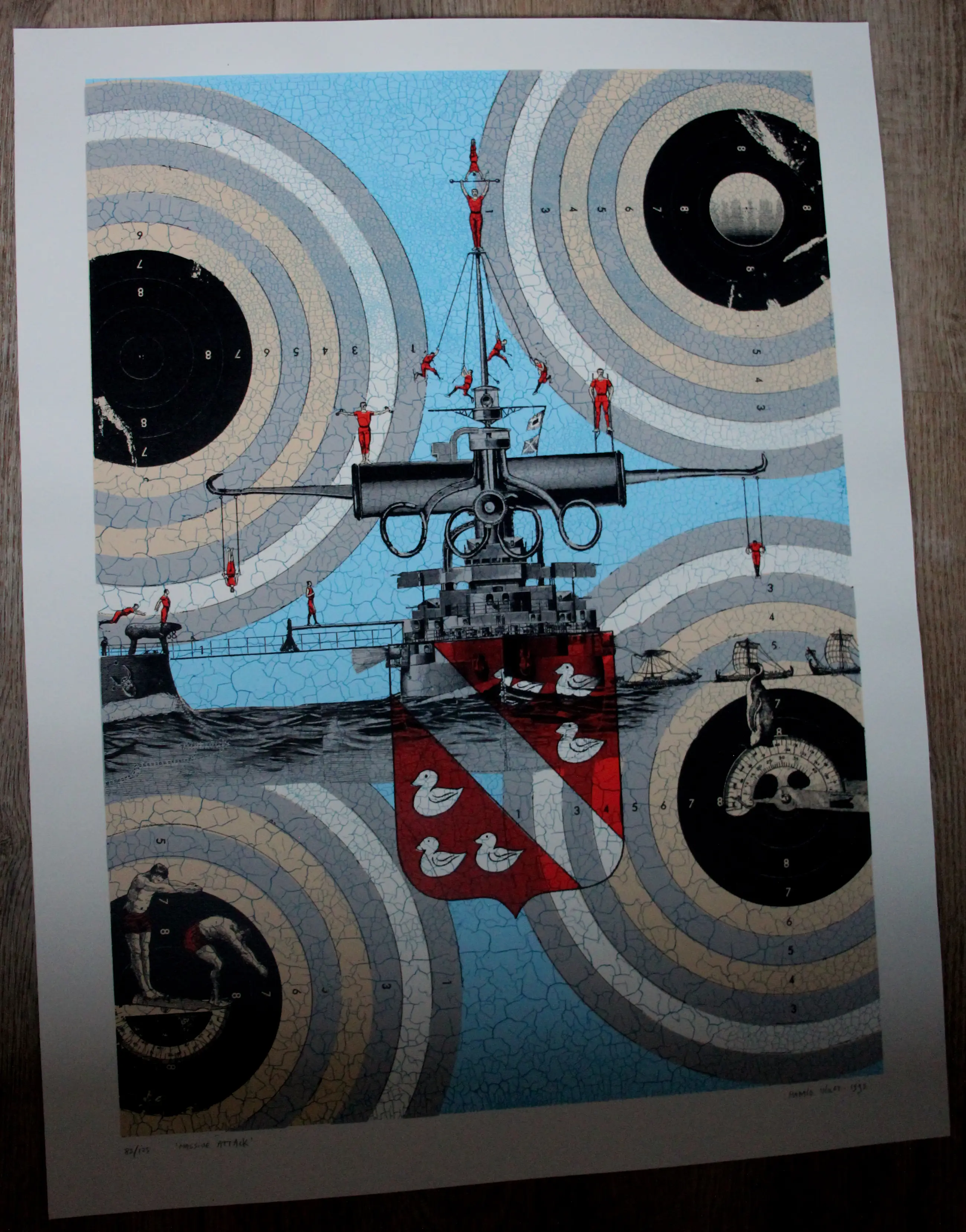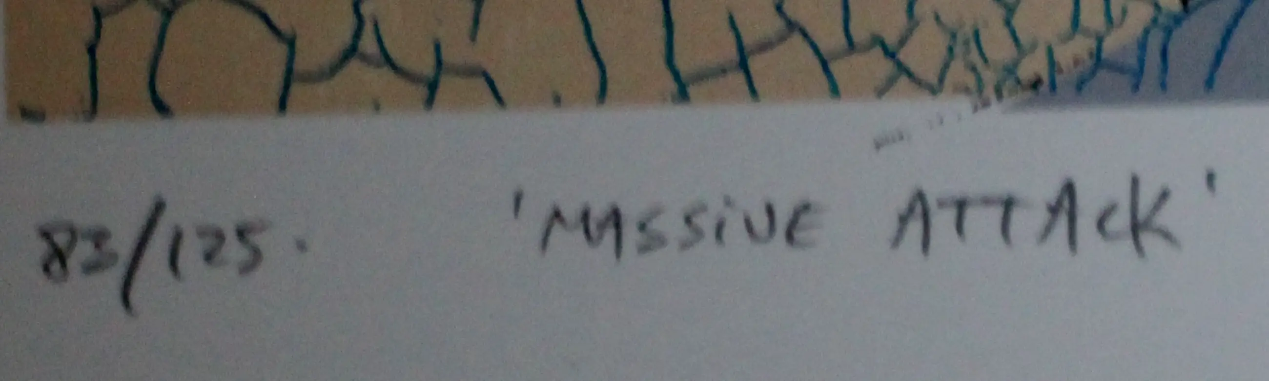 Zeefdruk van Harald Vlugt. Titel: Massive Attack. Jaar: 1993. Oplage: 83/125. Afmetingen blad: H66 x b50cm. Afmetingen voorstelling: H58 x b42cm. Het werk is rechts onderaan, gesigneerd door de kunstenaar. De authenticiteit van dit werk wordt volledig gegarandeerd. Een certificaat van echtheid kan, op aanvraag, worden gemaild.