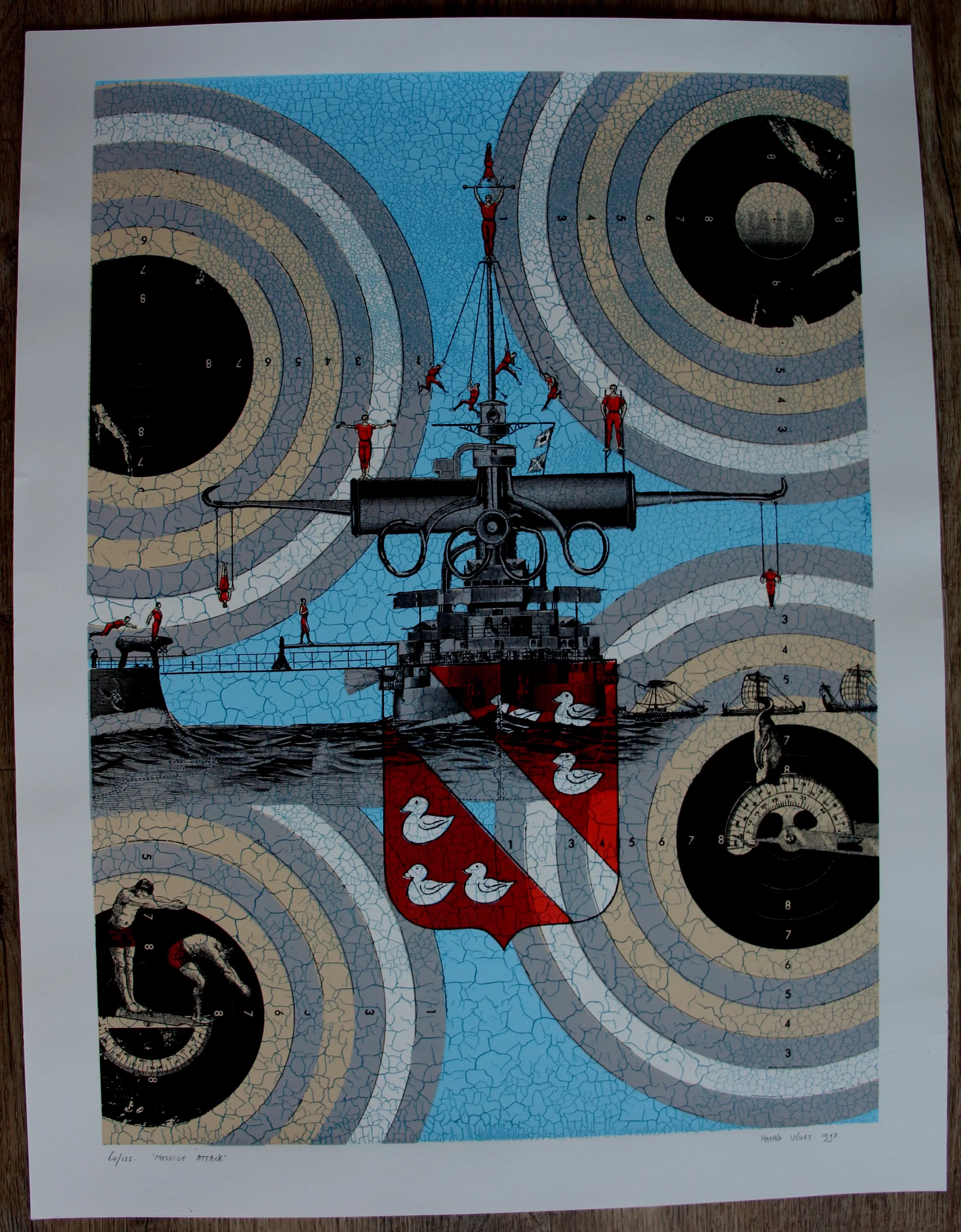Zeefdruk van Harald Vlugt. Titel: 'Massive Attack'. Jaar: 1993. Oplage: /125. Afmetingen blad: H65.5 x b50cm. Afmetingen voorstelling: H58 x b42cm. Het werk is rechts onderaan, gesigneerd door de kunstenaar. De authenticiteit van dit werk wordt volledig gegarandeerd. Een certificaat van echtheid kan, op aanvraag, worden gemaild.